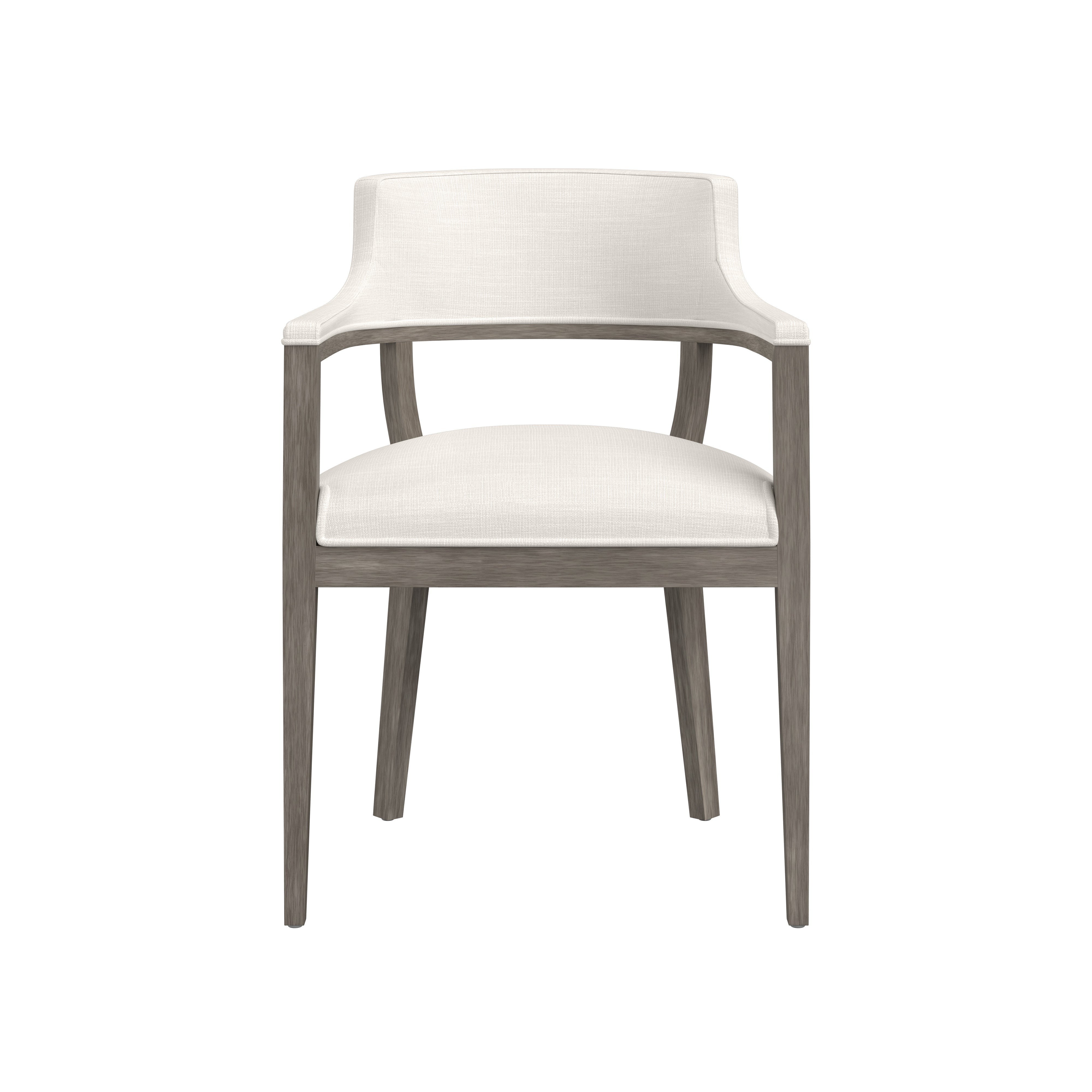 A mid-century modern dining armchair chair with an open back design. Stocked in linoso ivory performance fabric with an exposed ash grey solid oak wood frame. Performance fabric is moisture repellent, durable and easy to clean. As wood is an organic, porous material, these pieces will contain natural variation of texture and may also exhibit fine indentations and cracks. Wood pieces will also display a disparity of colour and grain, and visible knots and burls that add to the character of each piece.