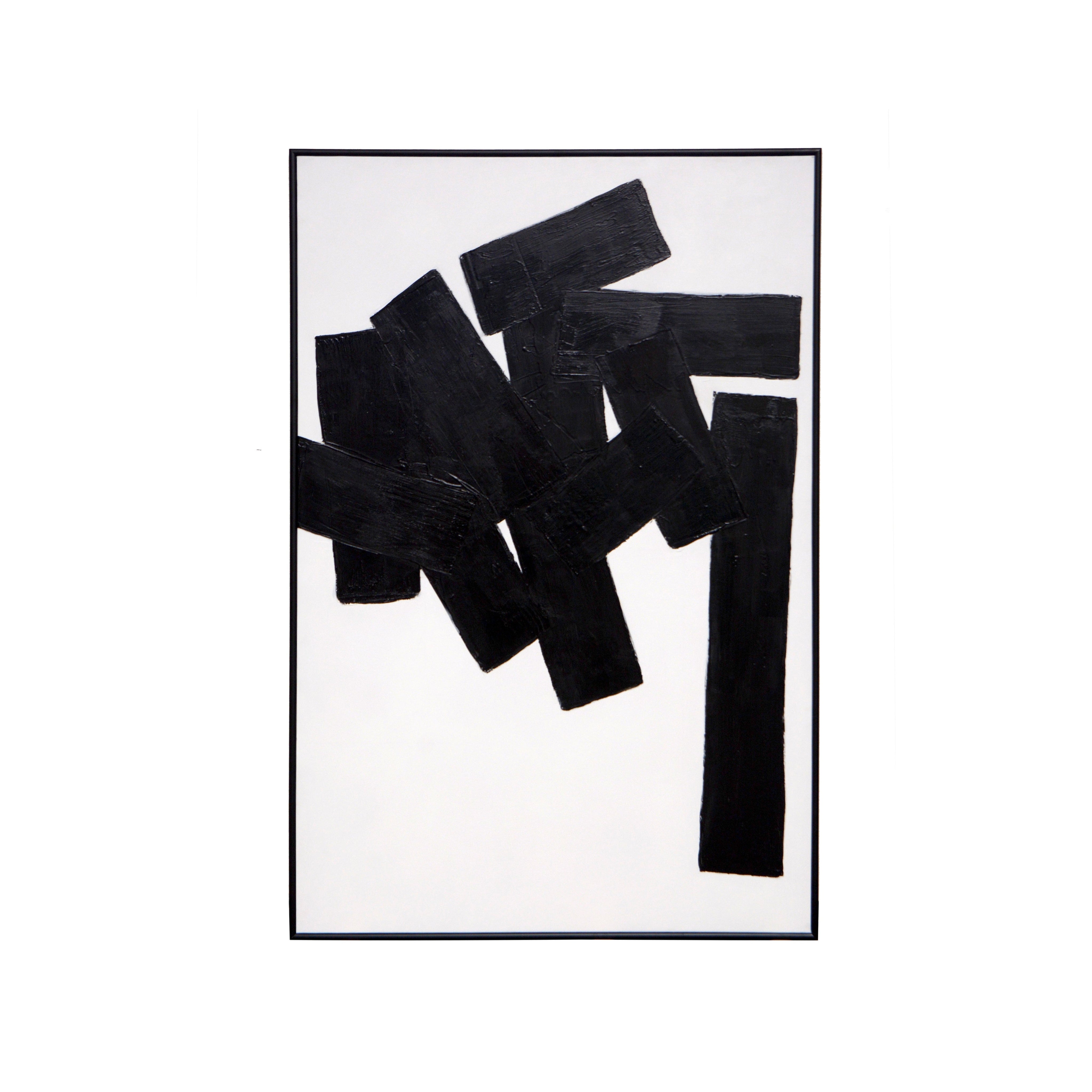 This contrasting painting features black rectangular blocks stacked in varying configurations, offering visual movement and intrigue. Features a black finished wood floater frame. Each artwork is hand-painted and will feature slight variations that make every piece unique.