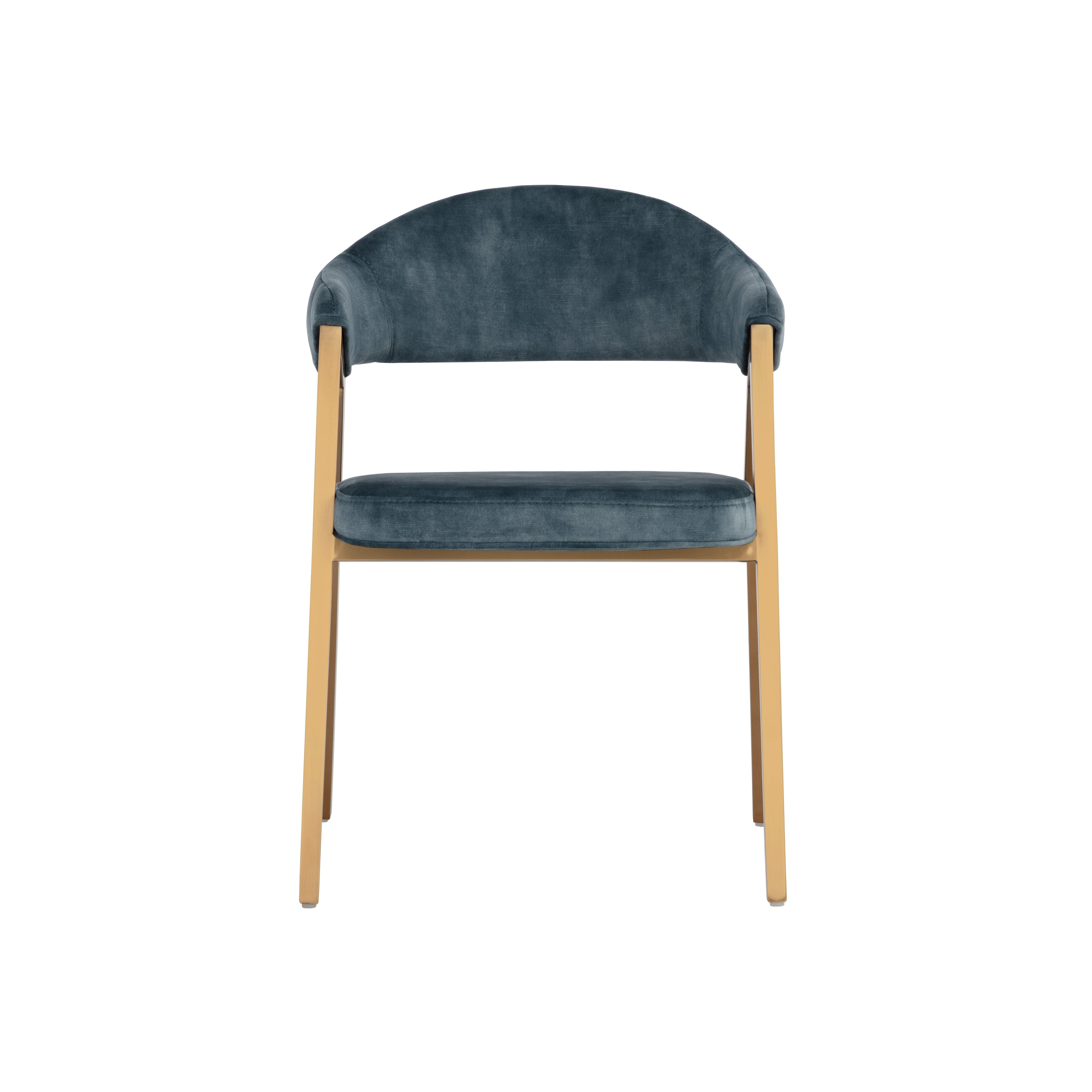 This modern chair will charm guests. Features a curved seatback with channel tufting on the exterior in nono petrol fabric, and is complemented with a brushed gold stainless steel frame.