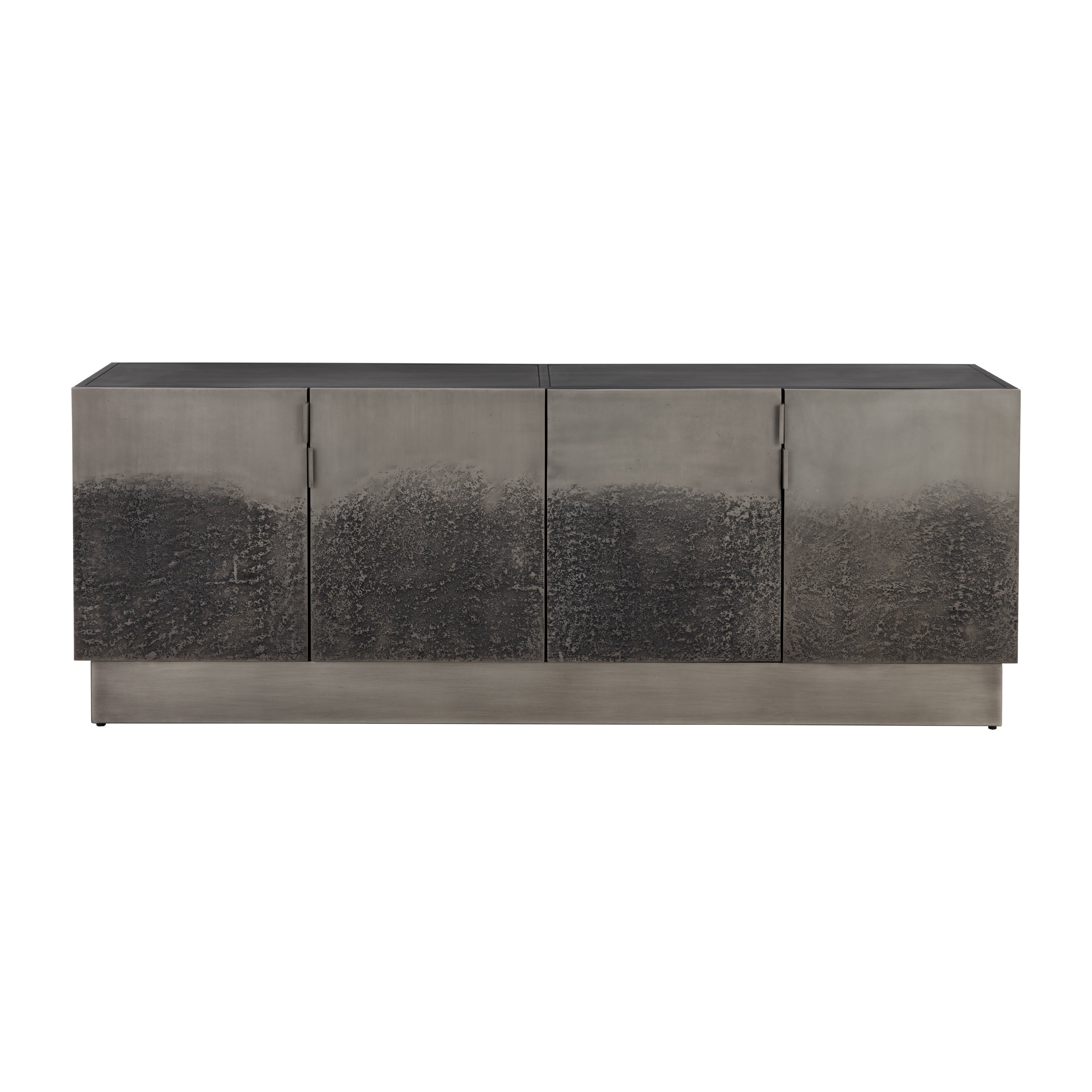 Carefully crafted, the Caddo Sideboard balances practicality and style. Four textured antique nickel aluminum doors reveal ample storage for all your essentials. A black powder-coated iron frame finishes off the look. Made in India. With refined craftsmanship, this design was brought to life by skilled local artisans. Due to the nature of handcraftsmanship, unique imperfections such as fissures, markings and variations in colour and shape are welcomed and appreciated characteristics for a truly one-of-a-kind piece.
