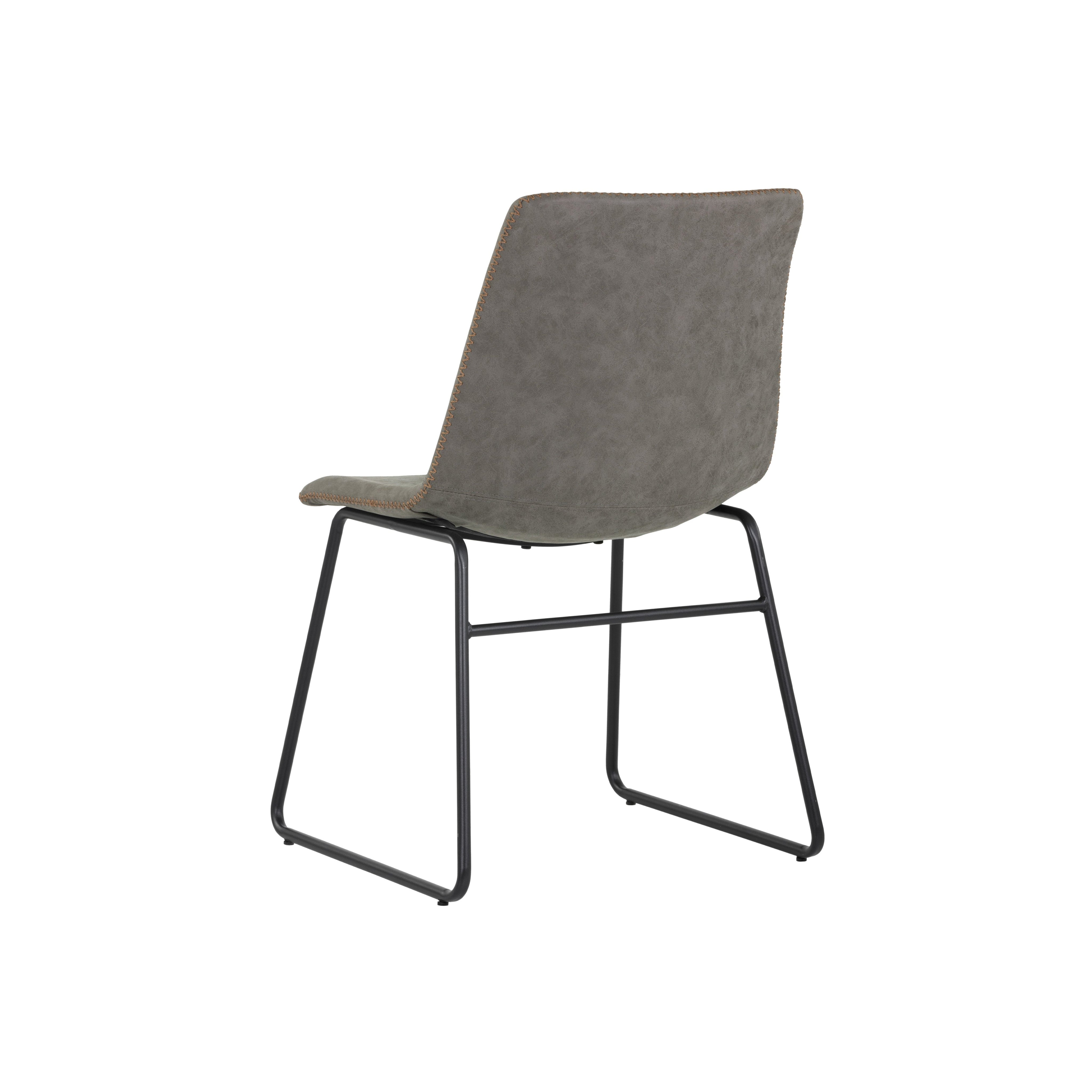 A comfortable and compact dining chair from. Features a simple, mid-century silhouette and finished with a brushed black steel frame. Stocked in antique grey faux leather.