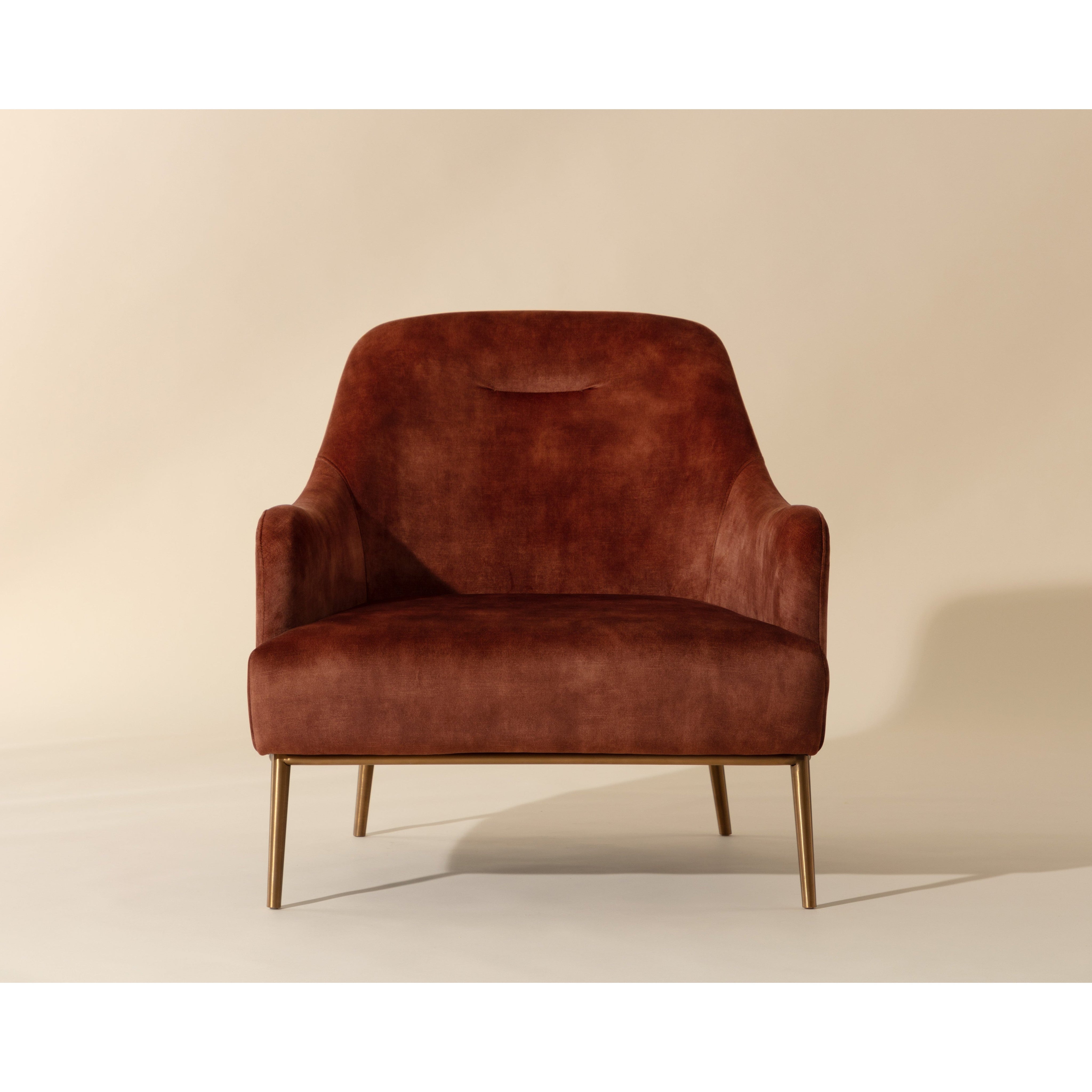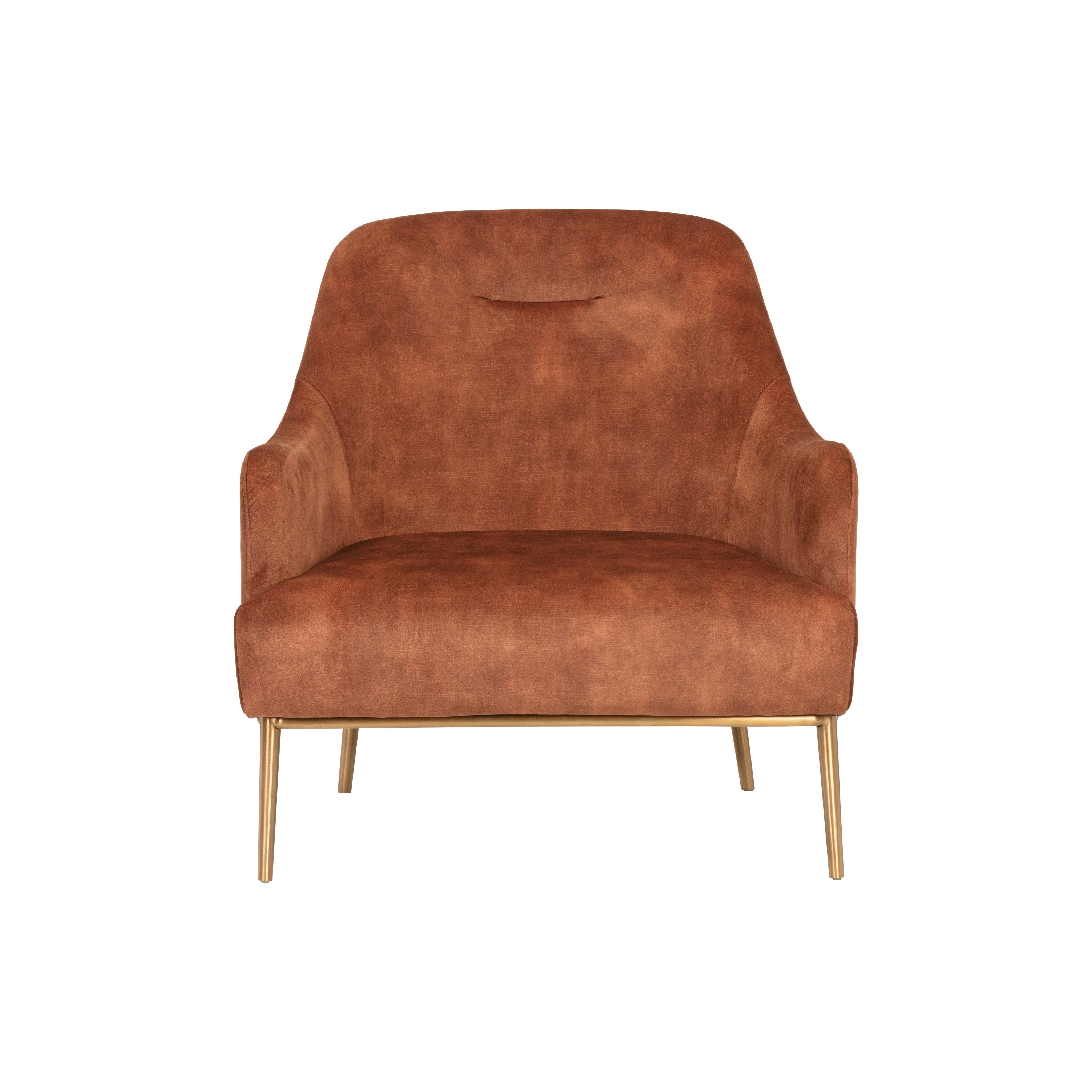 An elegant lounge chair with mid-century modern influence. Designed with a comfortable, single tufted seat and sloping arms. Stocked in a beautiful, velvet-like nono petrol, rust or shitake fabric. Nono fabric features a natural variation of light and dark sections. An exposed gold stainless steel frame and legs complete the look.