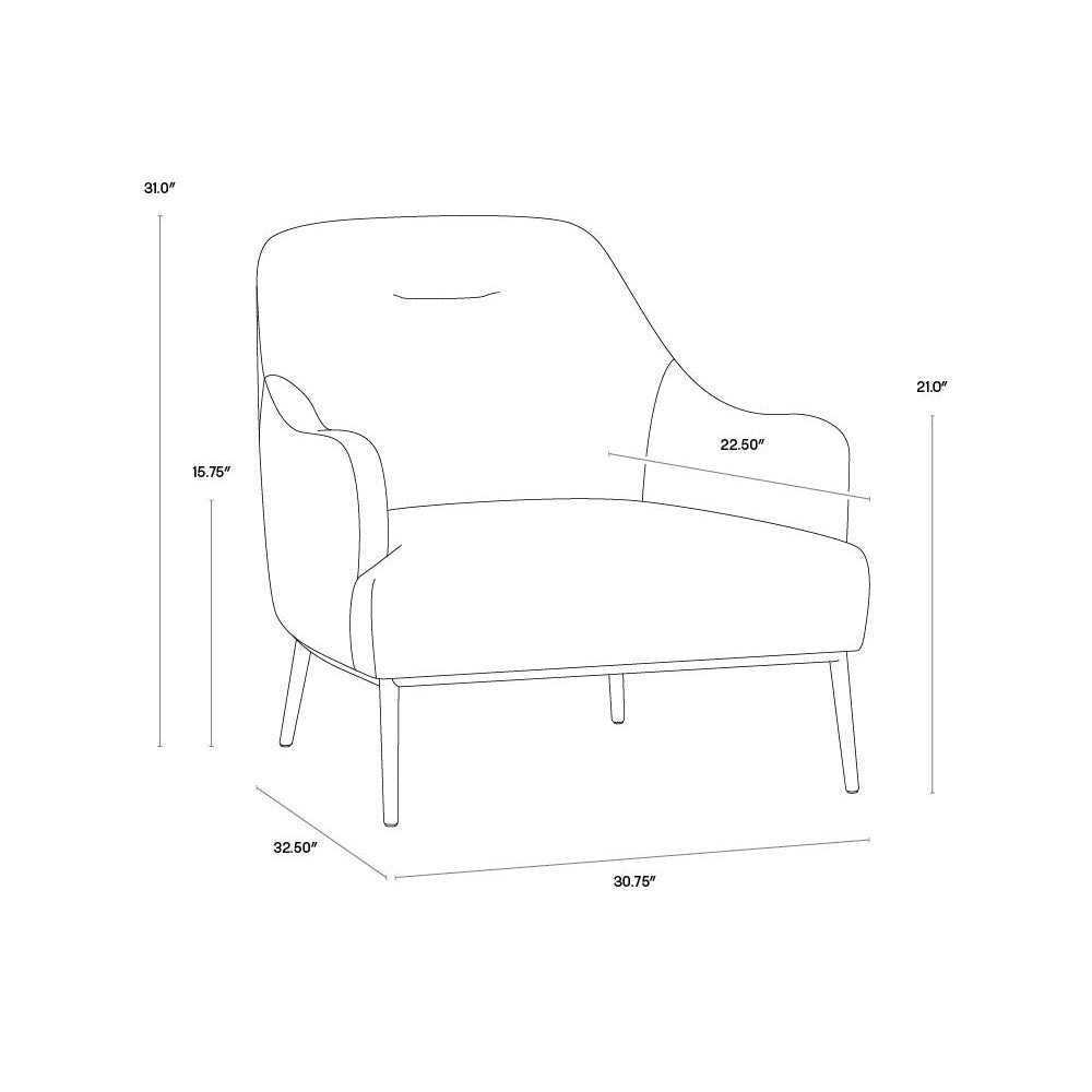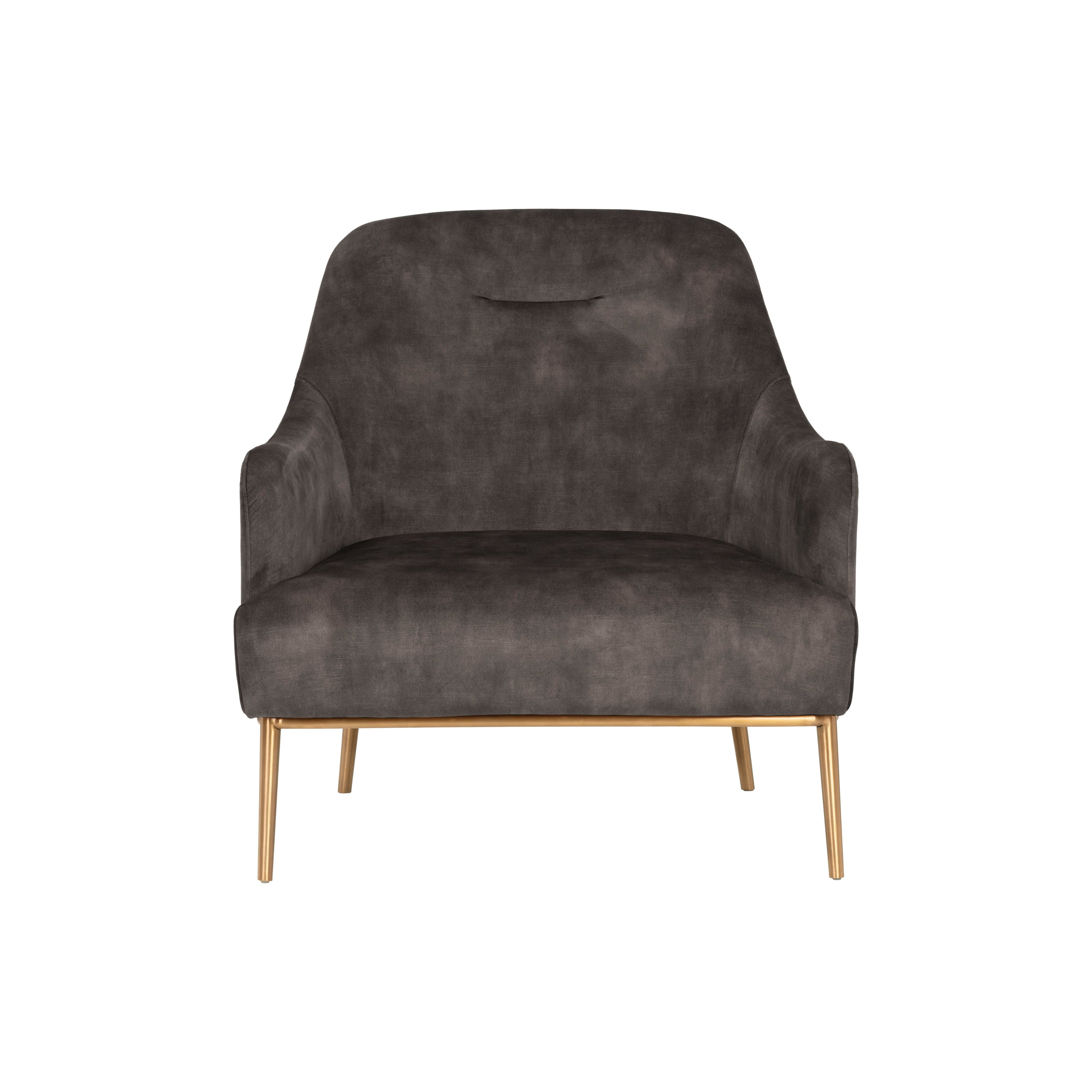 An elegant lounge chair with mid-century modern influence. Designed with a comfortable, single tufted seat and sloping arms. Stocked in a beautiful, velvet-like nono petrol, rust or shitake fabric. Nono fabric features a natural variation of light and dark sections. An exposed gold stainless steel frame and legs complete the look.