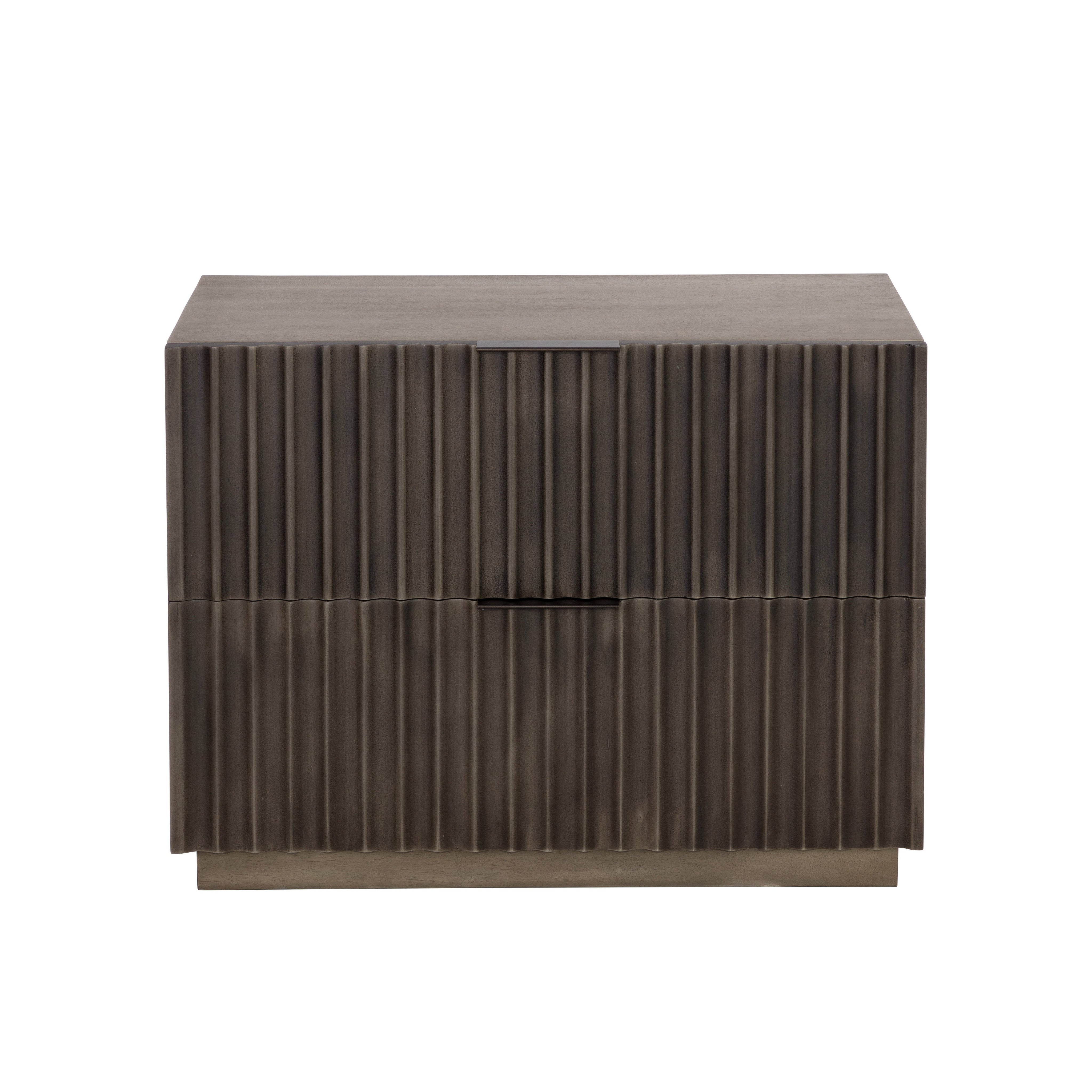 This bold nightstand will command attention in any bedroom space. Features a taupe mango wood frame with dramatic sculpted details on the face of the two drawers. Antique bronze powder-coated aluminum handles complete the modern look. As wood is an organic, porous material, these pieces will contain natural variation of texture and may also exhibit fine indentations and cracks. Wood pieces will also display a disparity of colour and grain, and visible knots and burls that add to the character of each piece. Made in India. With refined craftsmanship, this design was brought to life by skilled local artisans. By nature, these materials develop unique imperfections such as fissures, markings and colour variations for a truly one-of-a-kind piece.