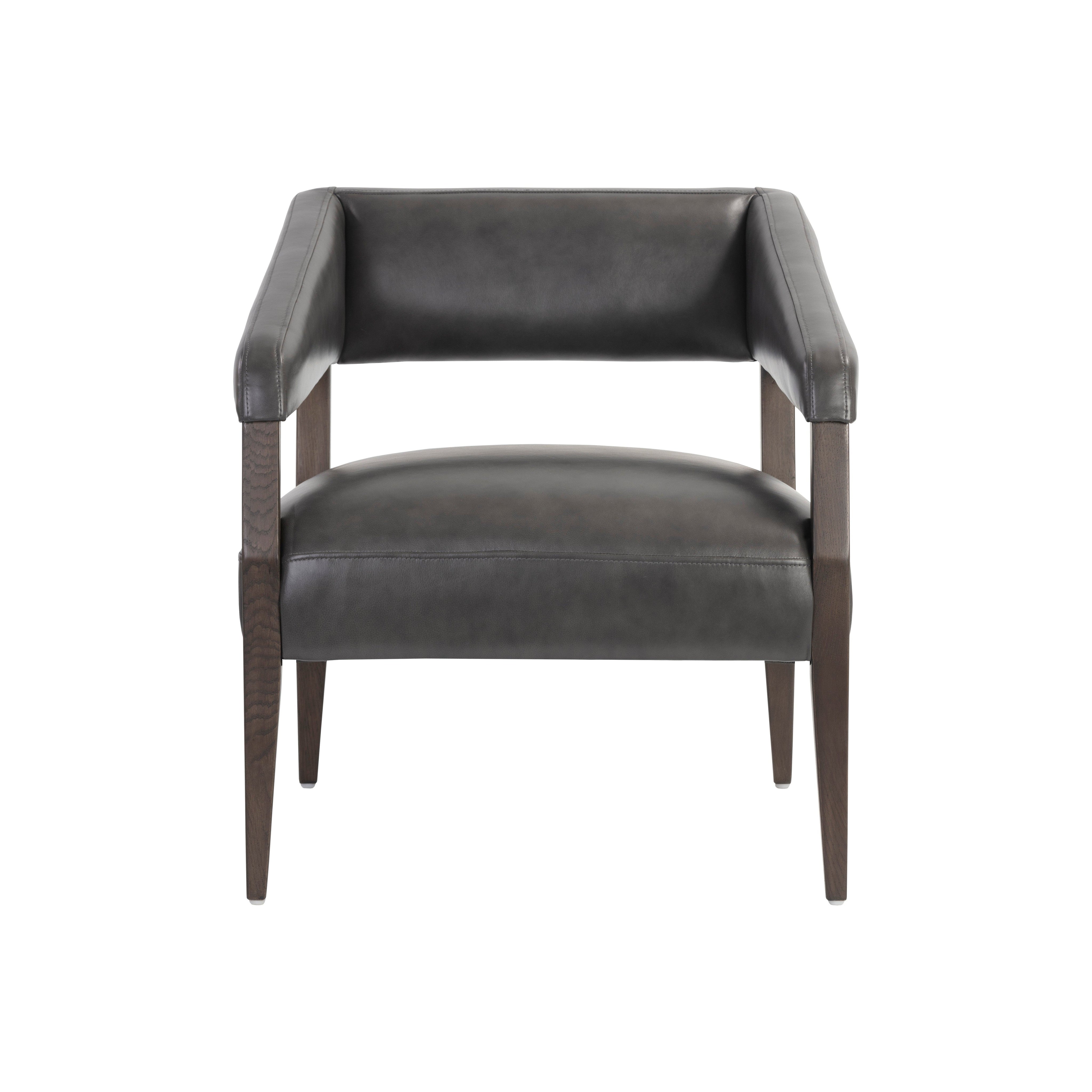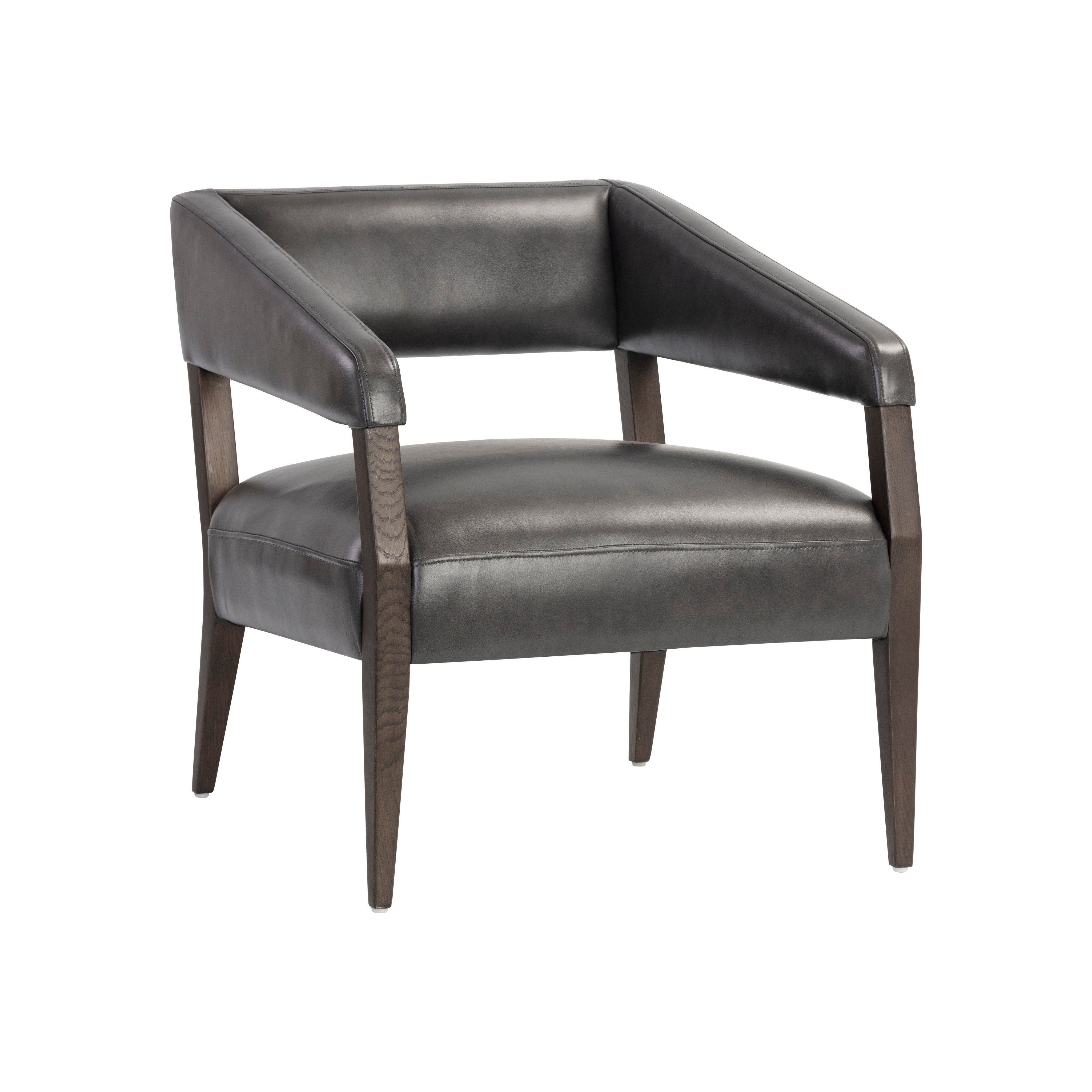 This handsome lounge chair features a streamlined silhouette with mid-century modern elements. Designed with an exposed brown oak wood frame. Available in supple brentwood charcoal leather.