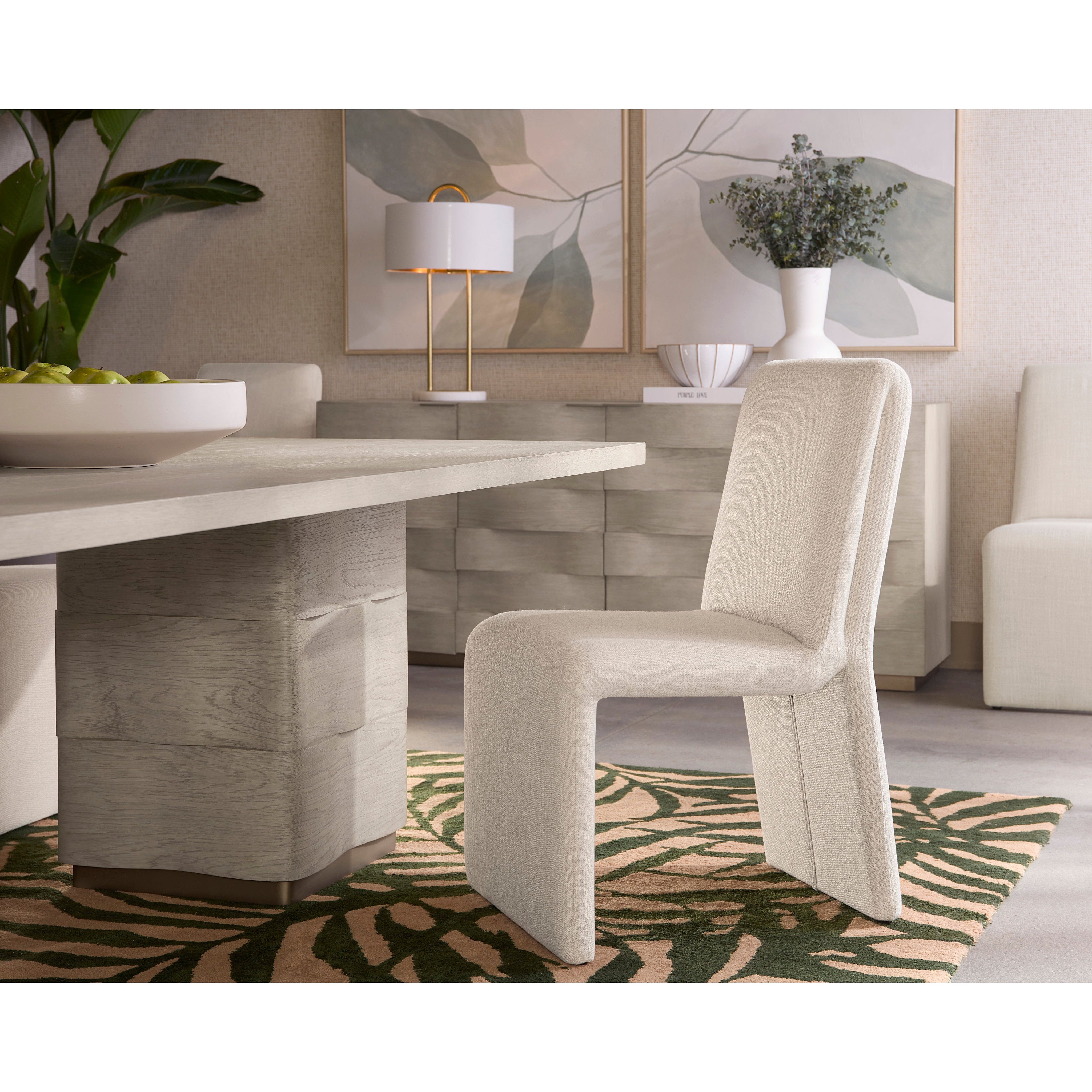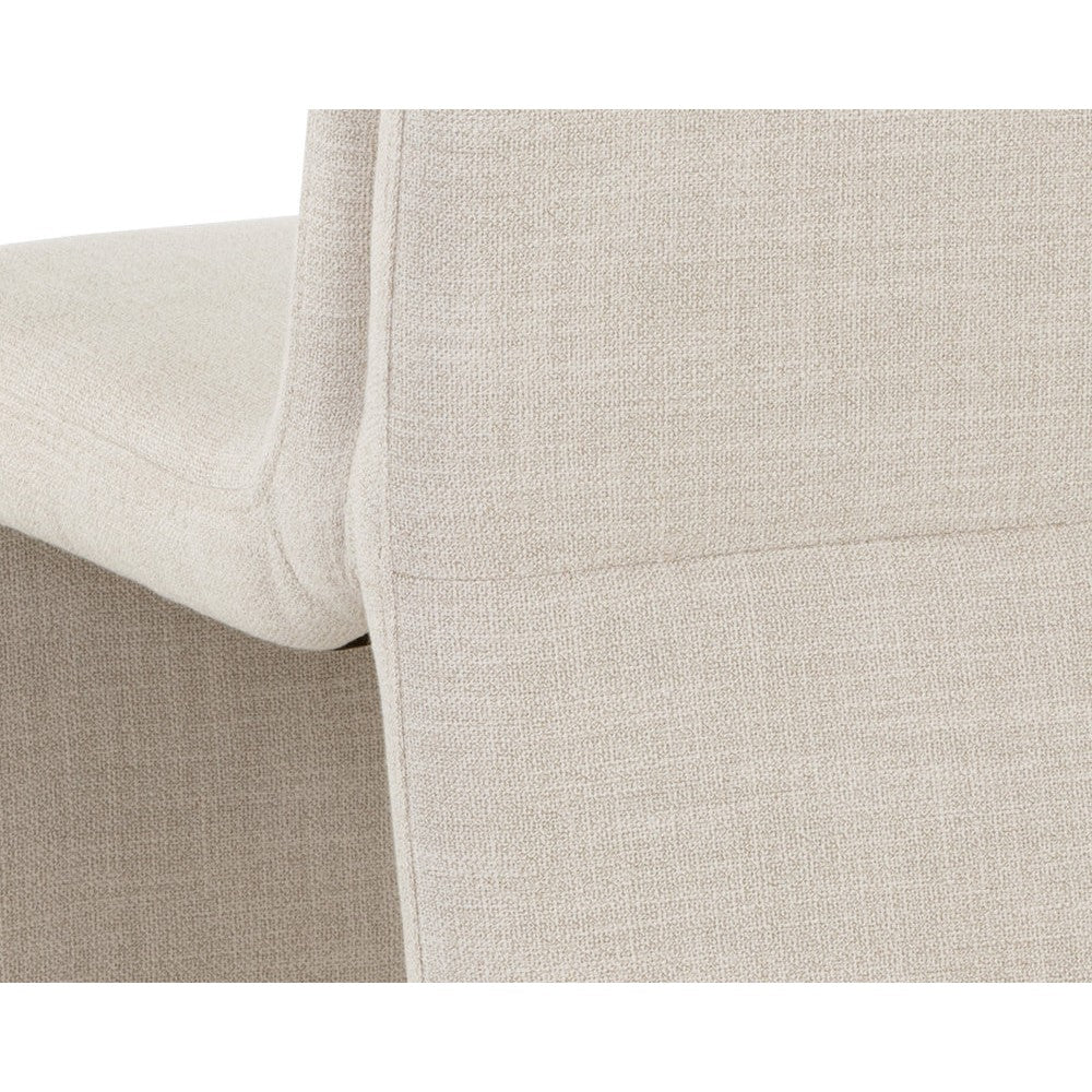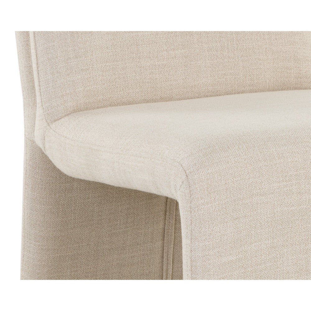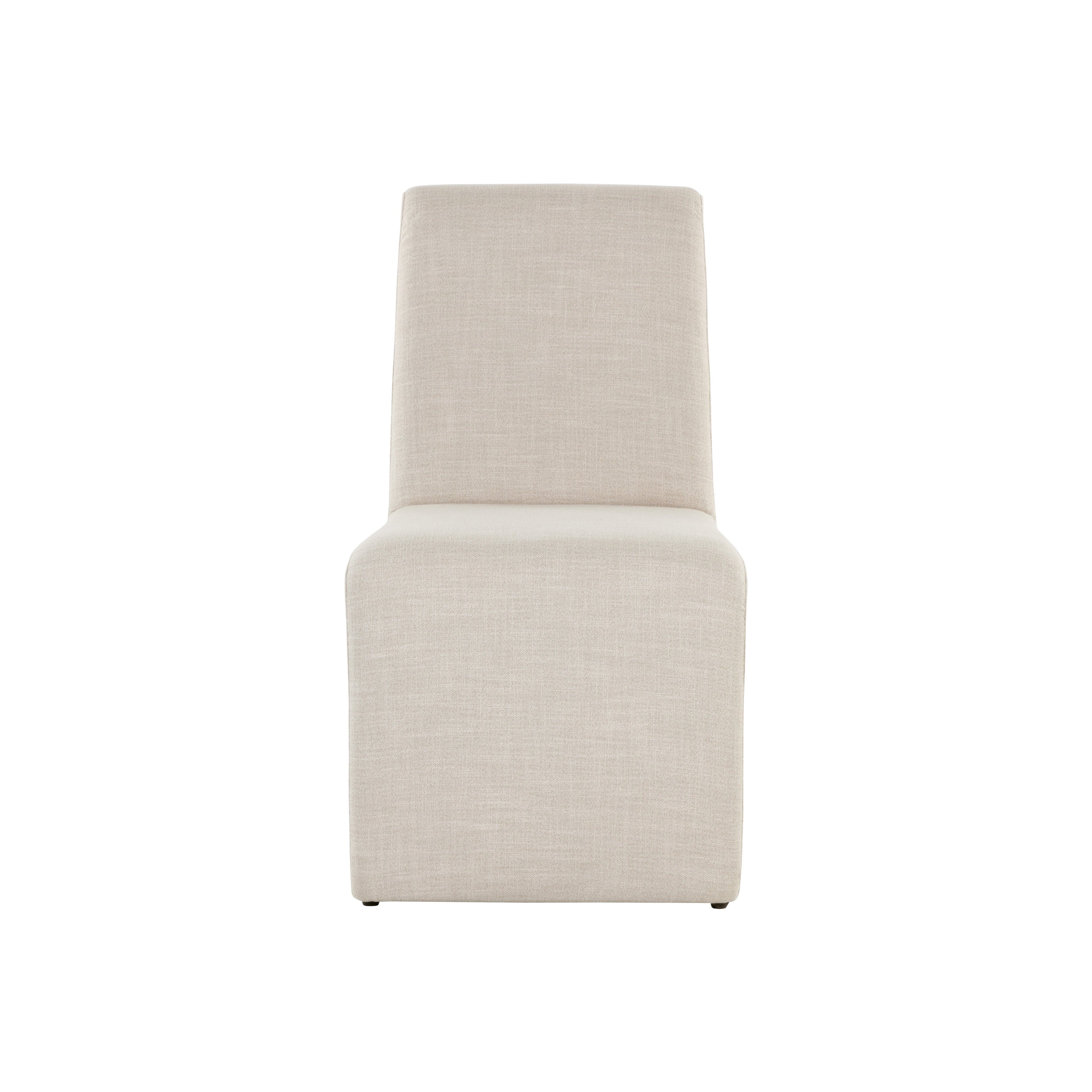 Create an alluring dining space with this modern dining chair that features an intriguing silhouette. Stocked in effie linen fabric with a fully upholstered wooden base.