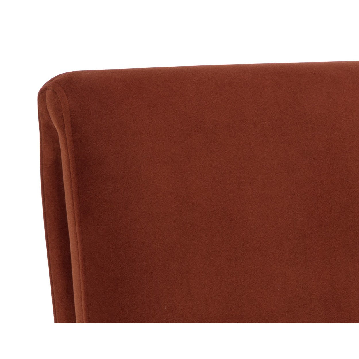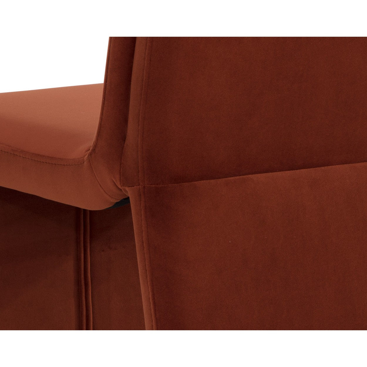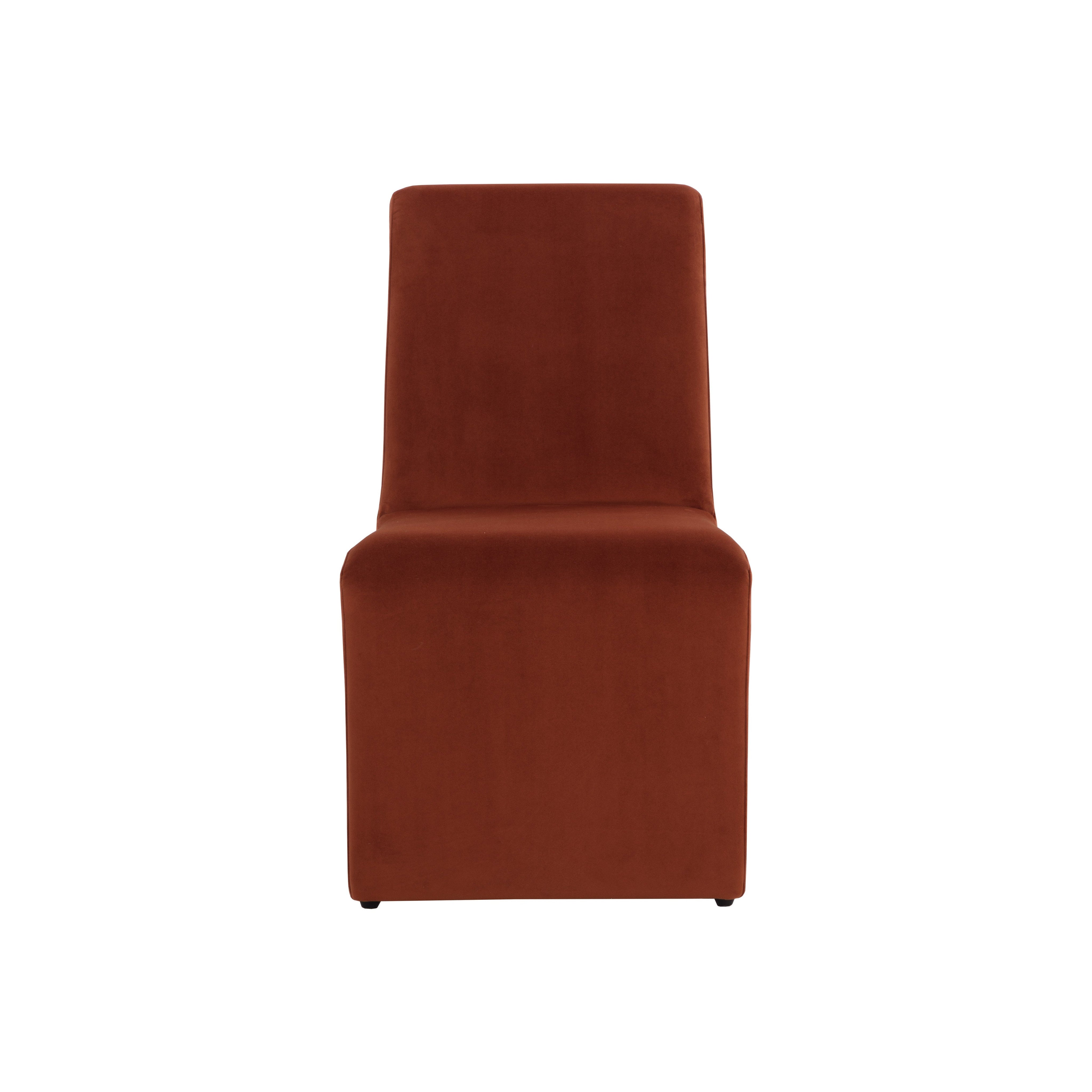 Create an alluring dining space with this modern dining chair that features an intriguing silhouette. Stocked in meg rust fabric with a fully upholstered wooden base.