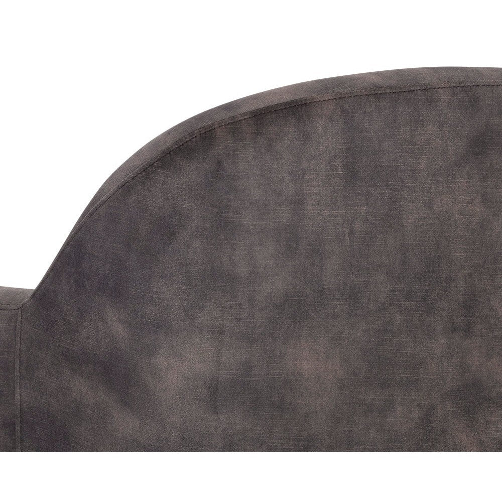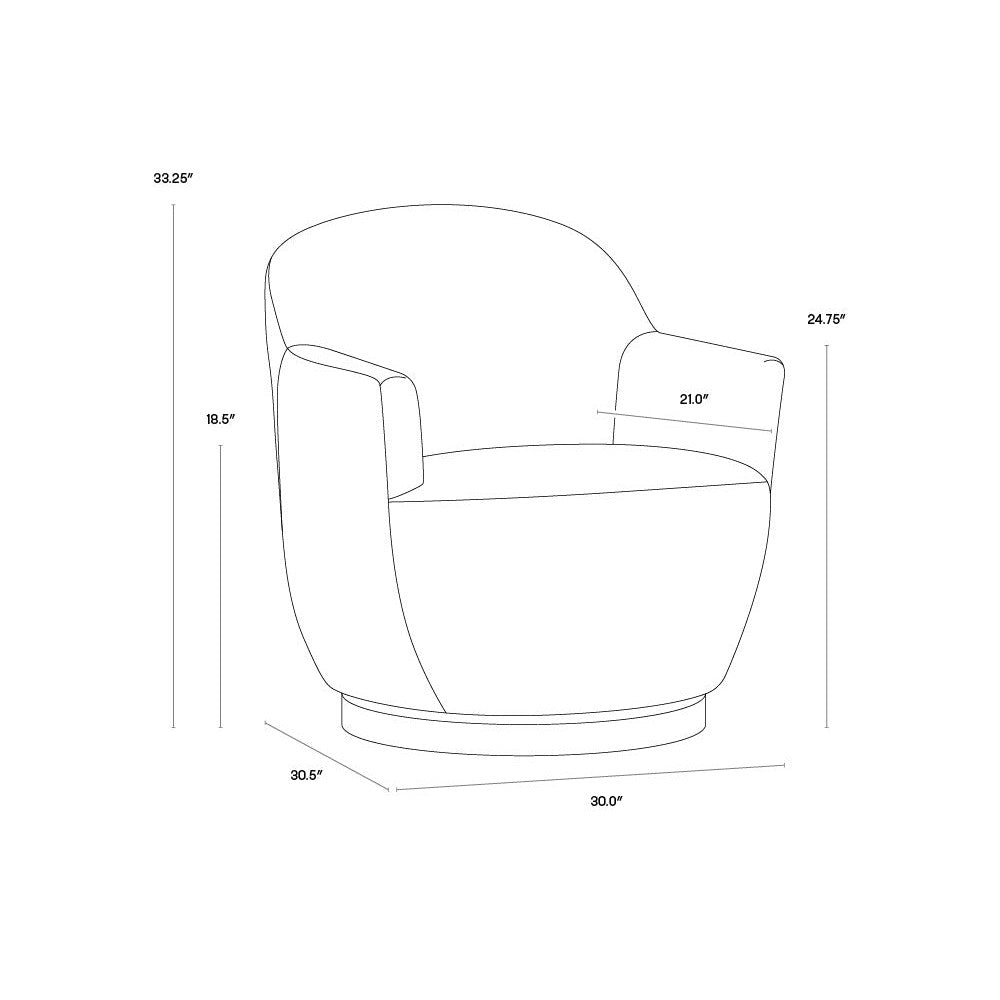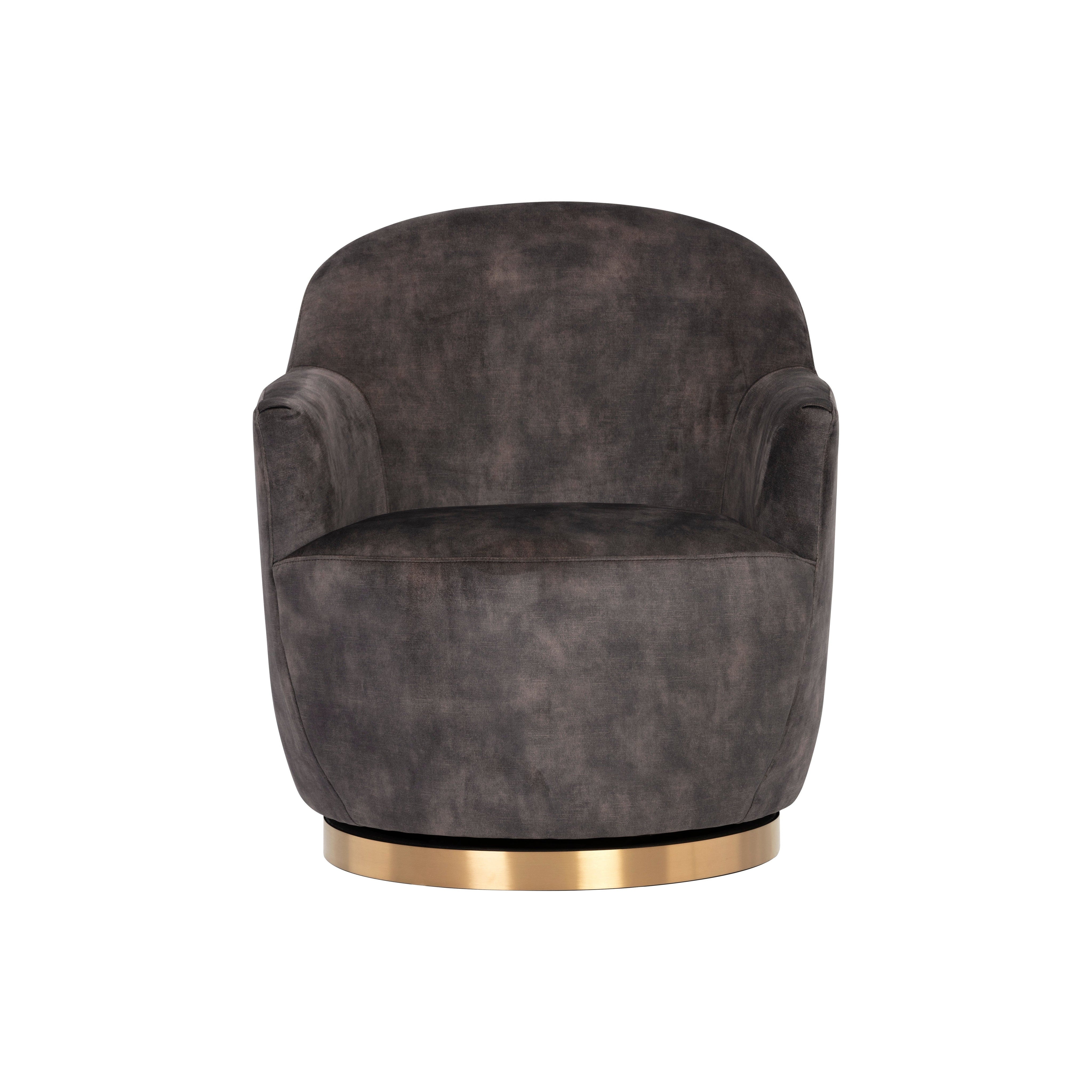 An elegant swivel chair perfect for living, lounge and office spaces. Features a modern barrelback design upholstered in nono shitake fabric. A gold stainless steel base with 360 degree swivel completes the design.