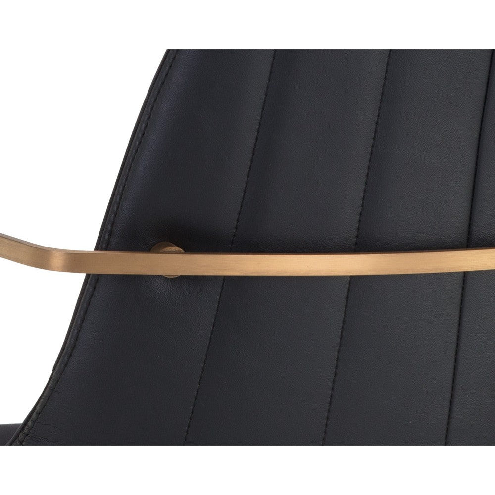 This swivel dining chair from is where urban cool meets contemporary elegance. Designed with an abbington black fabric seat and a channel tufted exterior in bravo black faux leather. Brushed gold finished arms and black iron legs complete this look. Handle With Care: This design has been crafted with faux leather. Faux leather is manufactured to reflect the natural characteristics of leather; as such, colour variations, markings, wrinkles, grooves, and light scratches are appreciated characteristics. No two pieces will be alike. Visit our Product Care page for more information on how to ensure the lasting beauty of this piece.