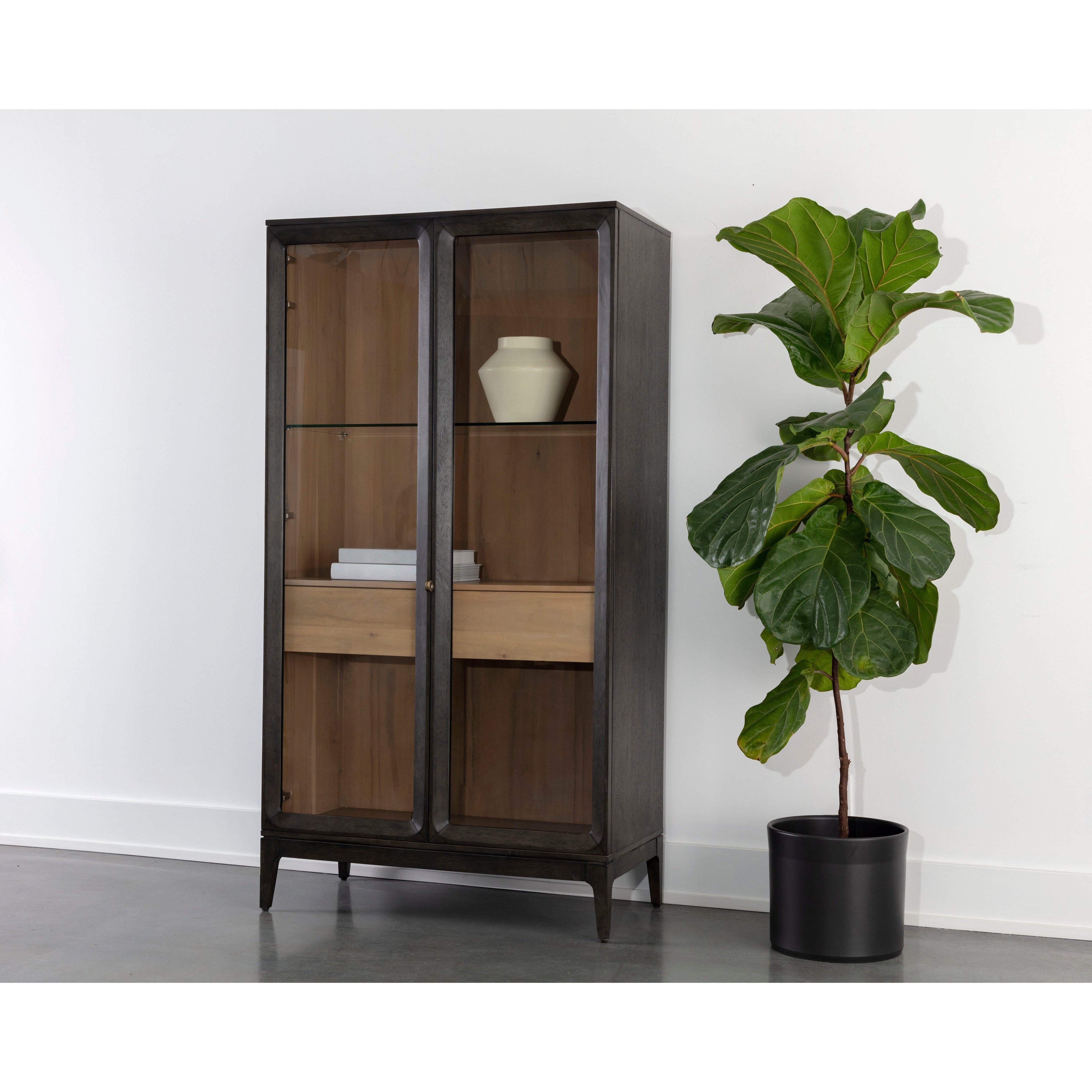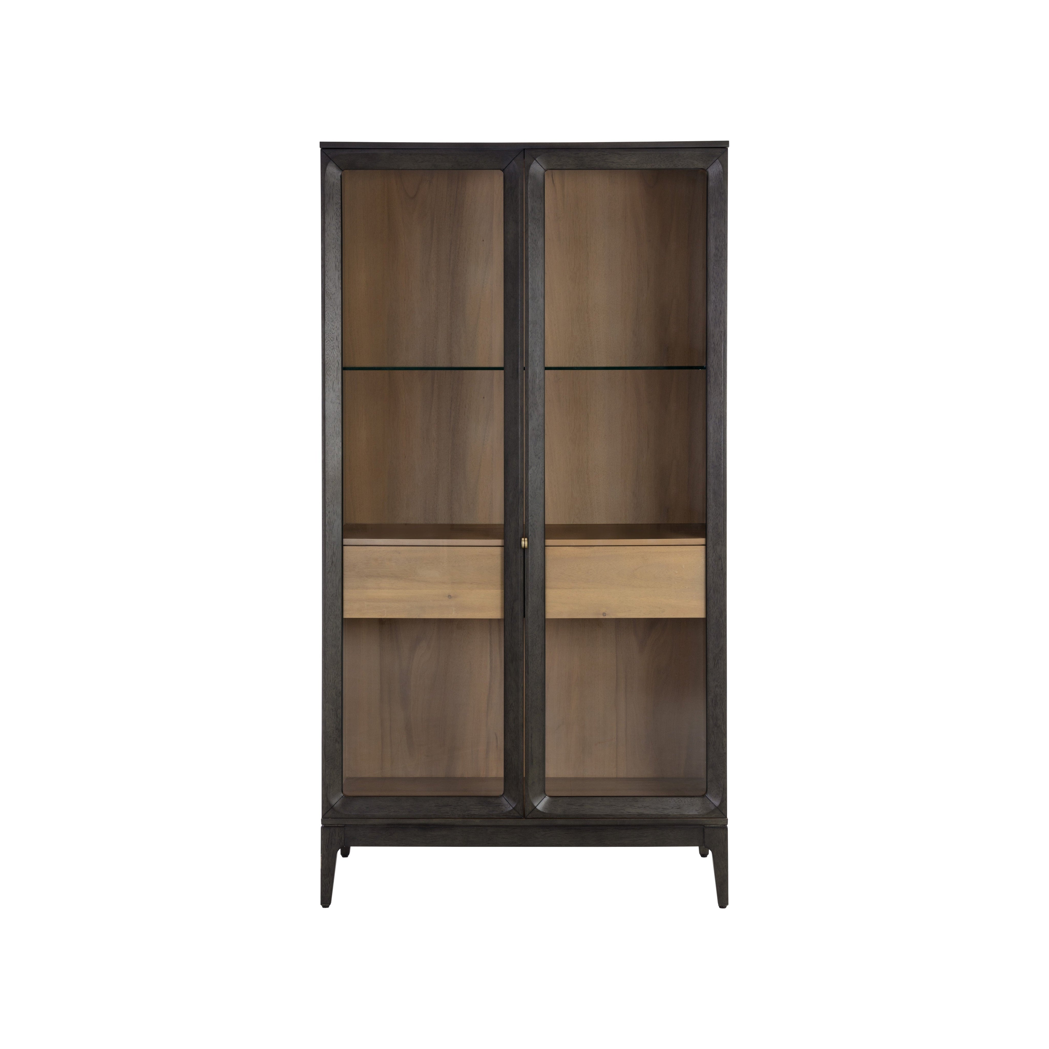 Boasting sharp lines brought to life with acacia veneer, the Cecilia Display Cabinet is a mid-century delight. Accented with brass handles and finished with solid rubberwood legs, this cabinet features generous shelving space and in-cabinet drawers to proudly showcase your beautiful treasures.