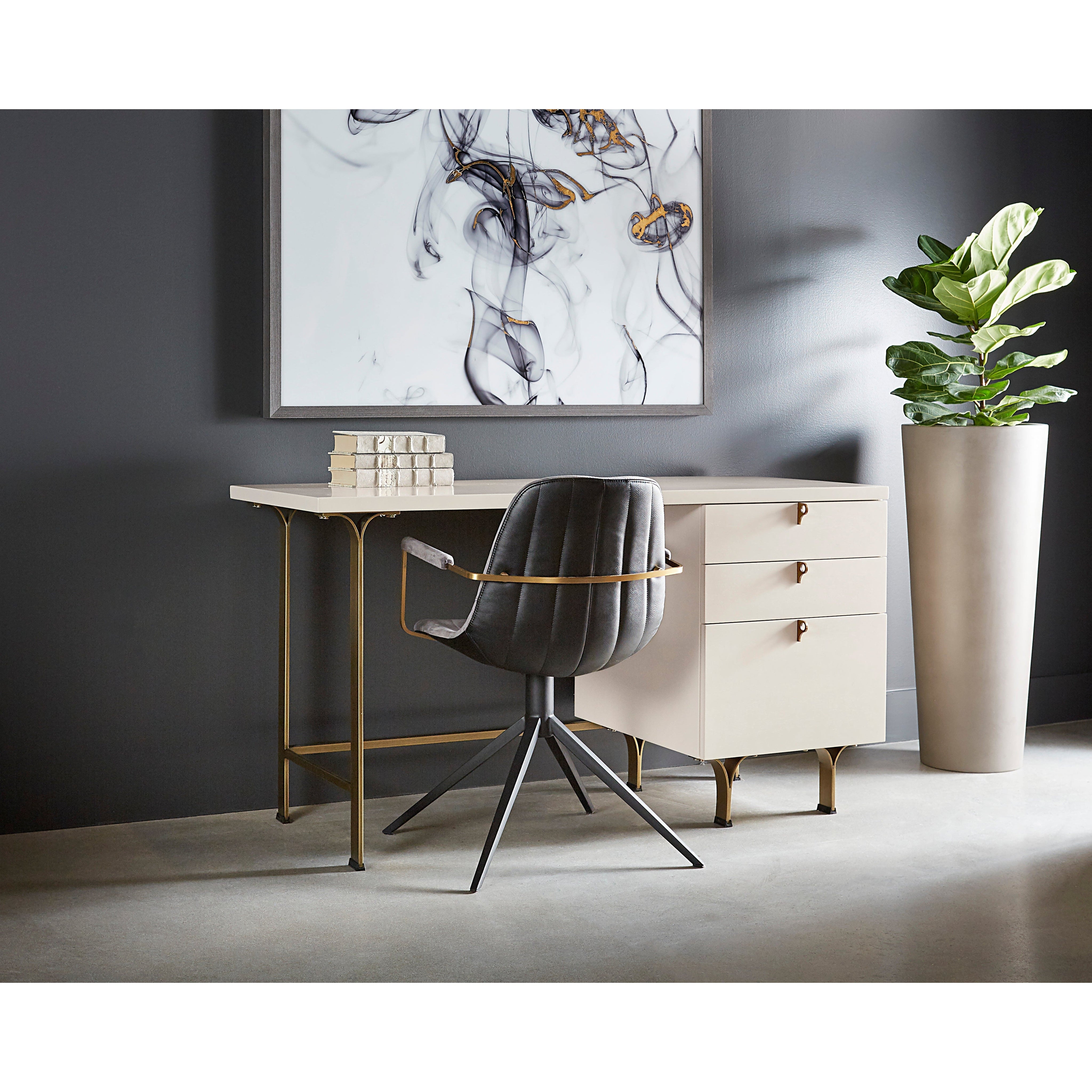 Add beauty to your workspace with this stylish desk. Designed with three drawers crafted from rubberwood, featuring a subtle wood grain texture and a painted cream finish. Uniquely sculpted antique brass feet and drawer pulls complete the look. As wood is an organic, porous material, these pieces will contain natural variation of texture and may also exhibit fine indentations and cracks. Wood pieces will also display a disparity of colour and grain, and visible knots and burls that add to the character of each piece.