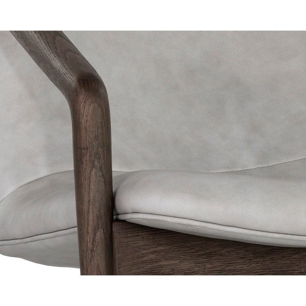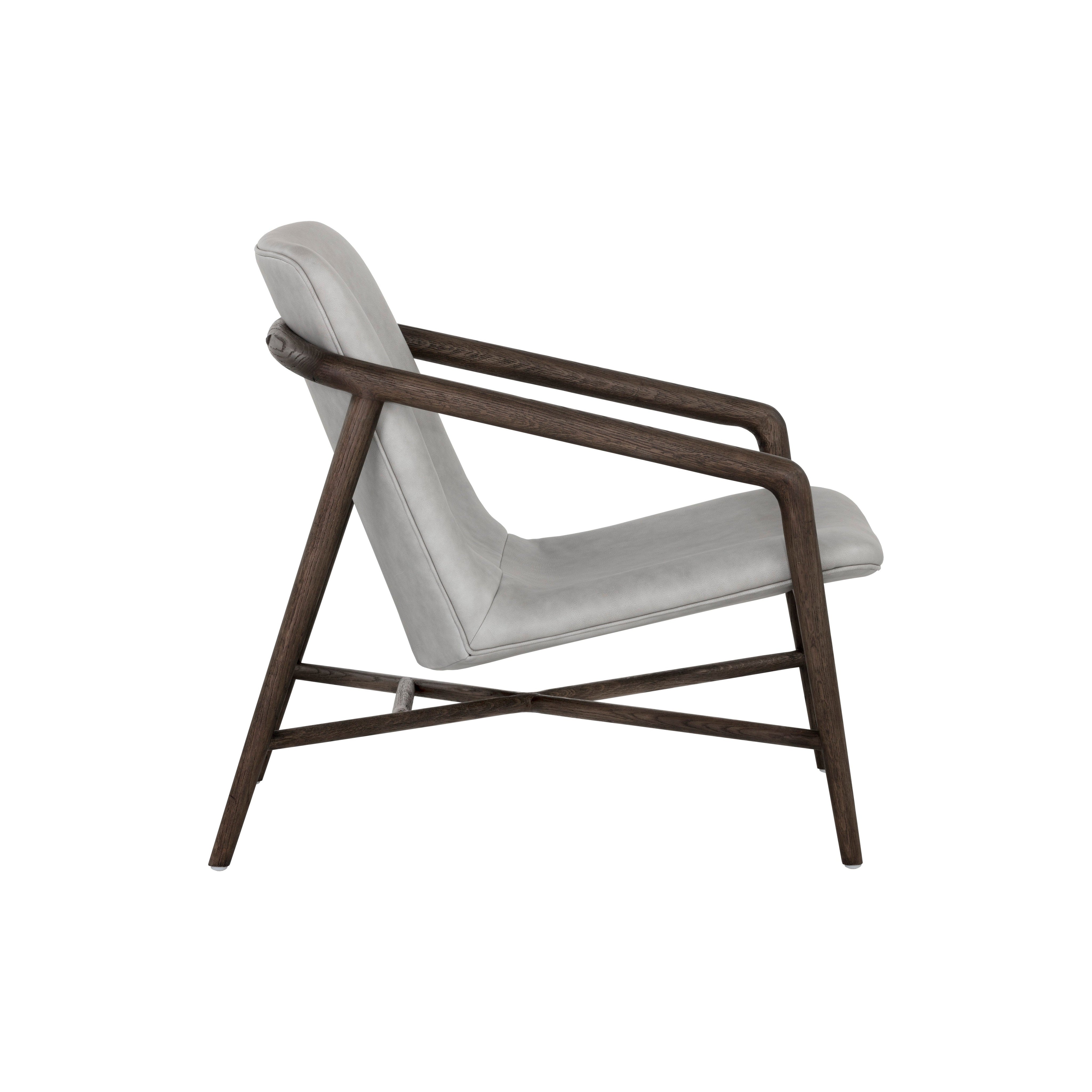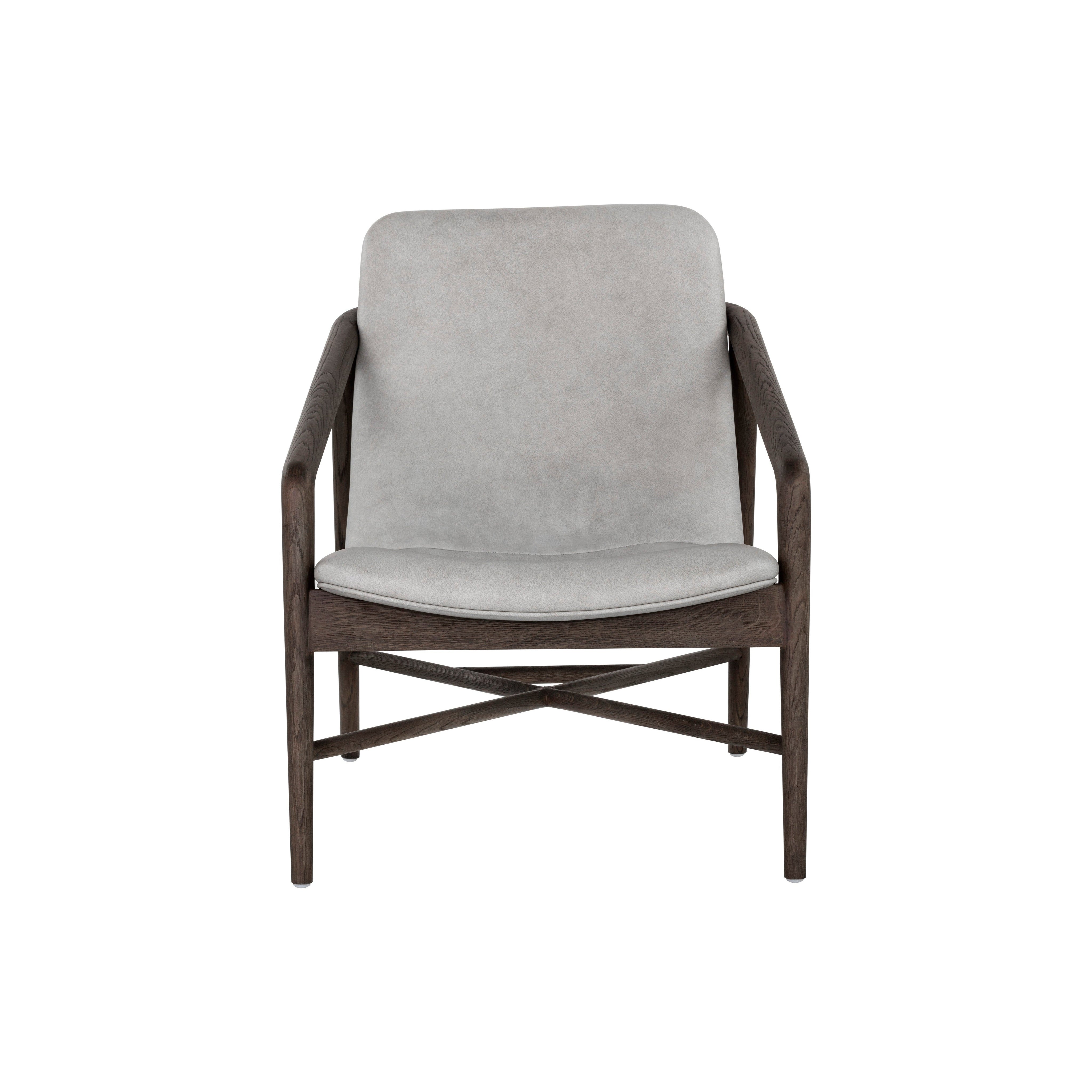 Create a comfortable lounge space with this mid-century influenced armchair. The beautifully sculpted exposed frame is crafted with distressed brown solid oak wood. Stocked in saloon light grey leather.