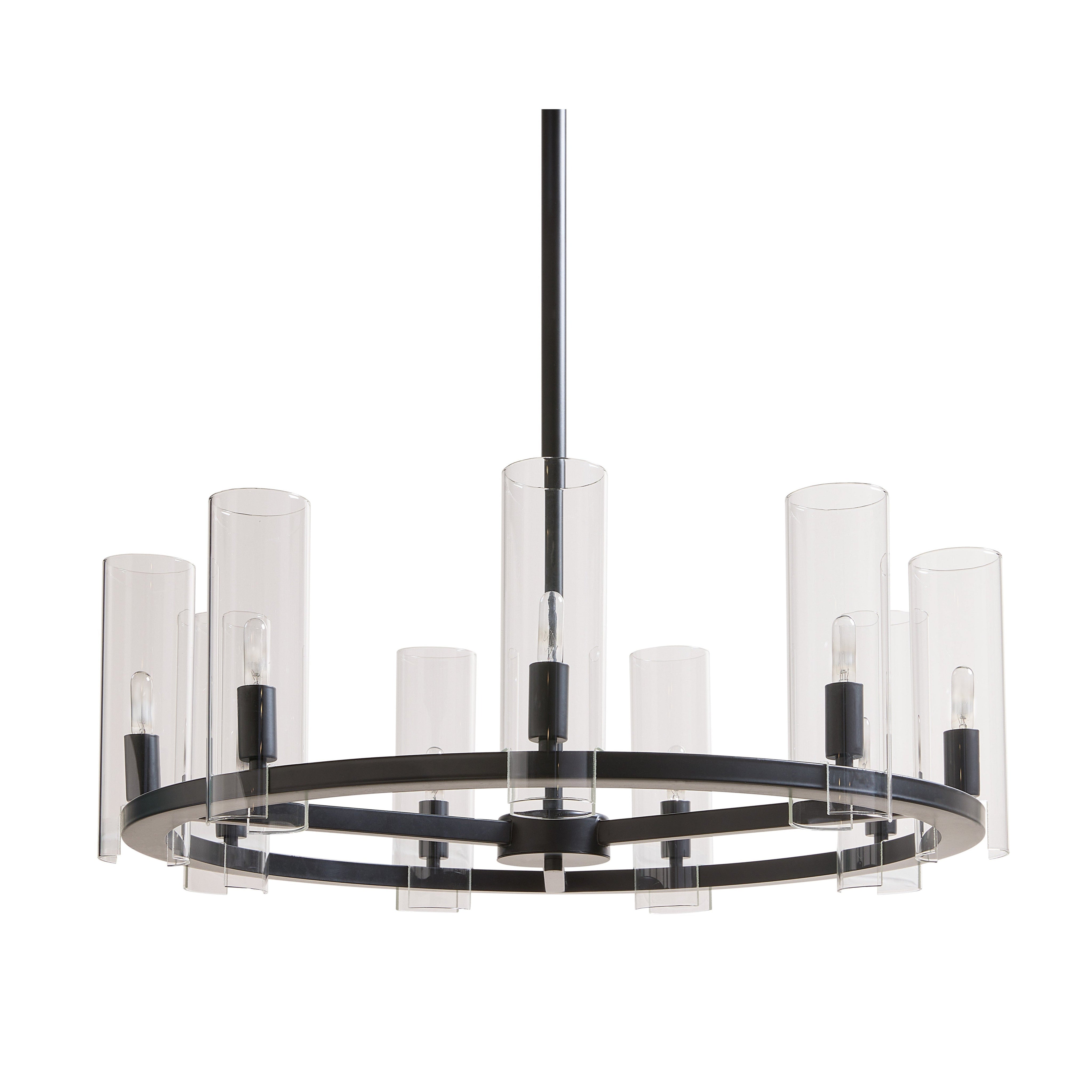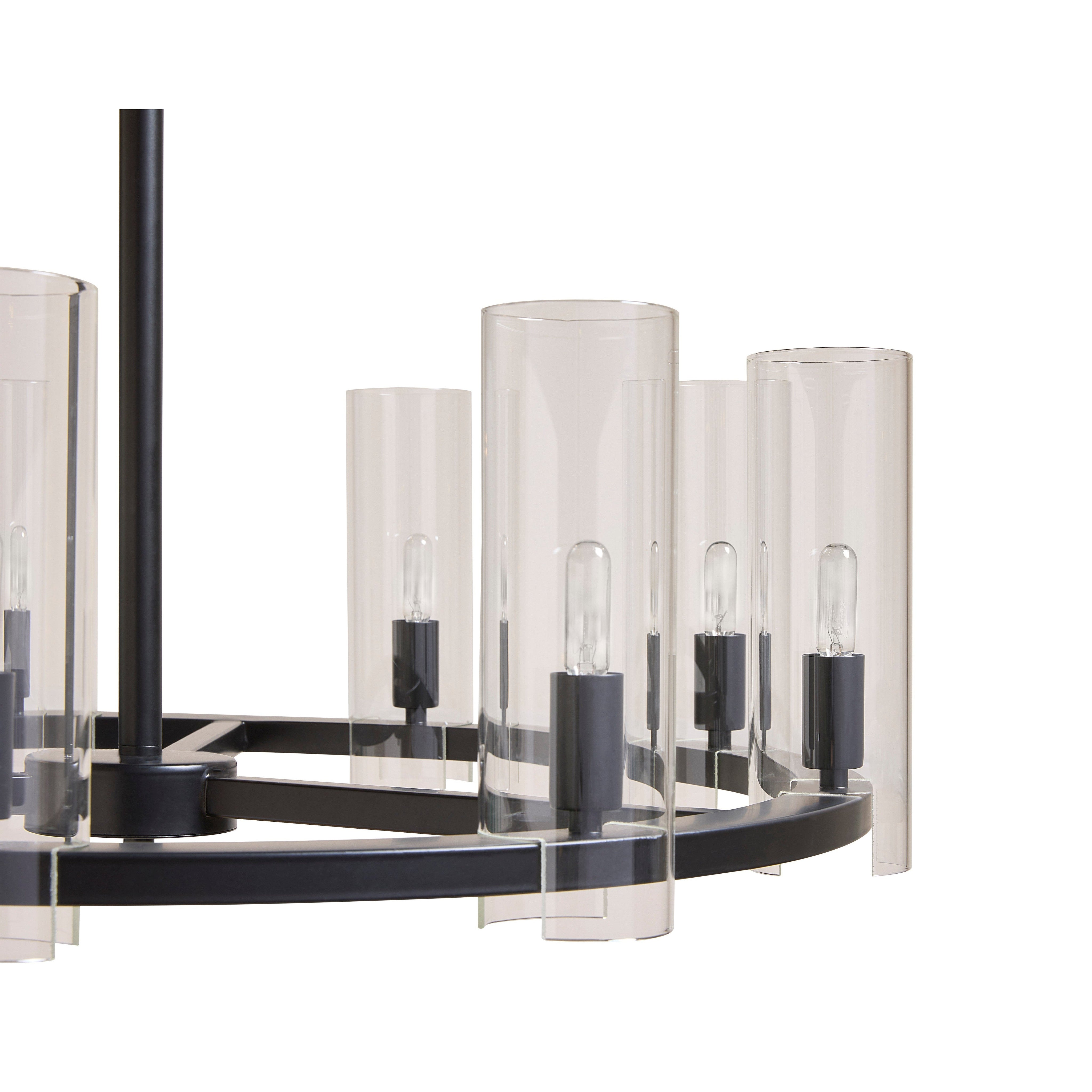 Brighten up any space with this small, sophisticated chandelier that invokes timeless elegance. Crafted with a metal wheel frame in a black metal finish and features clear glass cylinder shades.