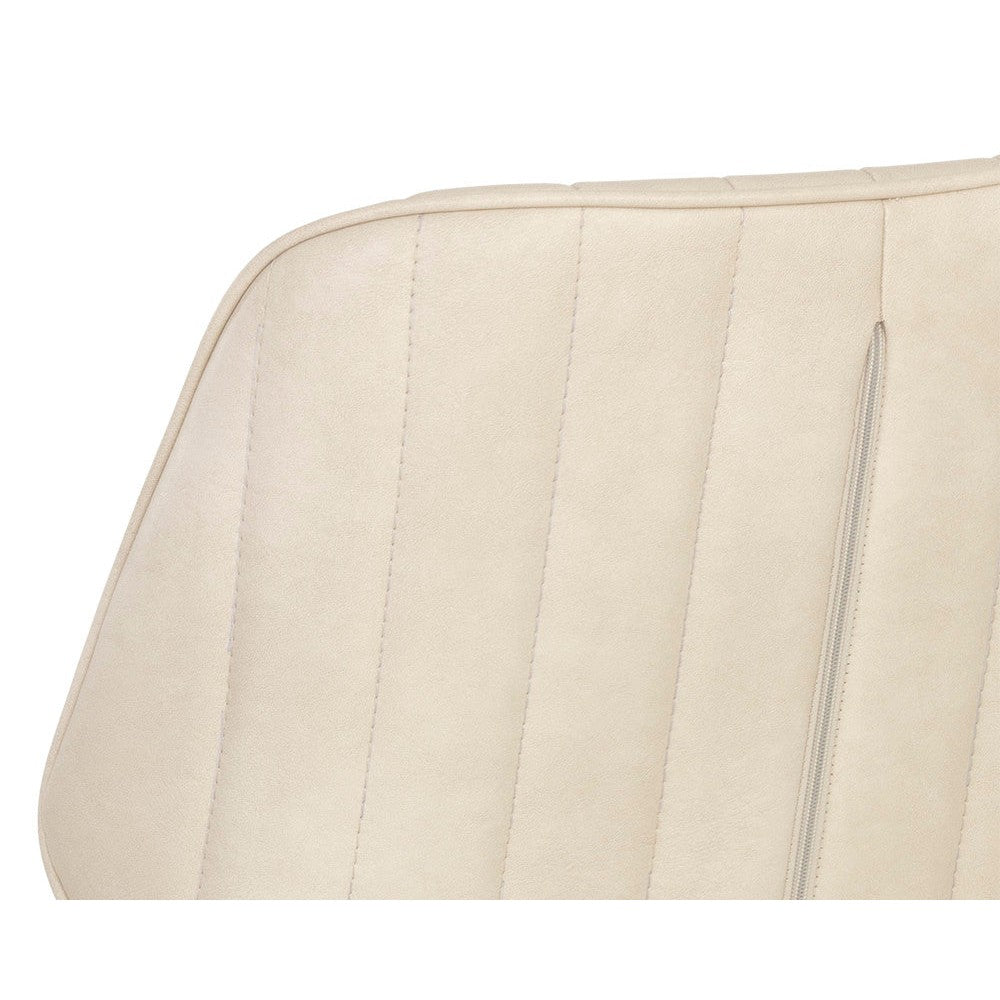 This industrial inspired dining chair is perfect for dining, lounge, office spaces and more. For a feminine touch, this design combines bravo cream faux leather with channel tufting and bronze iron legs. Beautiful from all angles.