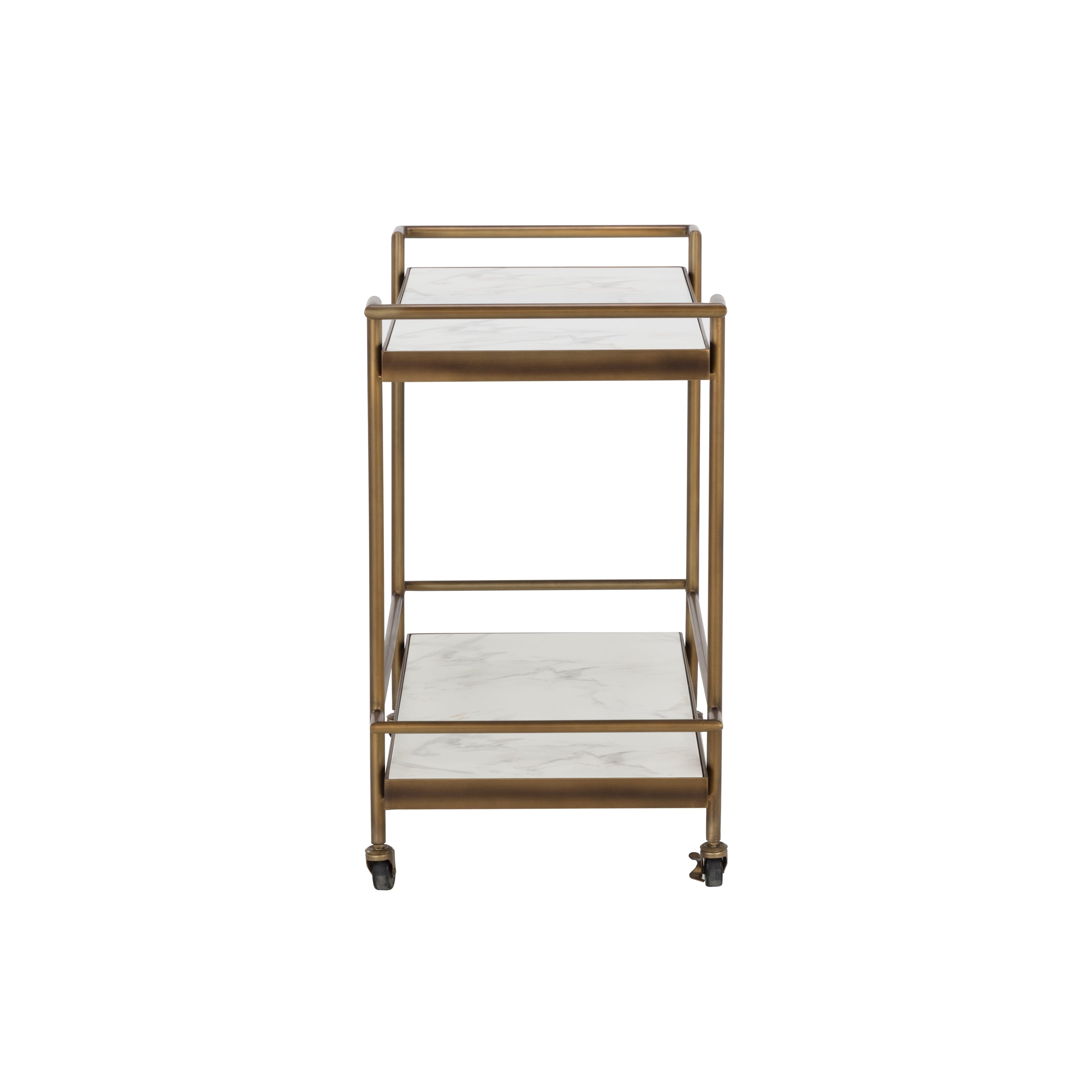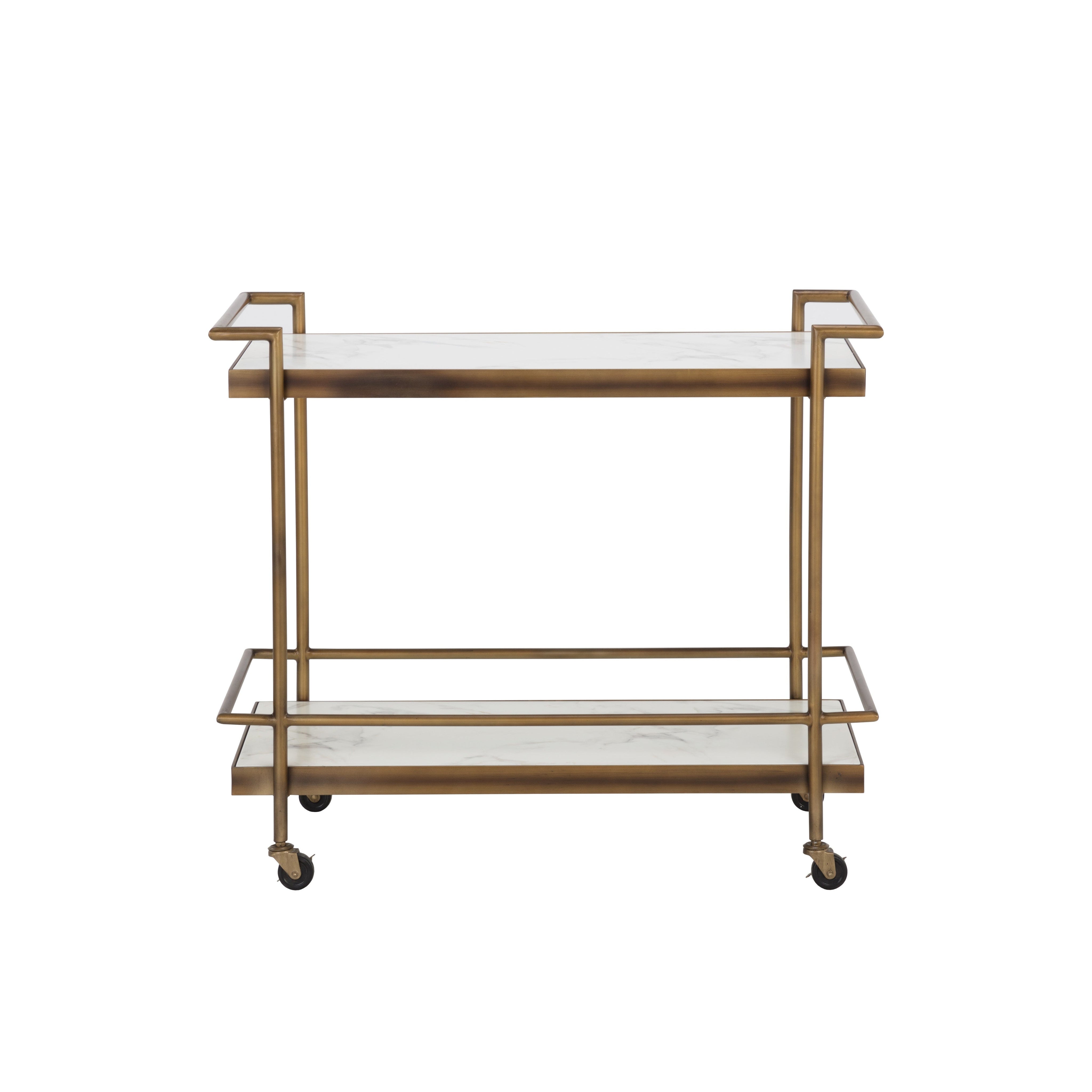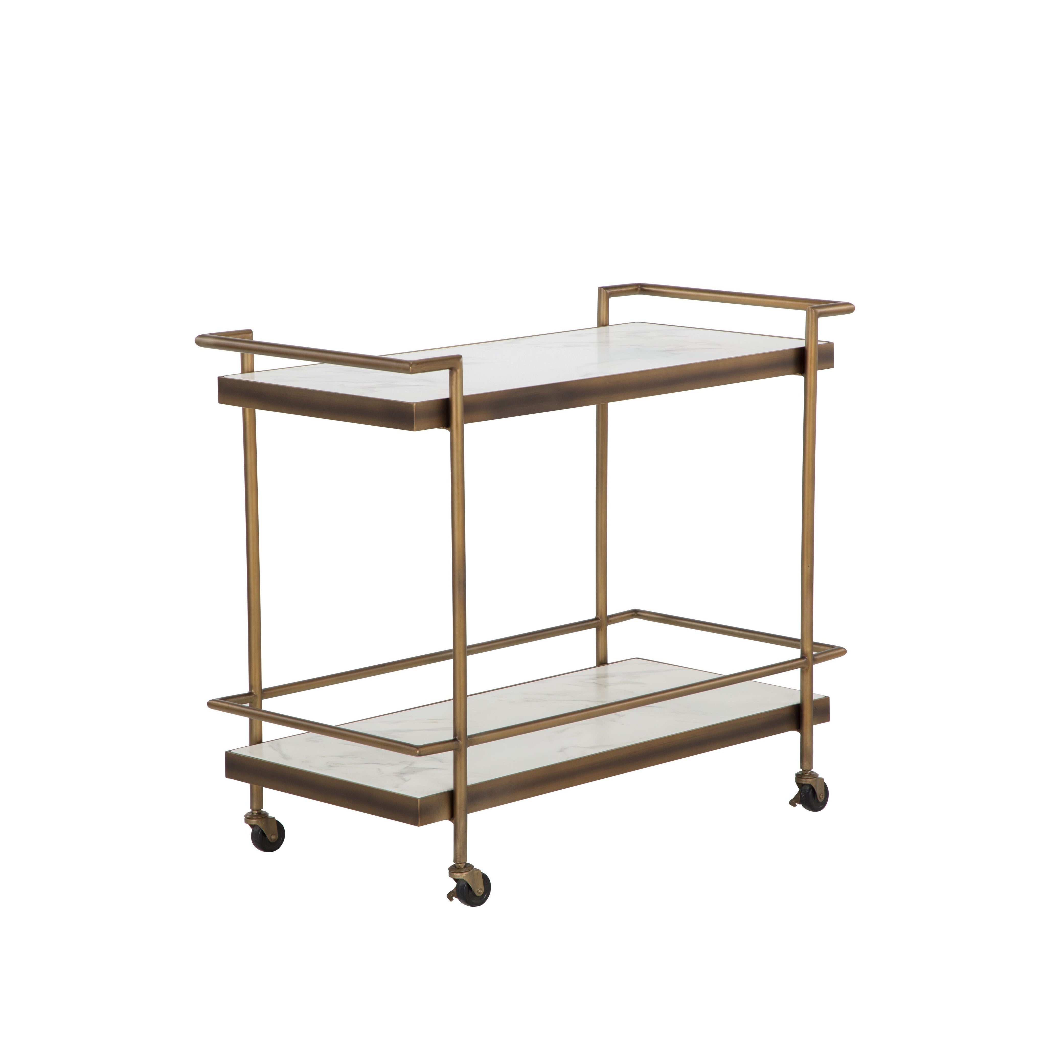 Elegantly display your spirits or drinkware with the Contardi Bar Cart. Built for durability, this bar cart features a powder-coated steel frame with a rustic bronze finish. The bottom and top shelves are made from reinforced concrete with a beautiful white marble look. Crafted from a natural concrete mix, each piece will look different. Variations in colour, texture, imperfections, surface scratches and non-structural hairline cracks are considered inherent and valued qualities of the material.