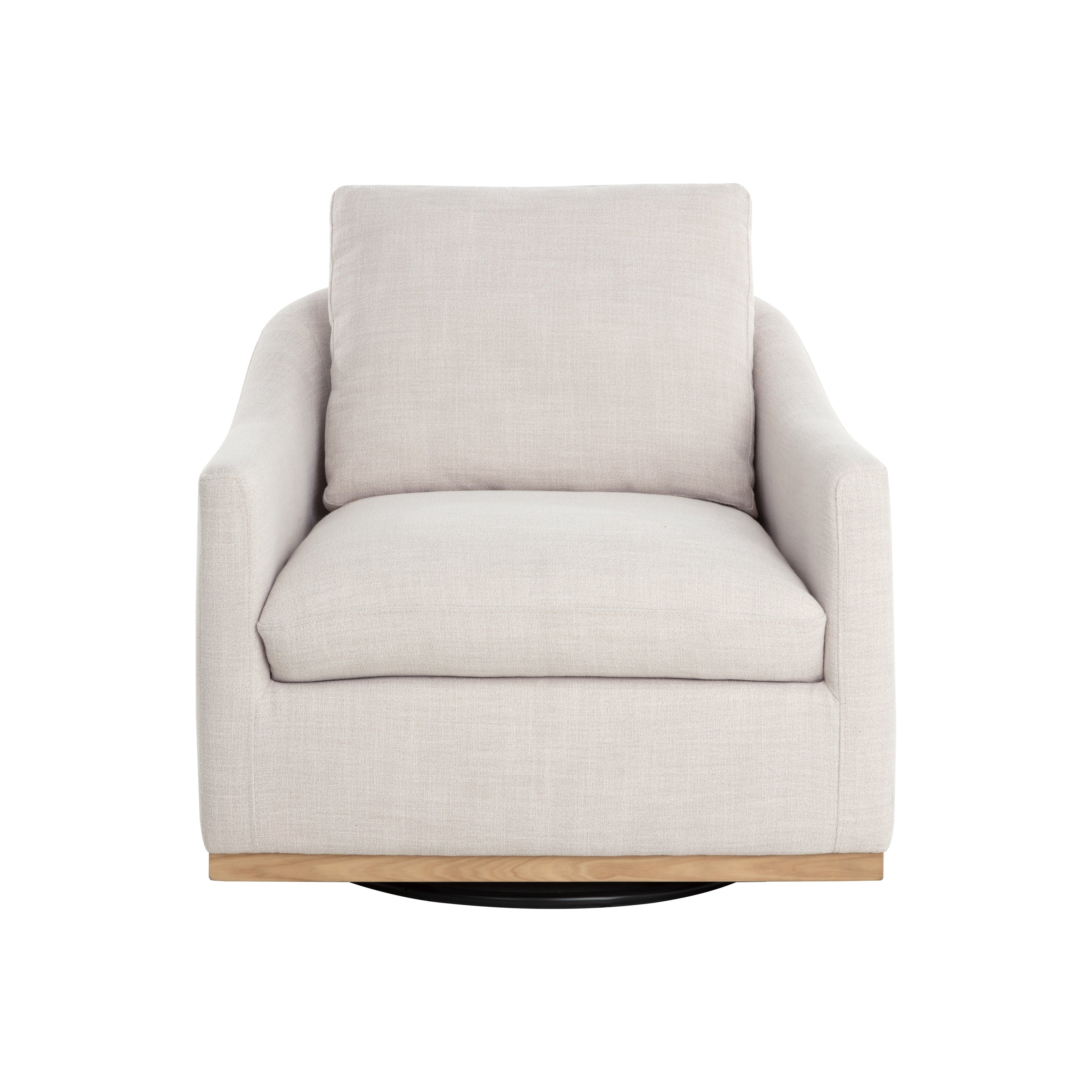 The Corbin Swivel Lounge Chair invites you to sink into its classic contours. Masterfully upholstered in effie linen fabric, and with a blonde ash wood base, this lounge chair provides a stately sense of style and comfort.