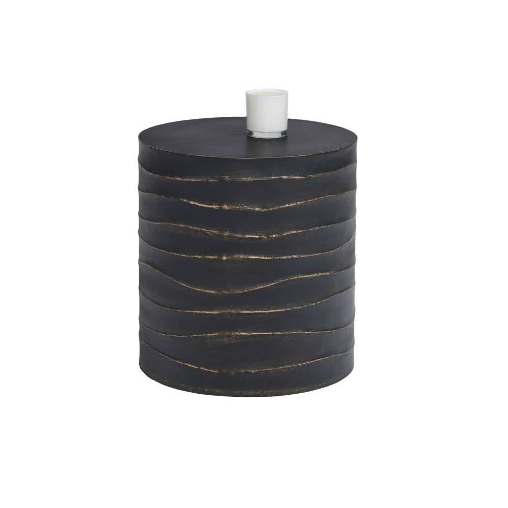 This round side table will create a moody environment. Crafted from concrete, this piece features hand sculpted ridges with a painted brass finish. The perfect addition to living, lounge and office spaces.