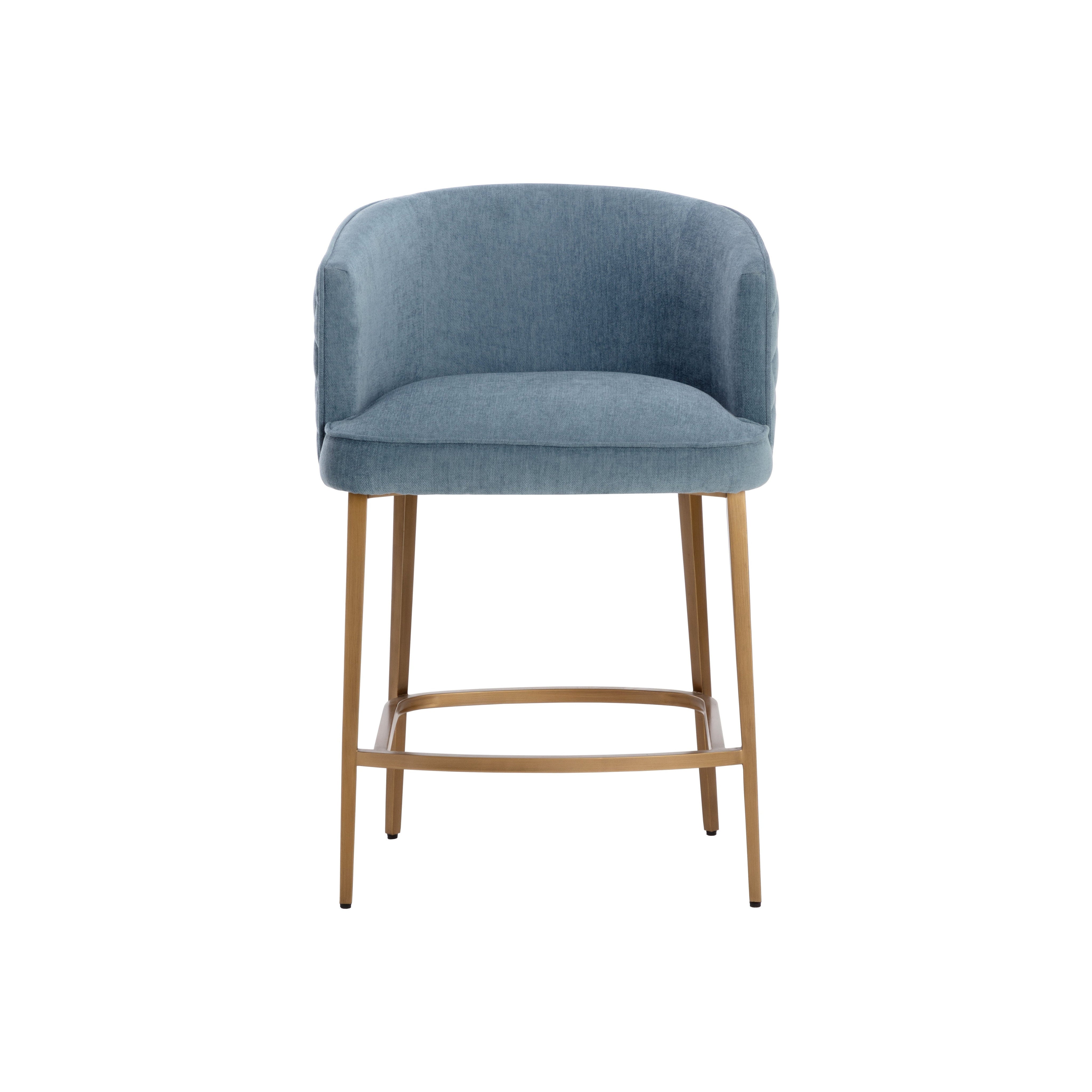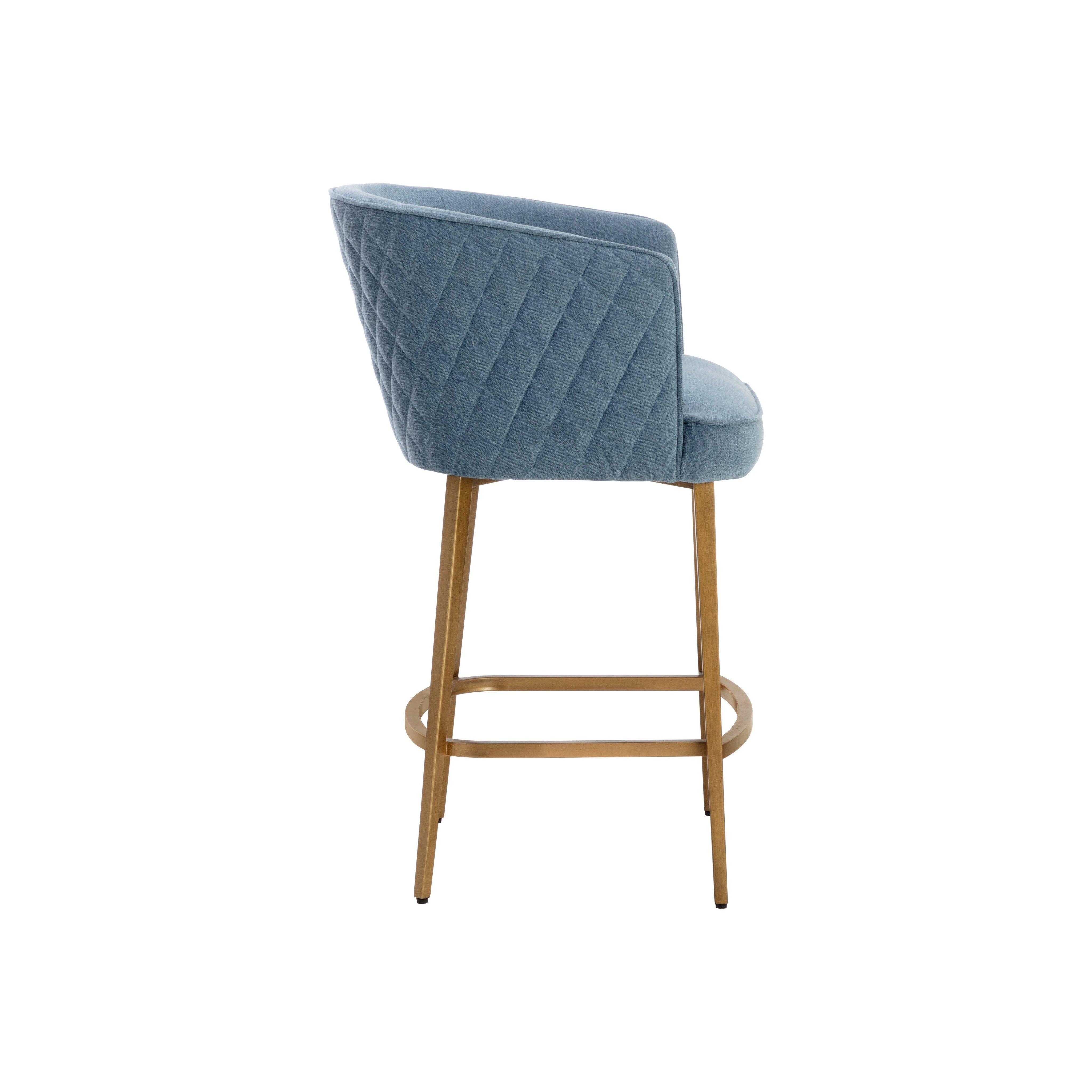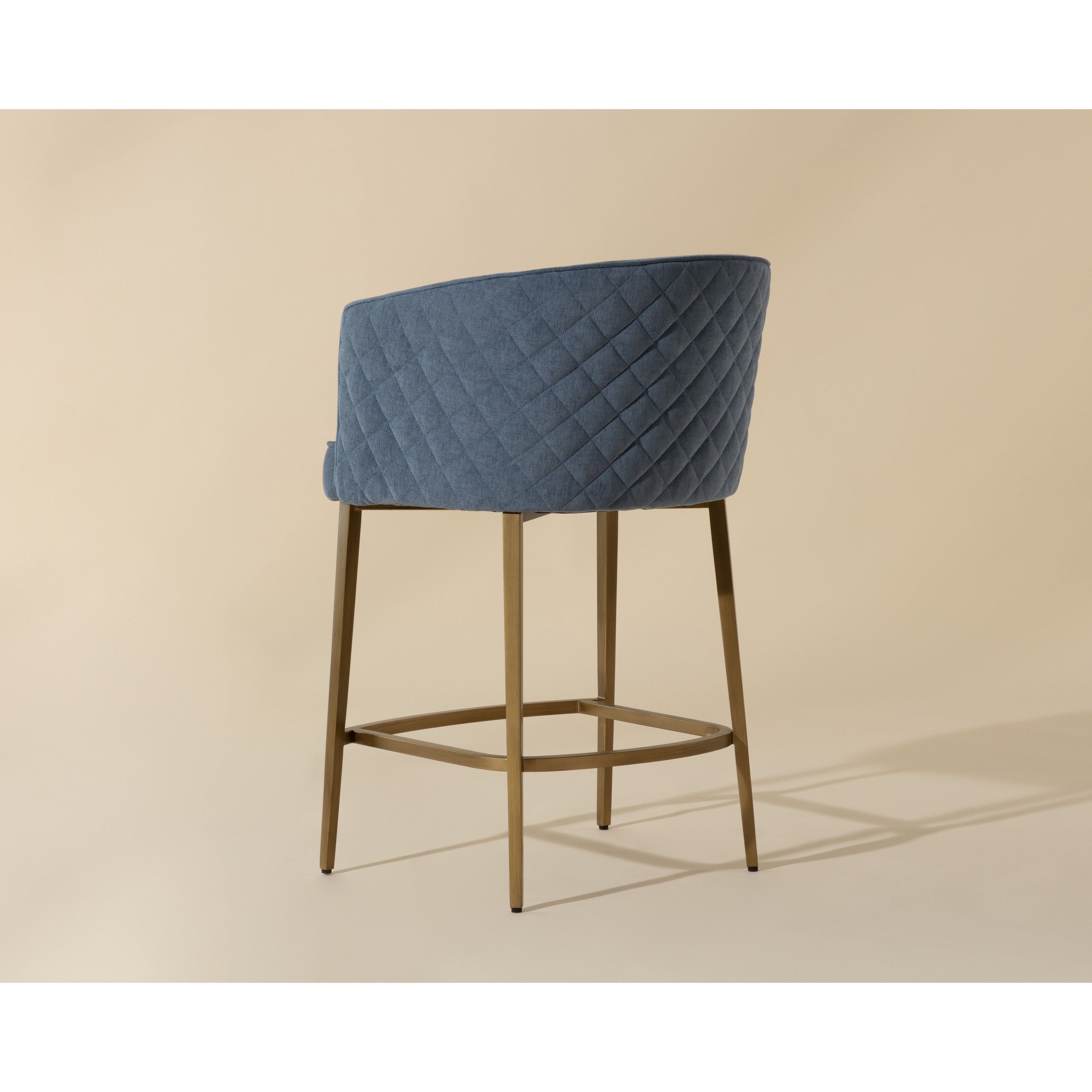 Feminine flair comes to life in this modern counter stool. Stocked in danny iceberg fabric with elegant diamond stitching on the exterior seatback. An antique brass steel frame completes the look.