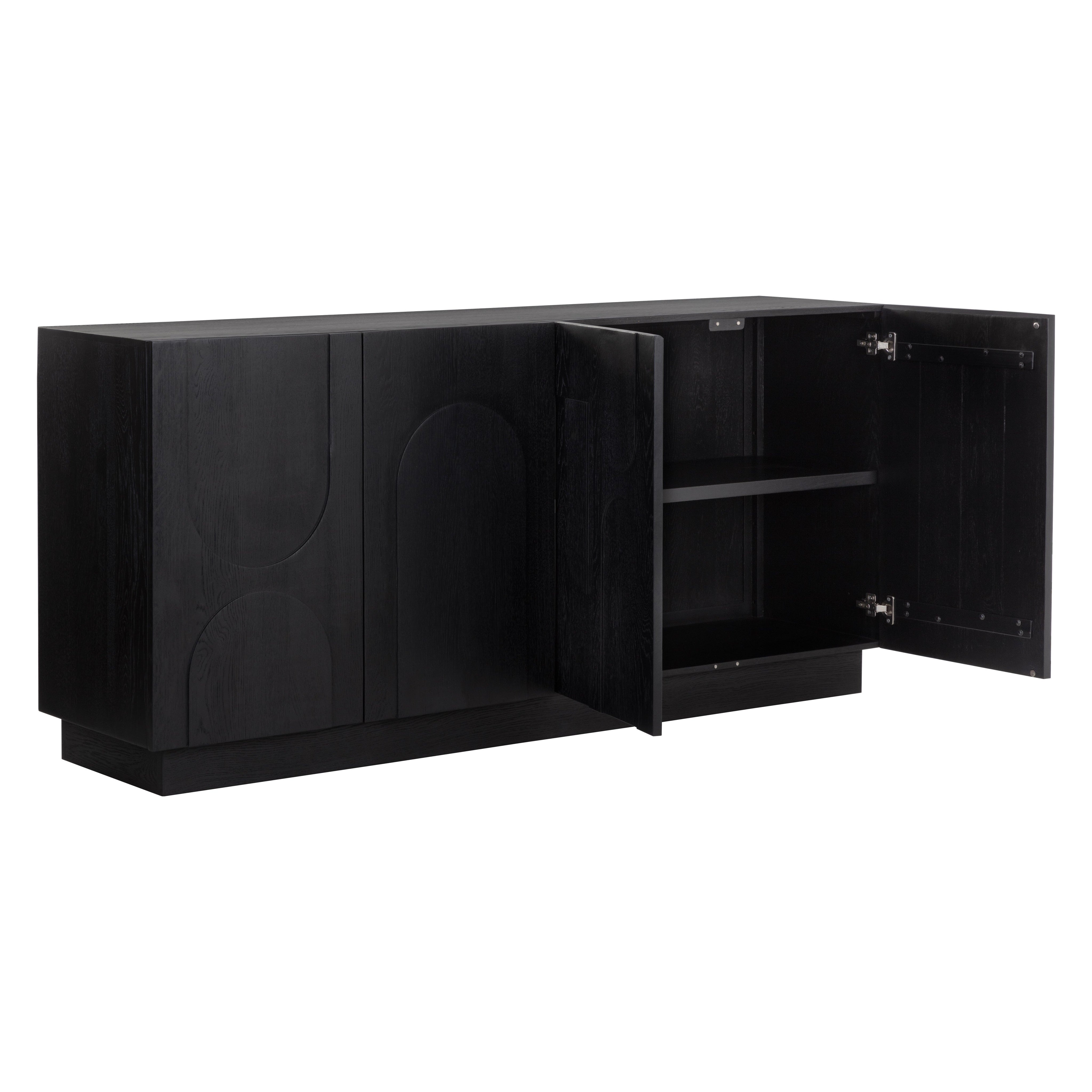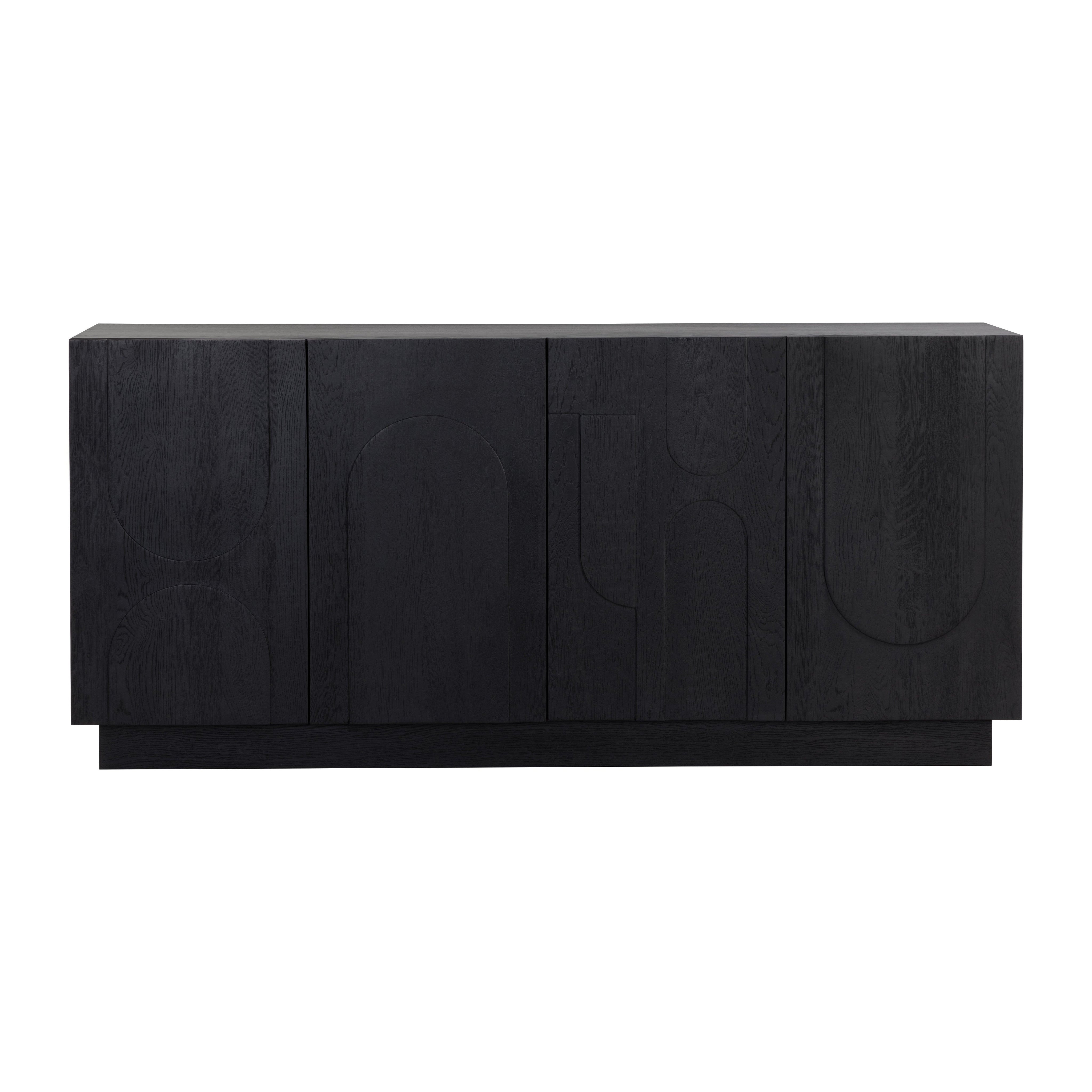 Taking cues from Scandinavian design, the Cove Sideboard is revitalized with beautiful wood patterning. Crafted from a black solid oak wood frame and completed with four cabinets for ample storage space. Anti-tipping kit included. As wood is an organic, porous material, these pieces will contain natural variation of texture and may also exhibit fine indentations and cracks. Wood pieces will also display a disparity of colour and grain, and visible knots and burls that add to the character of each piece. Made in India. With refined craftsmanship, this design was brought to life by skilled local artisans. Due to the nature of handcraftsmanship, unique imperfections such as fissures, markings and variations in colour and shape are welcomed and appreciated characteristics for a truly one-of-a-kind piece.