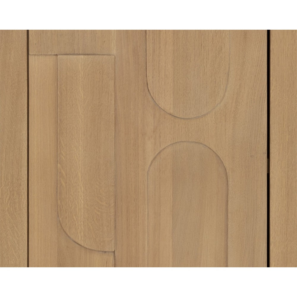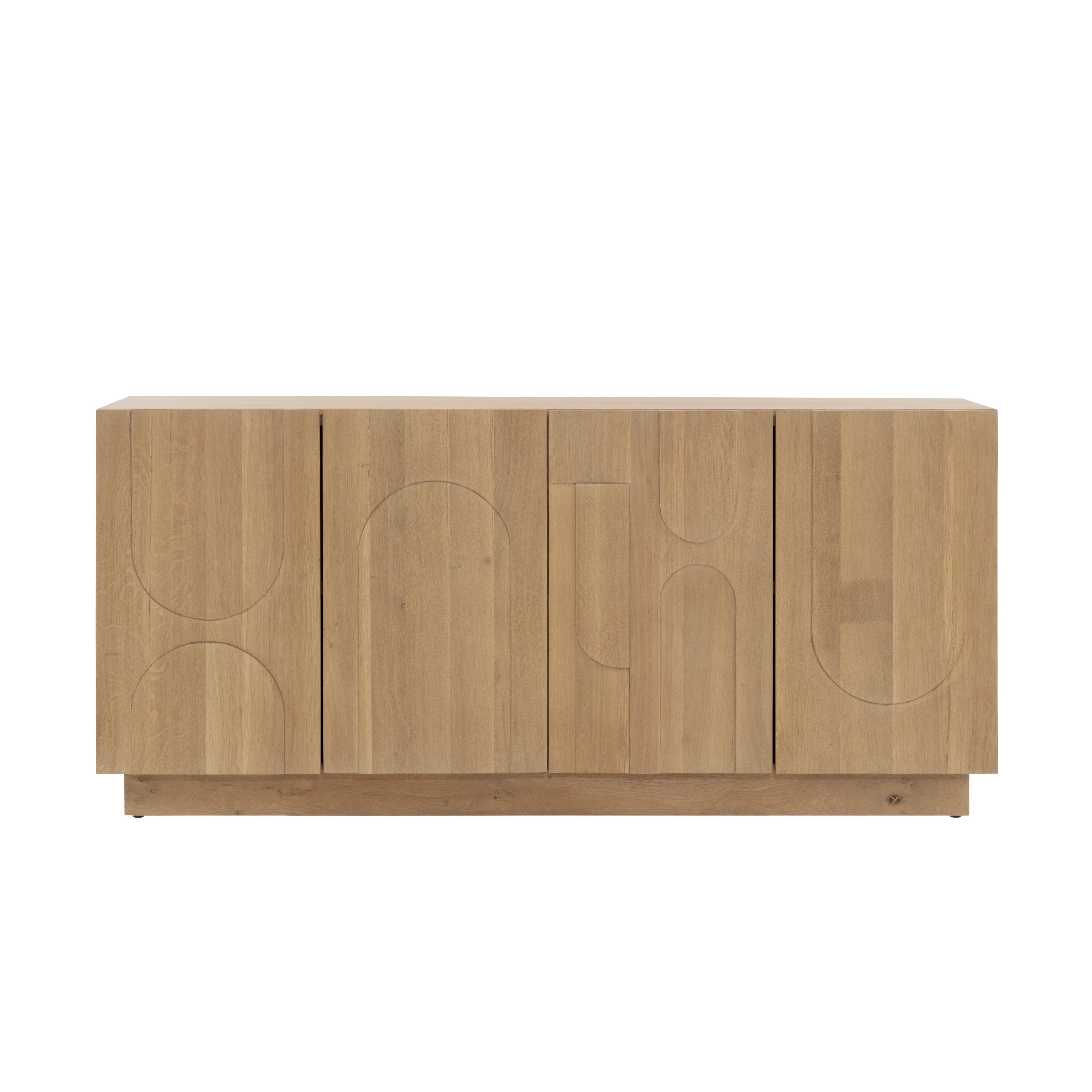 Taking cues from Scandinavian design, the Cove Sideboard is revitalized with beautiful wood patterning. Crafted from a brown solid oak wood frame in a rustic finish, and completed with four cabinets for ample storage space. Anti-tipping kit included. As wood is an organic, porous material, these pieces will contain natural variation of texture and may also exhibit fine indentations and cracks. Wood pieces will also display a disparity of colour and grain, and visible knots and burls that add to the character of each piece. Made in India. With refined craftsmanship, this design was brought to life by skilled local artisans. Due to the nature of handcraftsmanship, unique imperfections such as fissures, markings and variations in colour and shape are welcomed and appreciated characteristics for a truly one-of-a-kind piece.