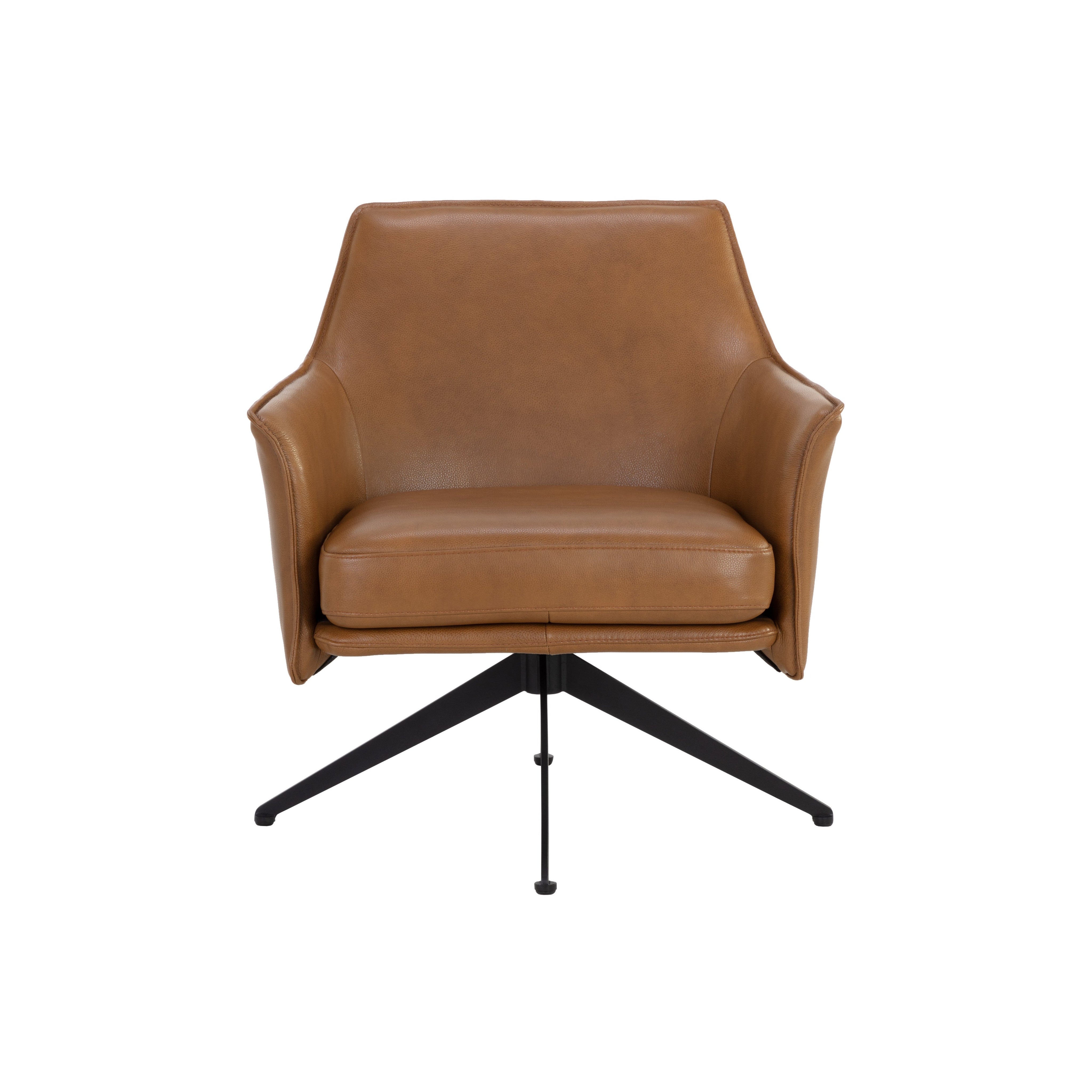 Embrace the comforting contours of the Crosby Swivel Lounge Chair. Perfect for any open living space, this lounge chair features sloped arms and a minimal silhouette upholstered in luxuriously smooth missouri cognac leather. Black powder-coated steel legs lend a stylish flair to the sleek design. Handle with Care: This design has been crafted with 100% leather. Leather is a natural material; as such, colour variations, markings, wrinkles, grooves and light scratches are acceptable and appreciated characteristics. No two pieces are alike. Visit our Product Care page for more information on how to ensure the lasting beauty of this piece.