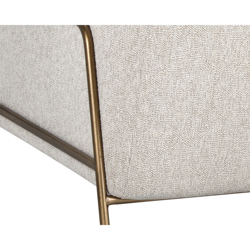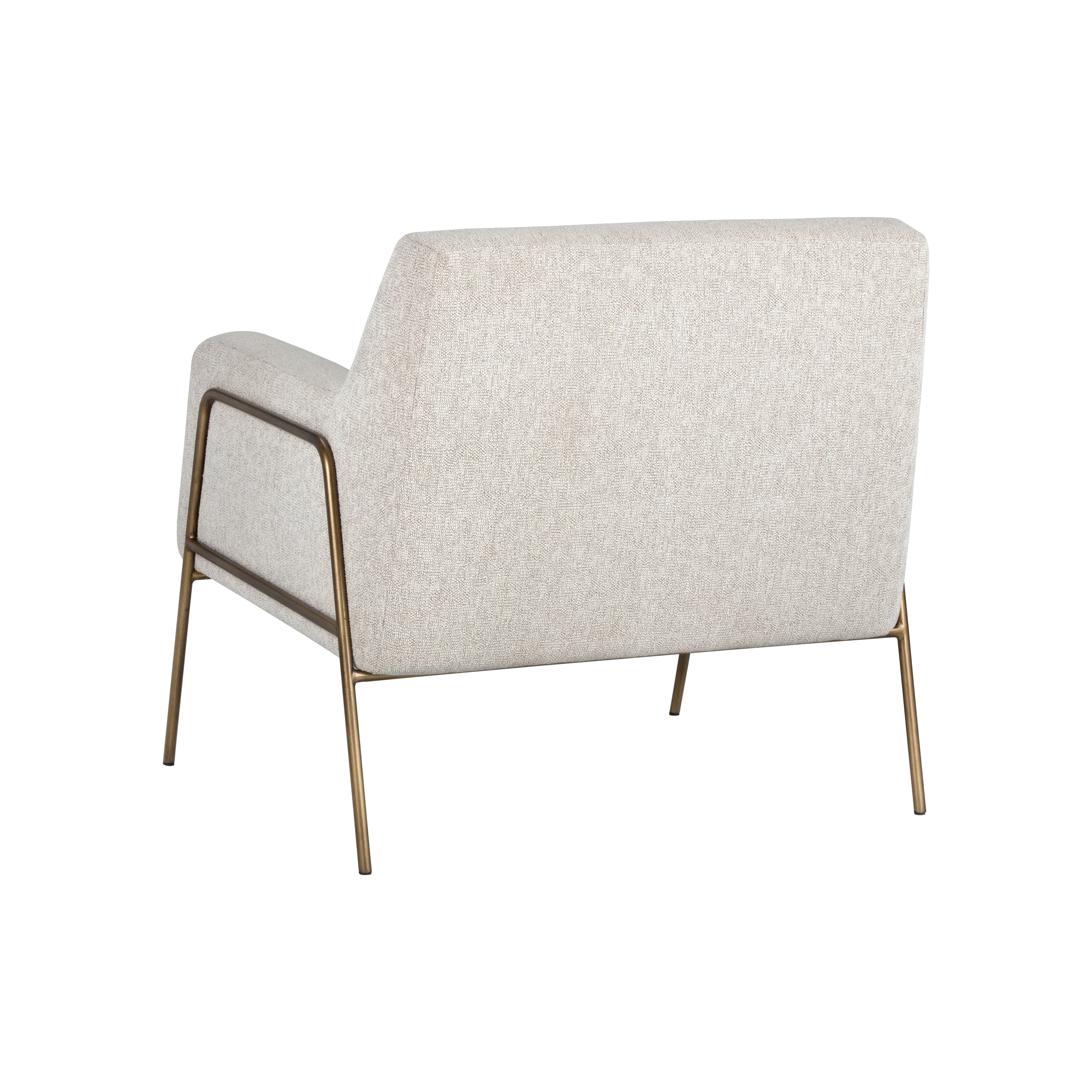 A stylish and comfortable armchair. Designed with a modern frame featuring exposed antique brass legs. Available in dove cream fabric or polo club kohl grey performance fabric.