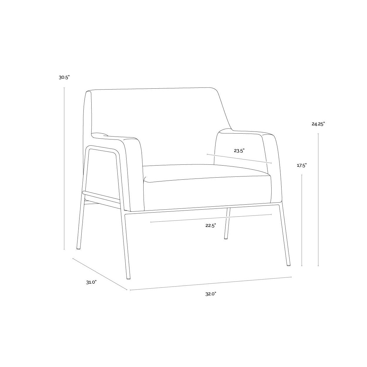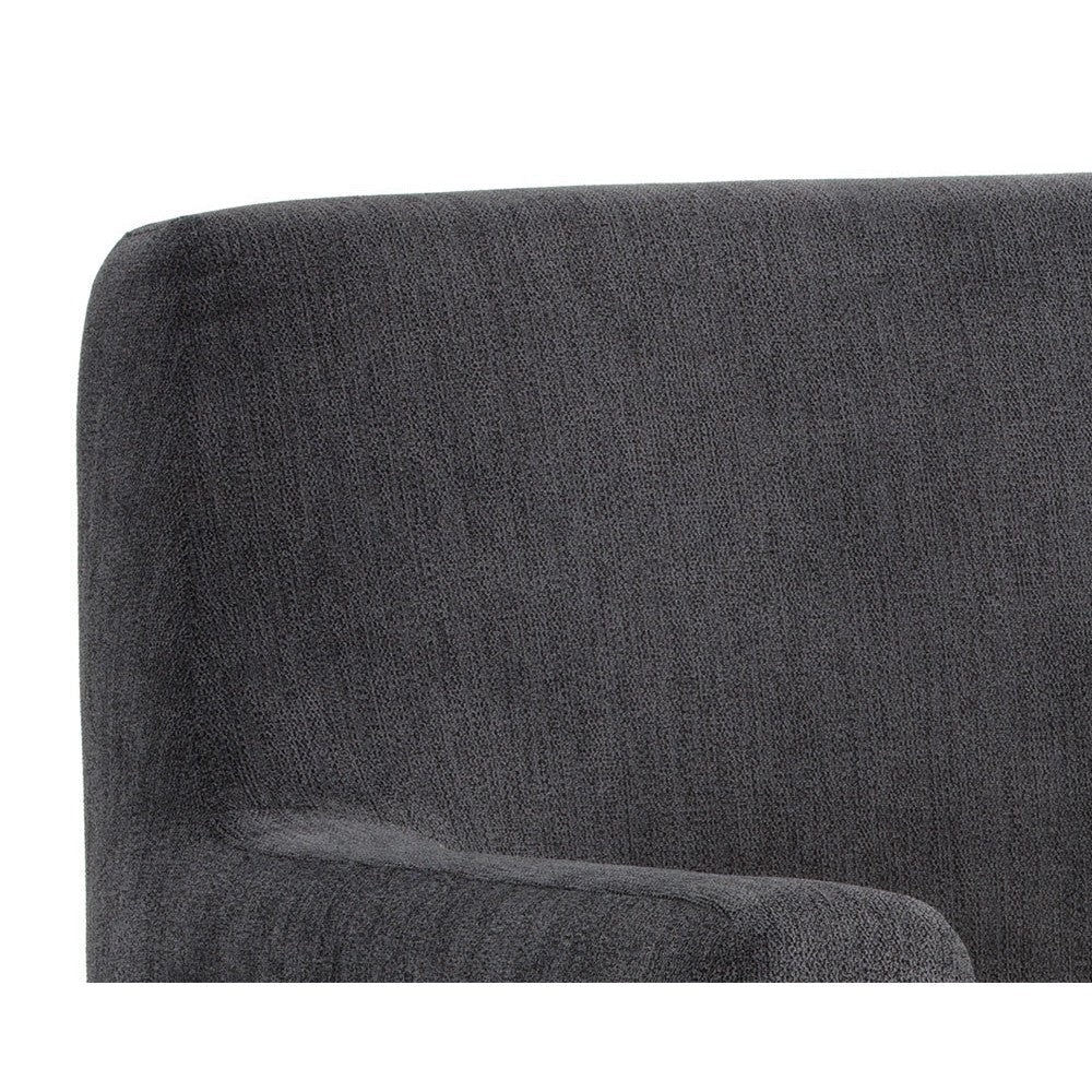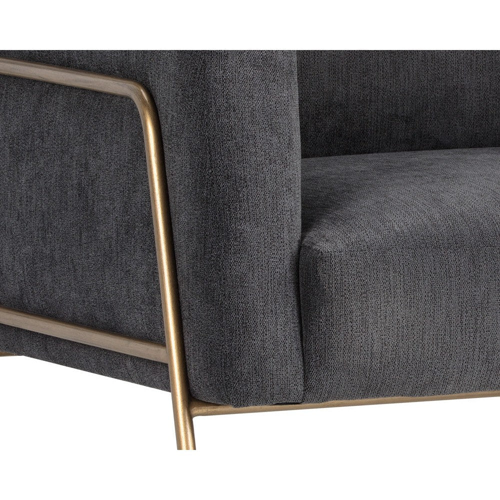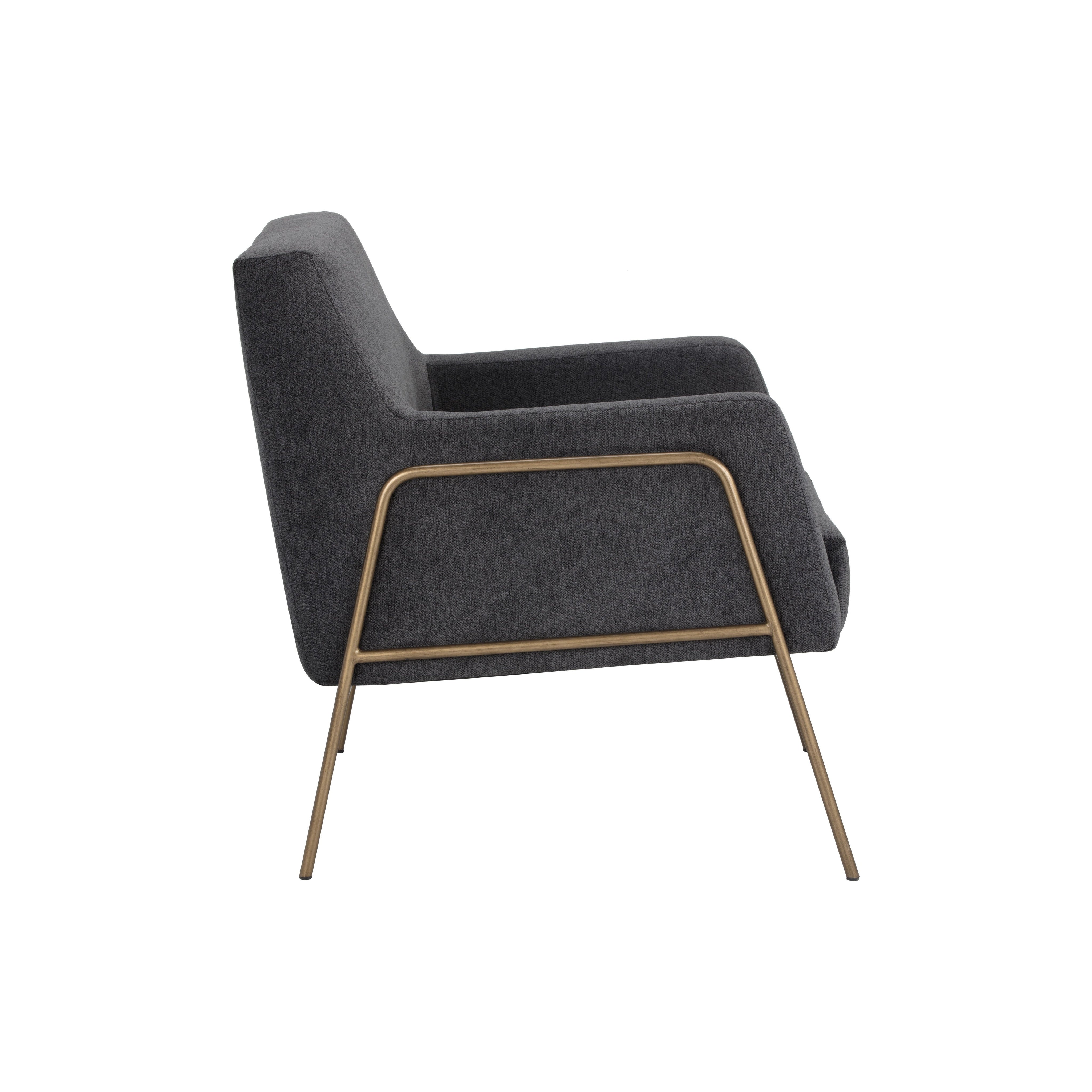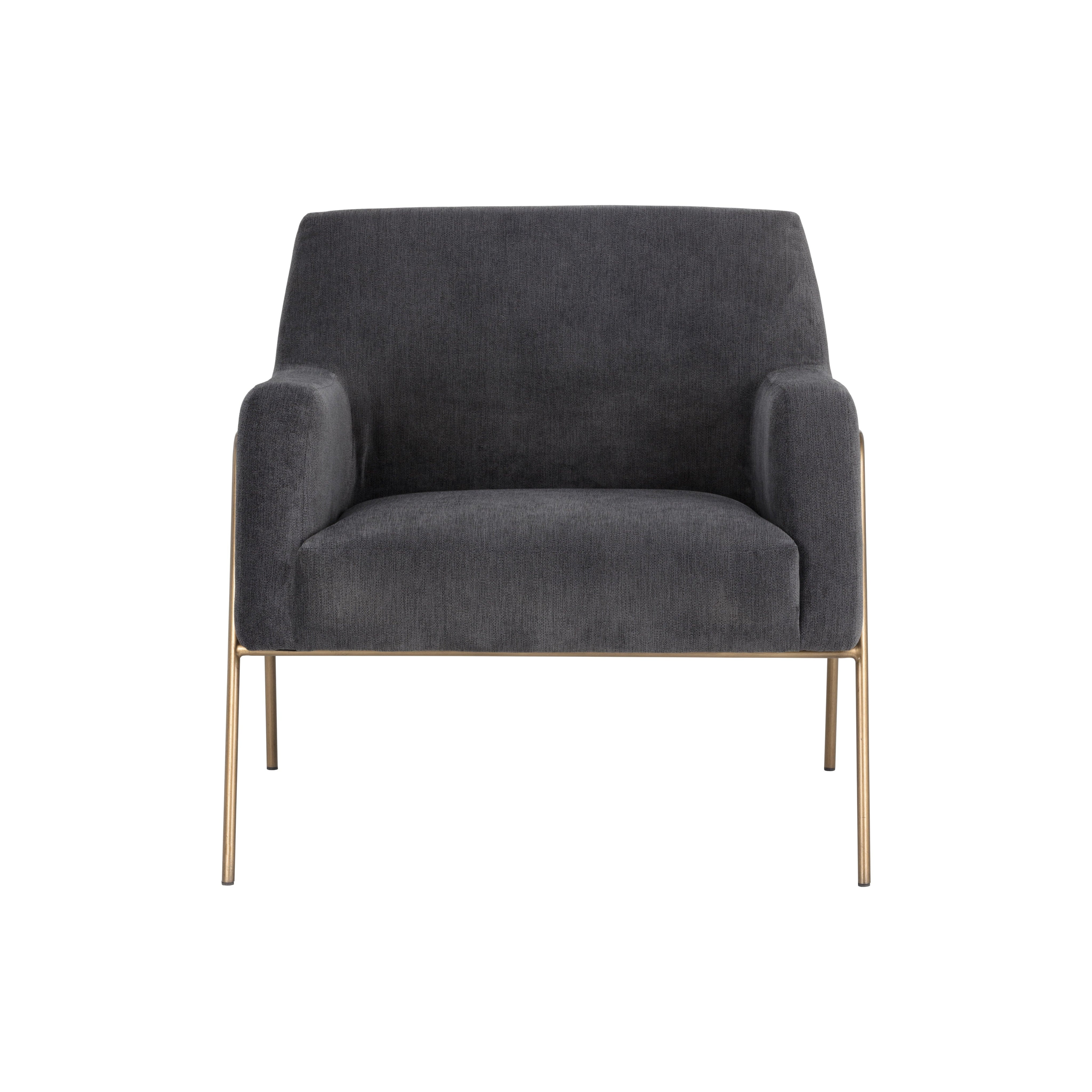 A stylish and comfortable armchair. Designed with a modern frame featuring exposed antique brass legs. Available in polo club kohl grey performance fabric. Performance fabric is moisture repellent, durable and easy to clean.