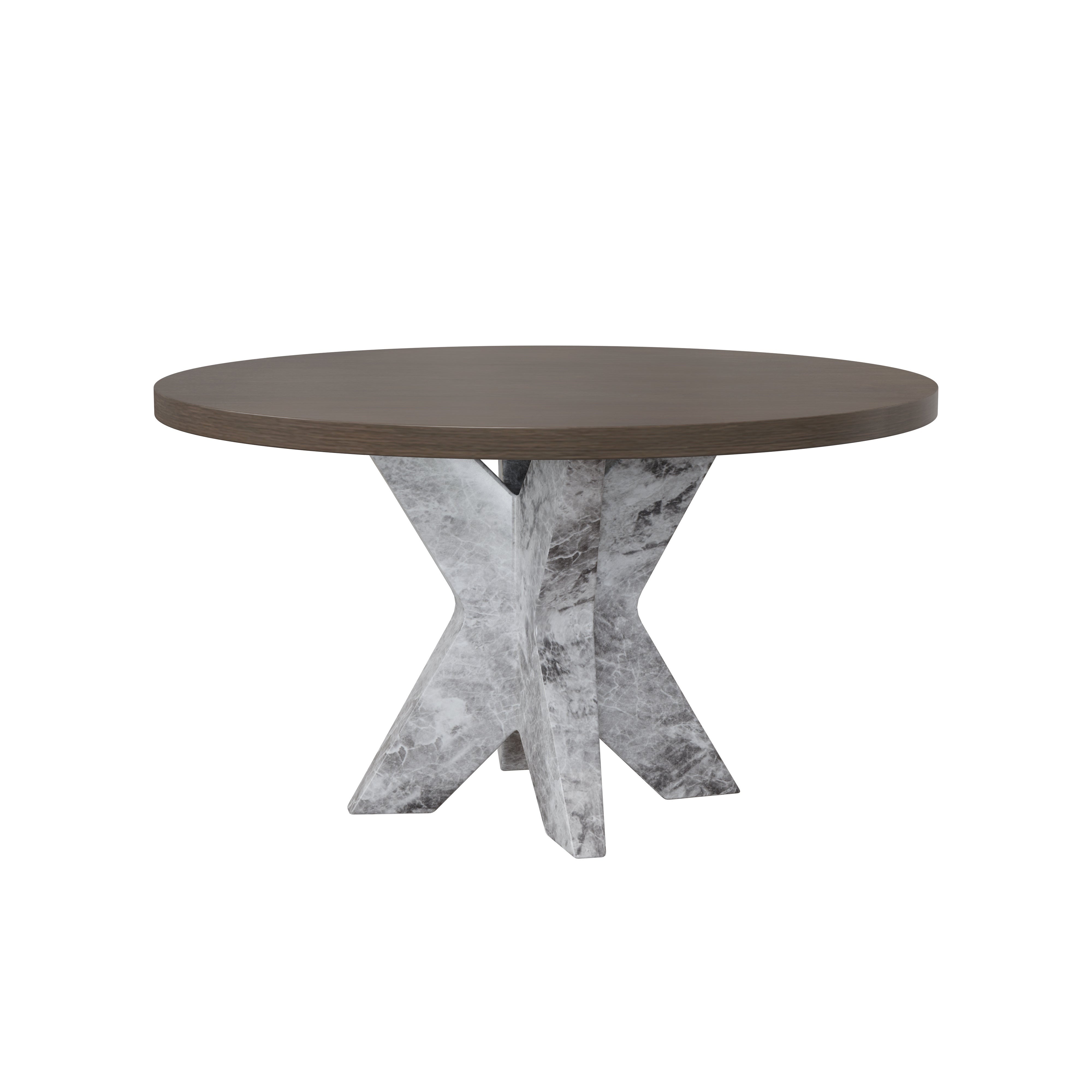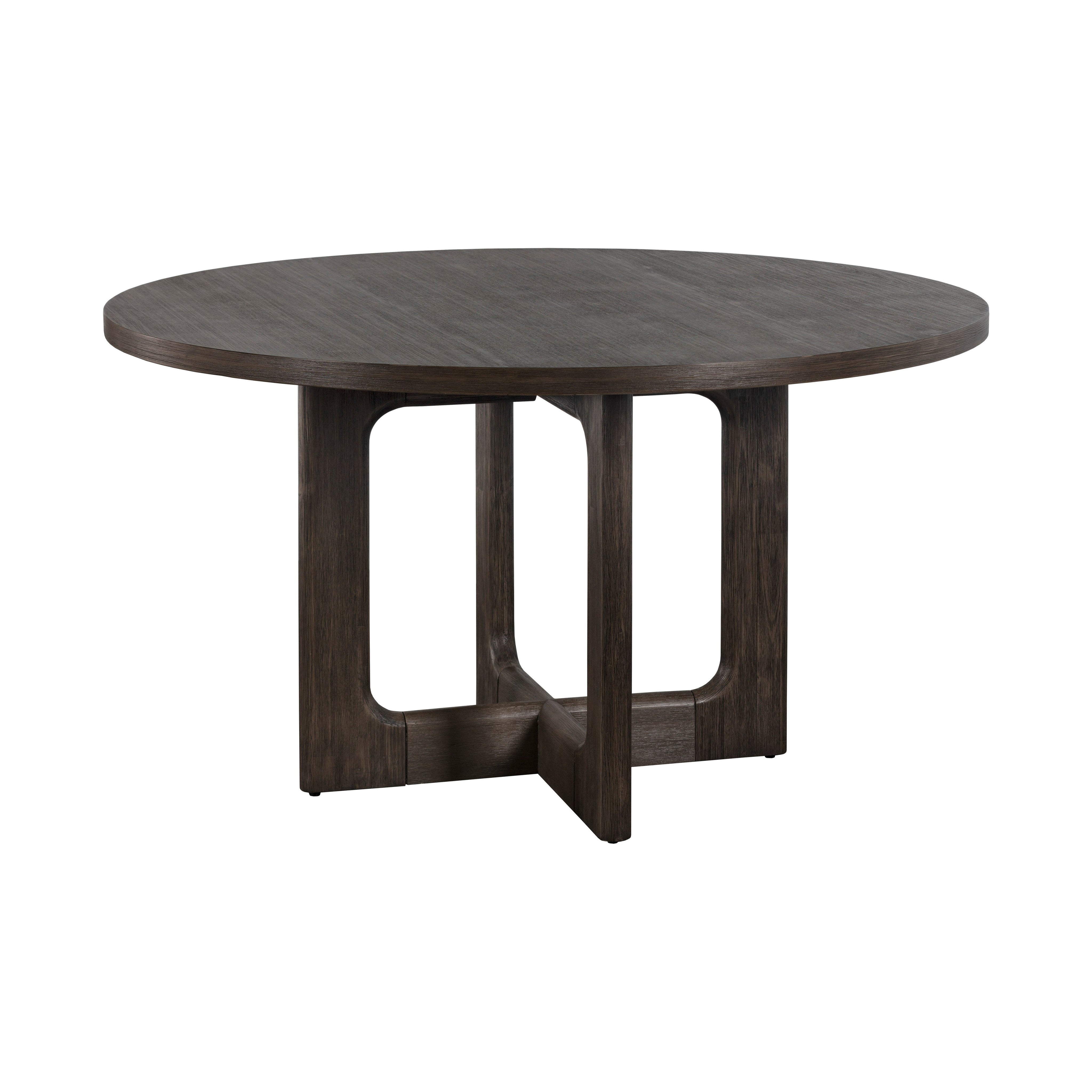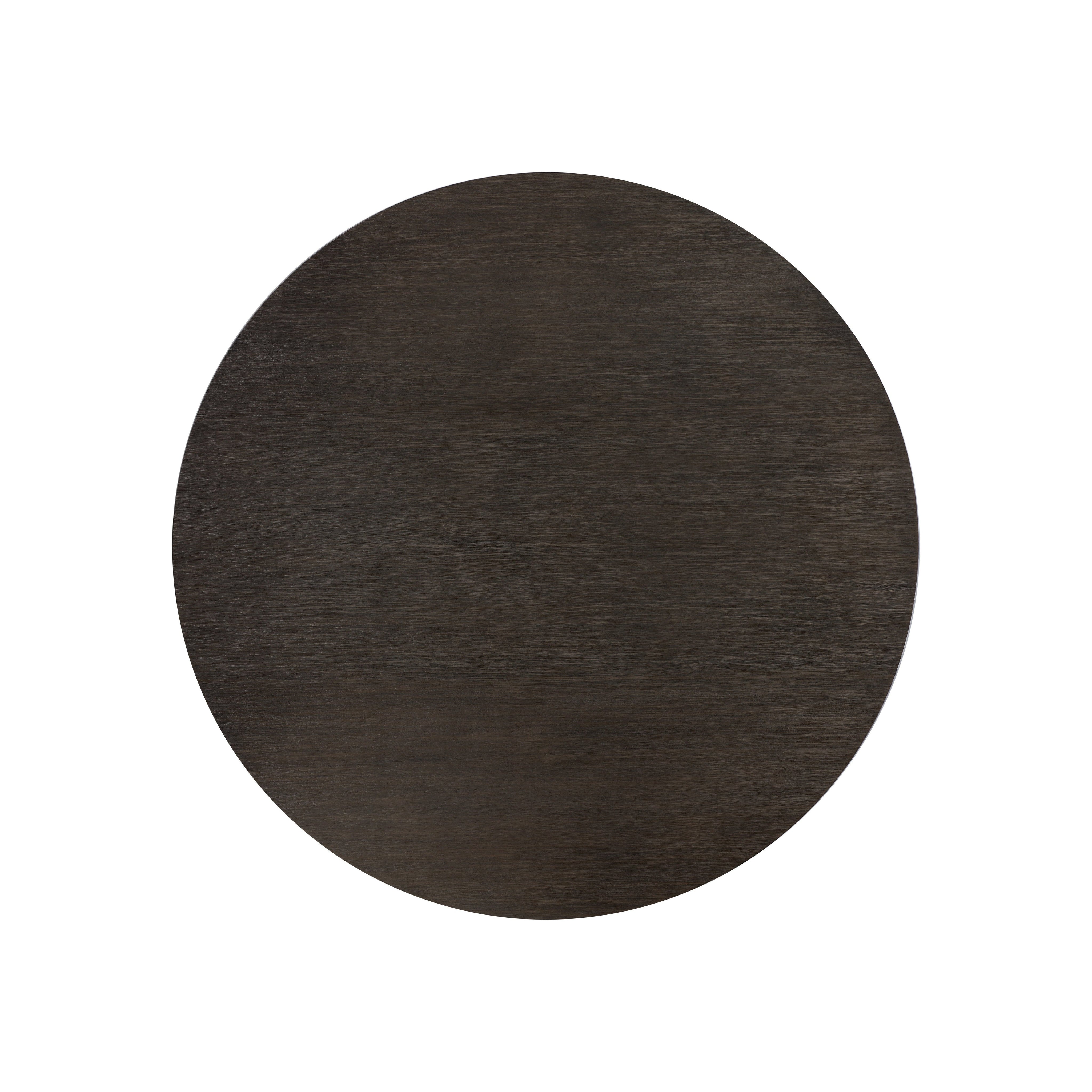 A 55" round dark brown acacia veneer wood dining table top. Intended for use with Cypher dining table bases in a dark brown acacia wood look. As wood is an organic, porous material, these pieces will contain natural variation of texture and may also exhibit fine indentations and cracks. Wood pieces will also display a disparity of colour and grain, and visible knots and burls that add to the character of each piece.