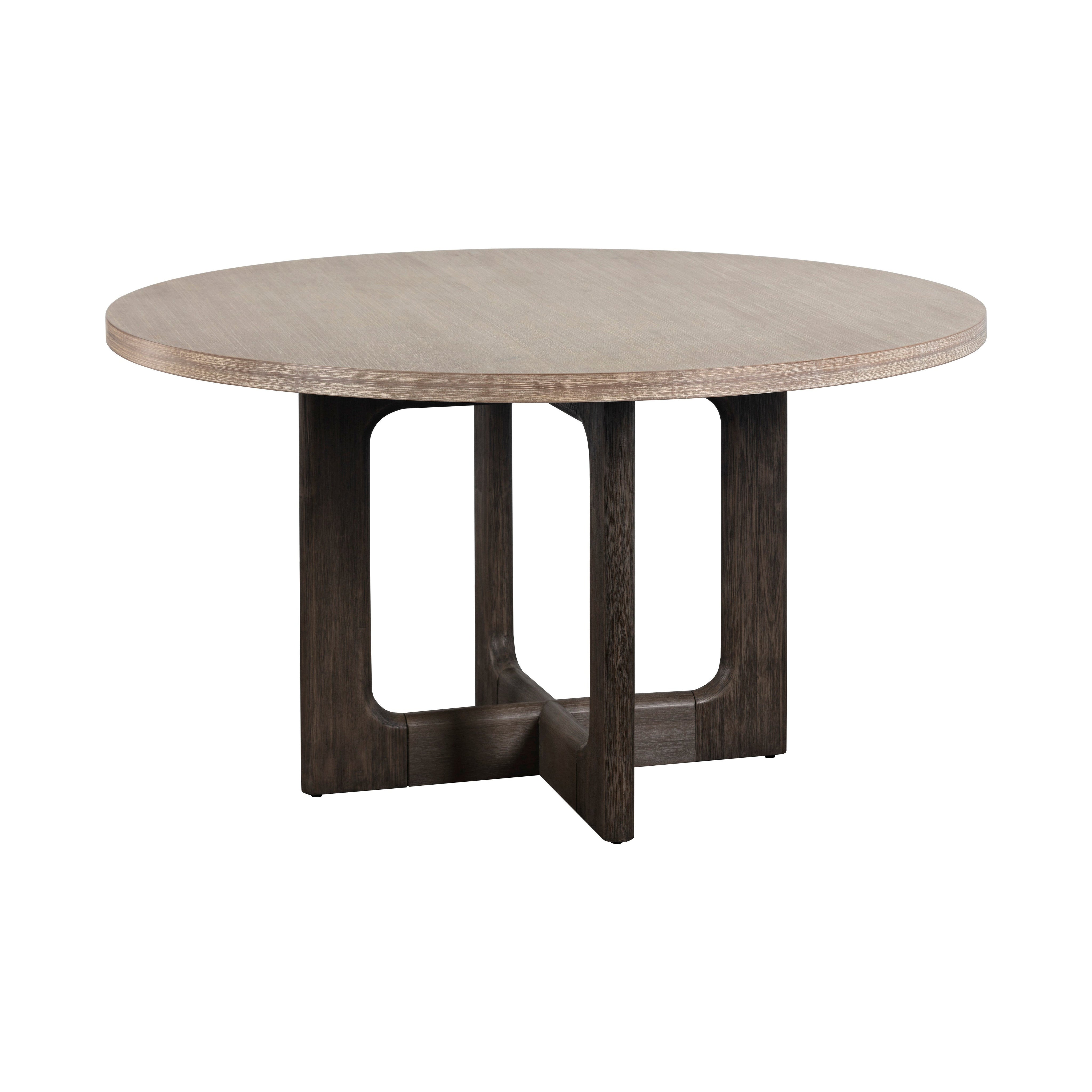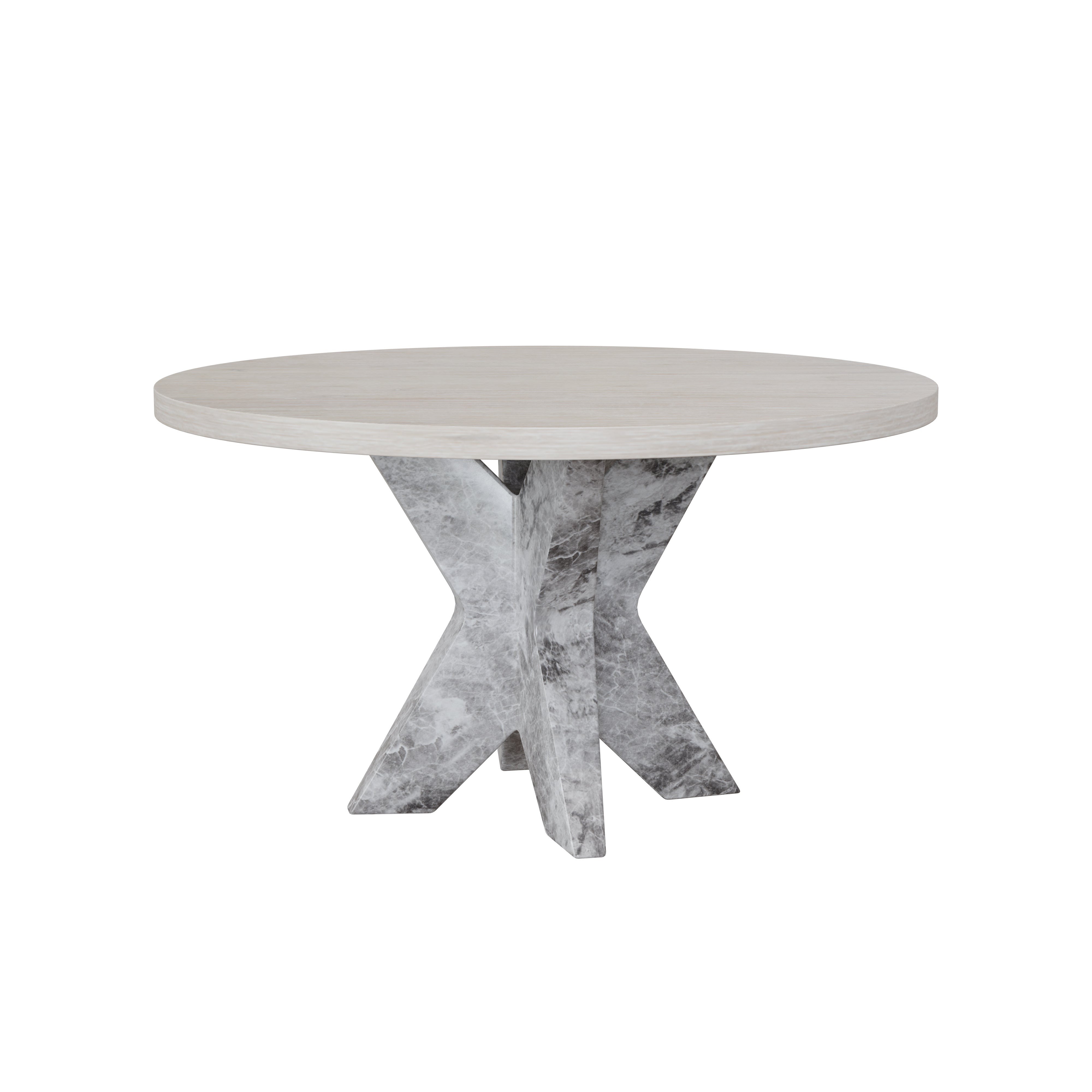A 55" round acacia veneer wood with a brushed white ceruse finish dining table top. Intended for use with Cypher dining table bases in a white marble look. As wood is an organic, porous material, these pieces will contain natural variation of texture and may also exhibit fine indentations and cracks. Wood pieces will also display a disparity of colour and grain, and visible knots and burls that add to the character of each piece.