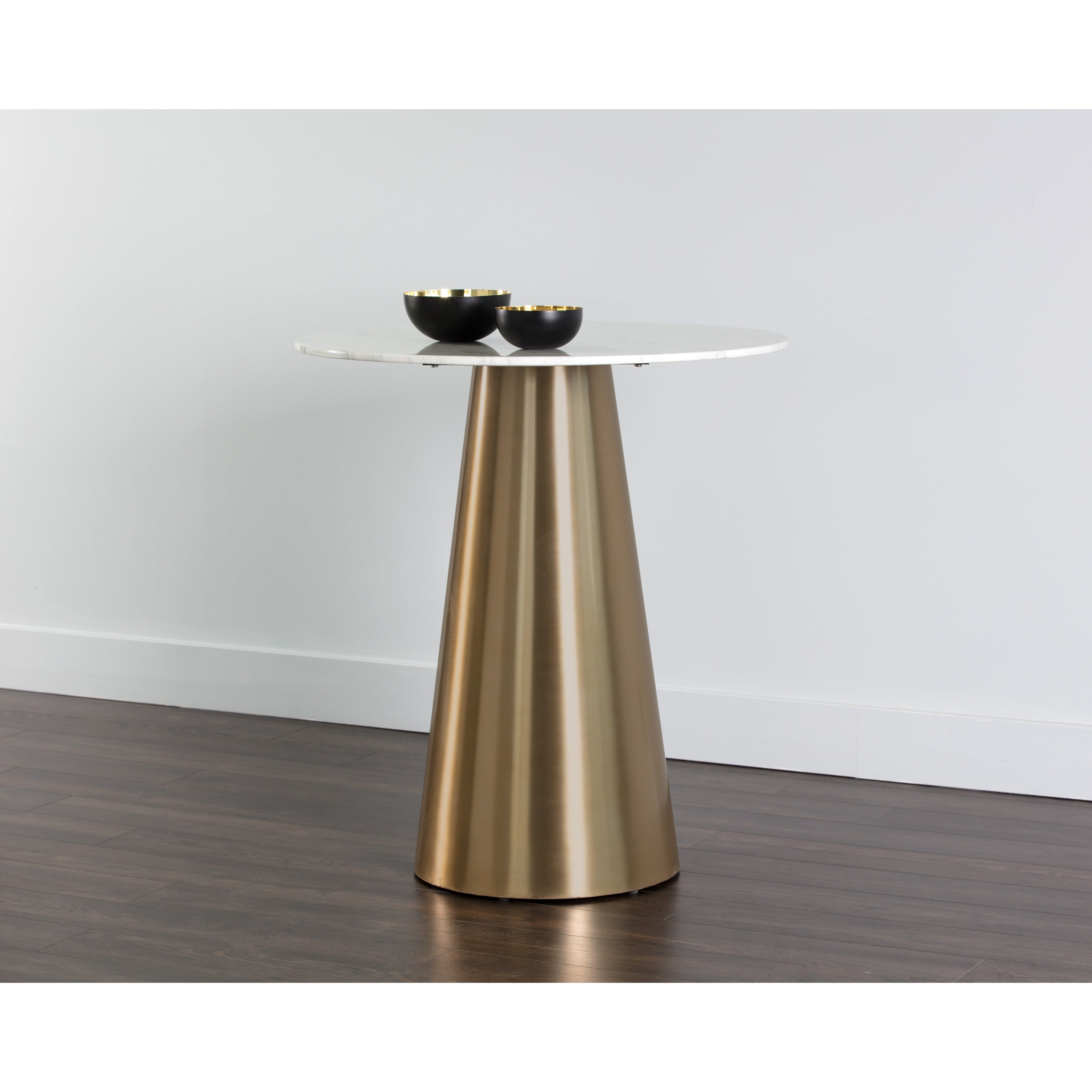 An absolutely stunning tapered bar table. Crafted with a brushed gold finish and a stunning white marble top to elevate any contemporary dining or lounge space. Suitable for residential and commercial environments. As marble is a natural material, unique veining, pitting, fissures, micro-cracks and colour variations are all characteristics that add to the uniqueness and beauty of each piece.