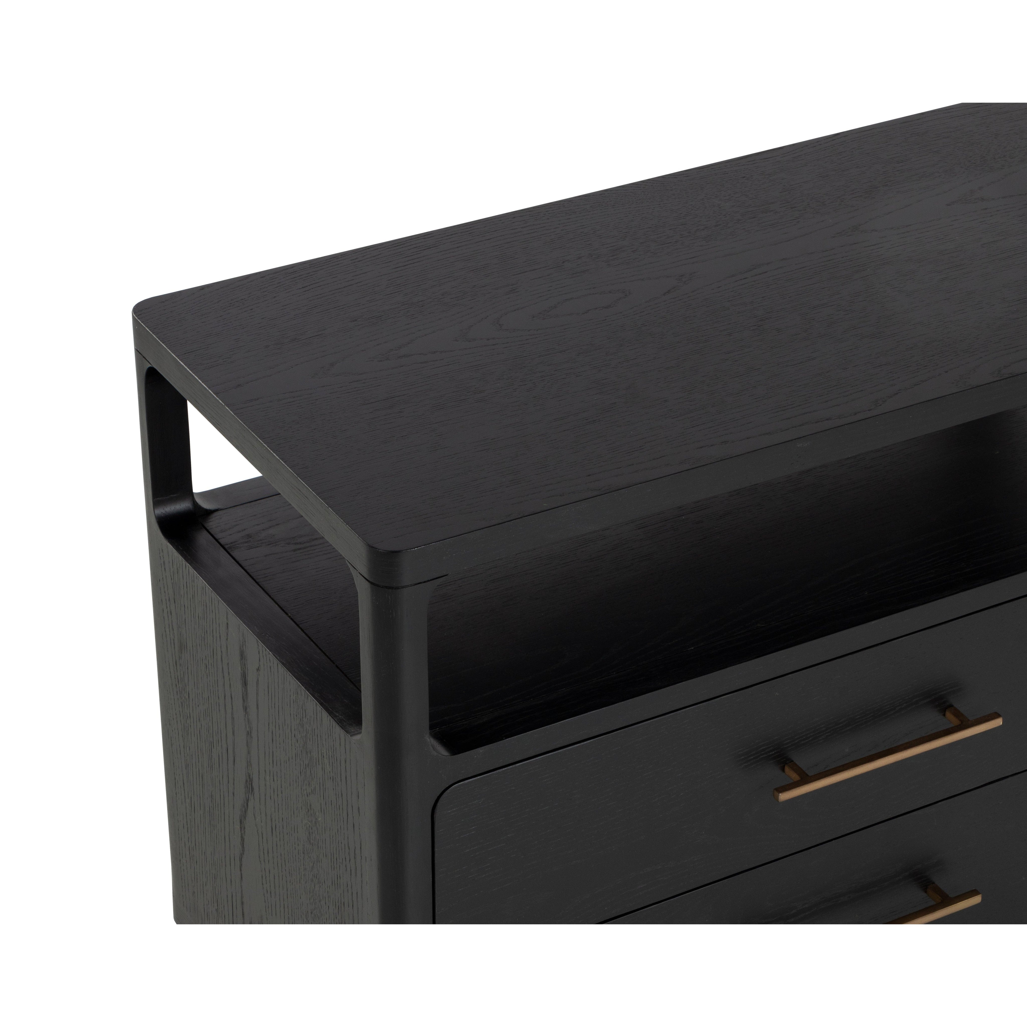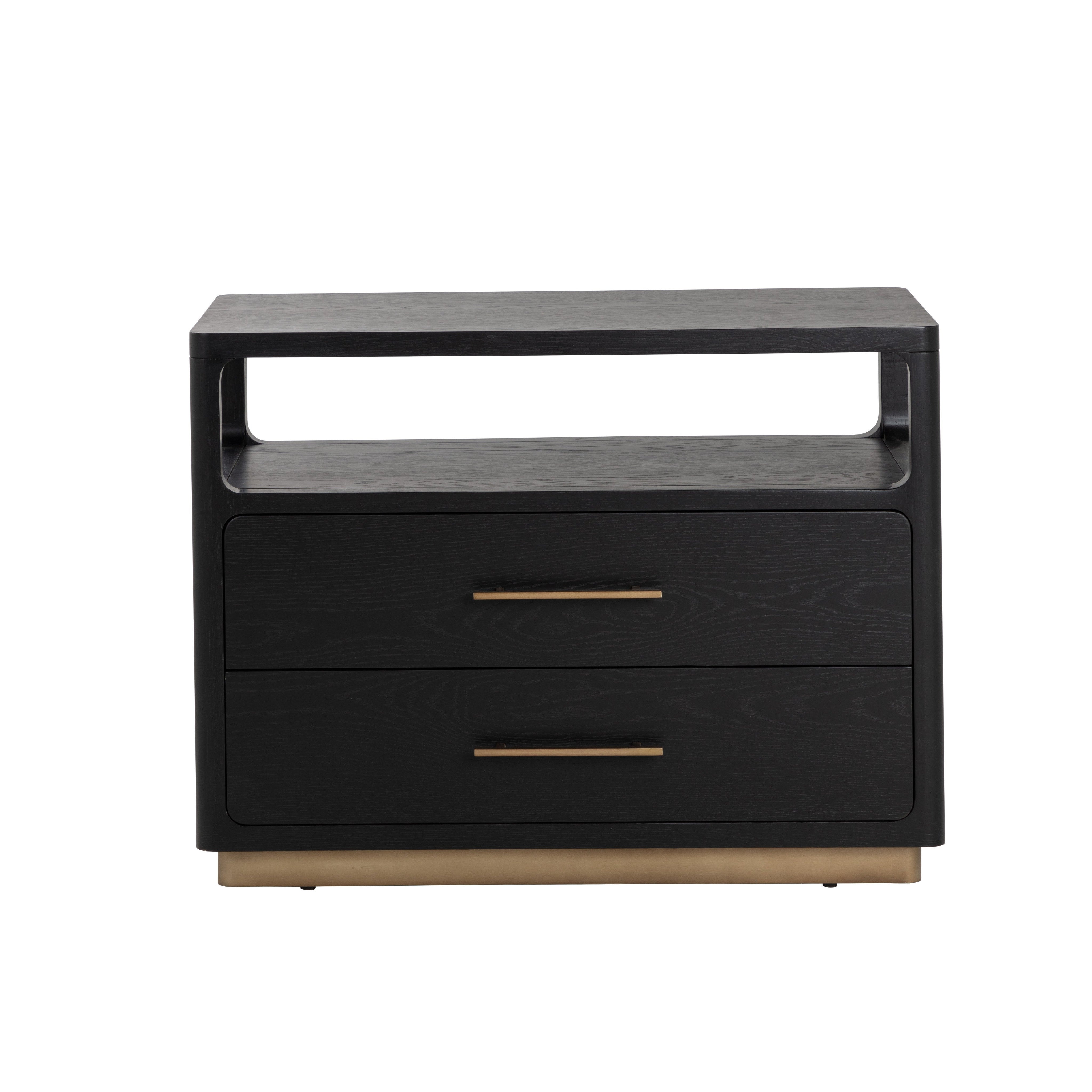 Clean lines lend the Danette Nightstand its minimalist silhouette. Crafted with black solid oak wood and oak veneer that draws attention to the warm brass hardware. An open top shelf provides extra space for added decor.