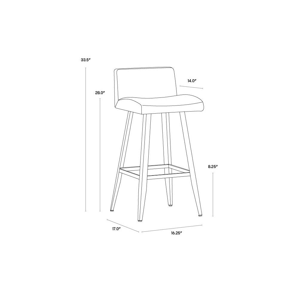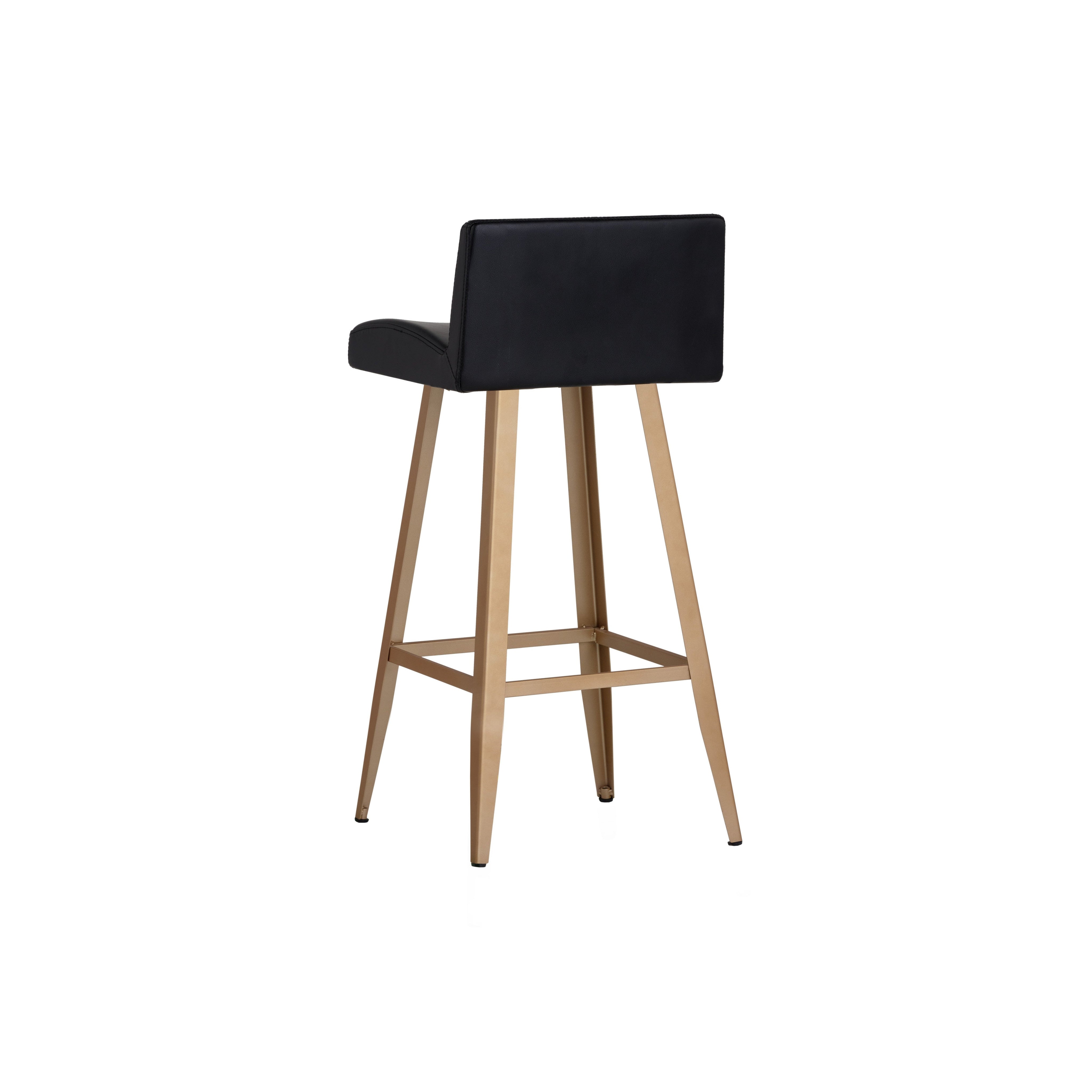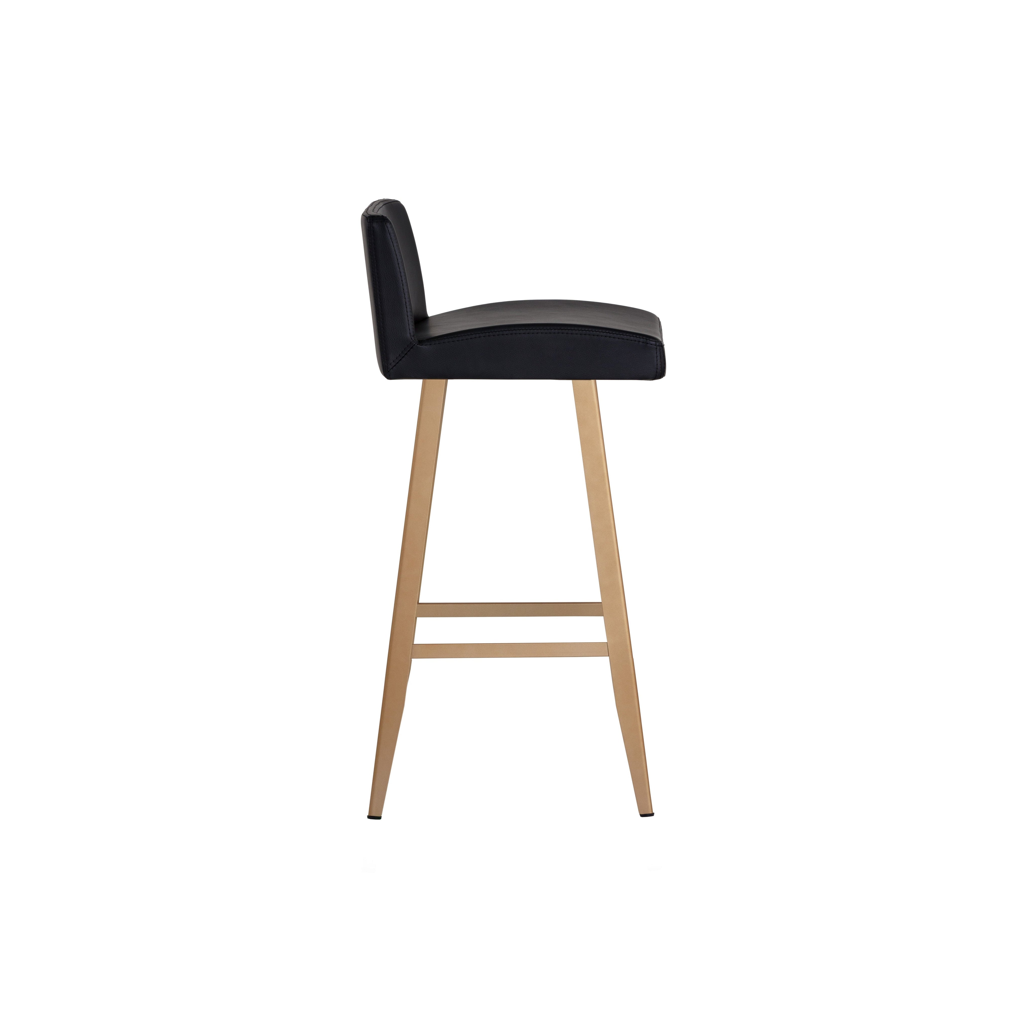 A chic counter stool featuring a low seatback upholstered in antique black faux leather and finished with a brushed champagne gold steel frame. Suitable for various dining, kitchen and bar spaces of all sizes. Champagne gold steel has a copper undertone. Handle With Care: This design has been crafted with faux leather. Faux leather is manufactured to reflect the natural characteristics of leather; as such, colour variations, markings, wrinkles, grooves, and light scratches are appreciated characteristics. No two pieces will be alike. Visit our Product Care page for more information on how to ensure the lasting beauty of this piece.