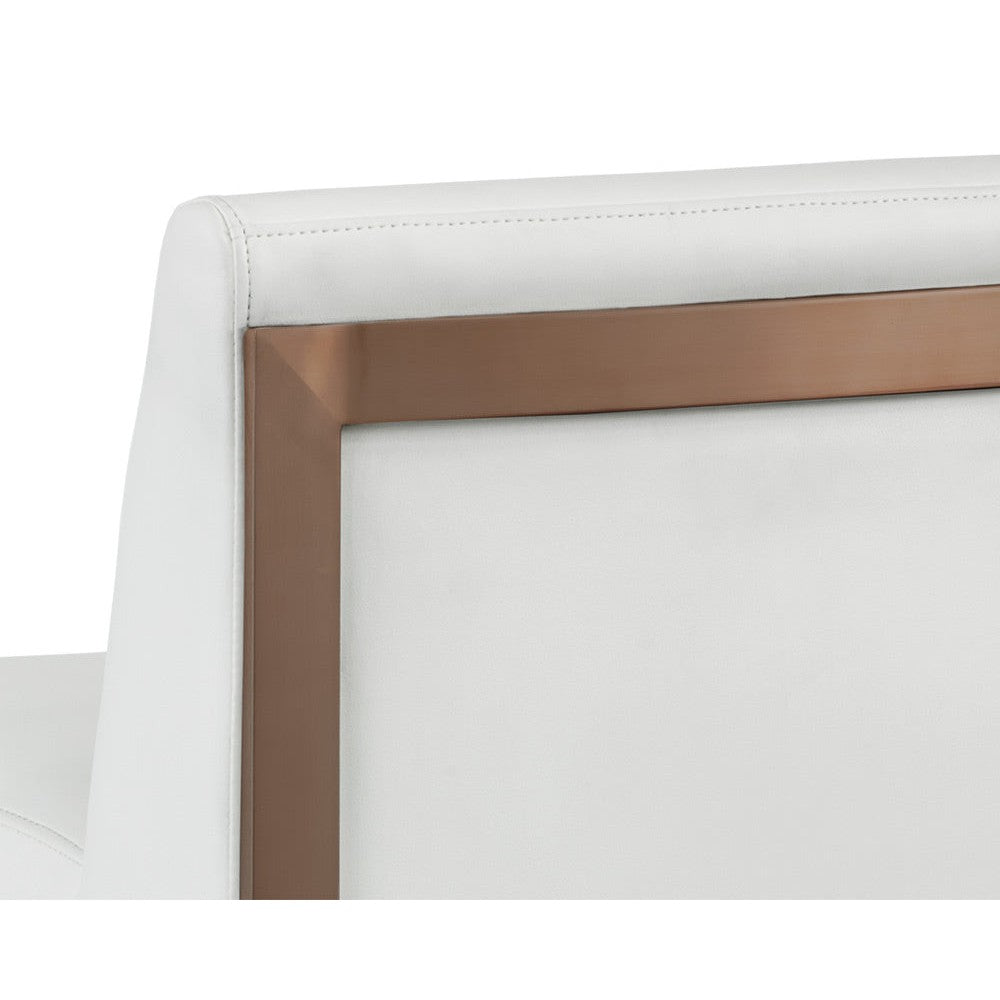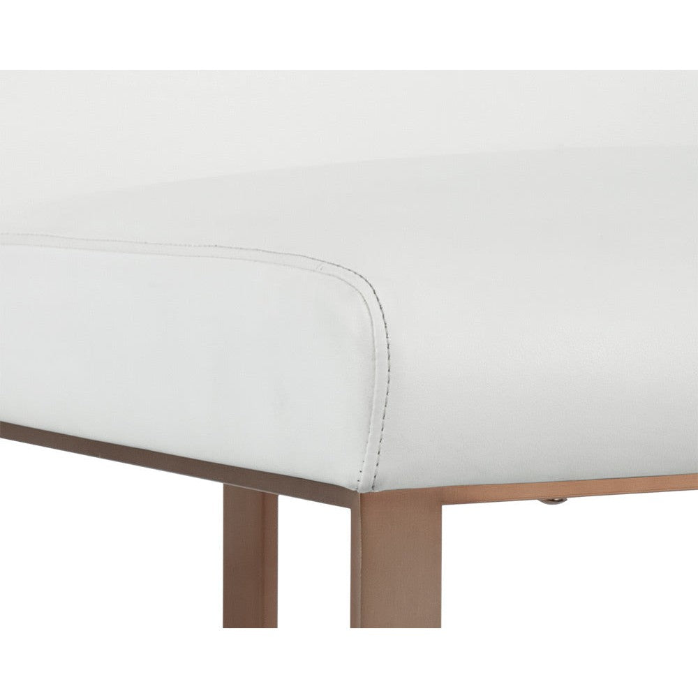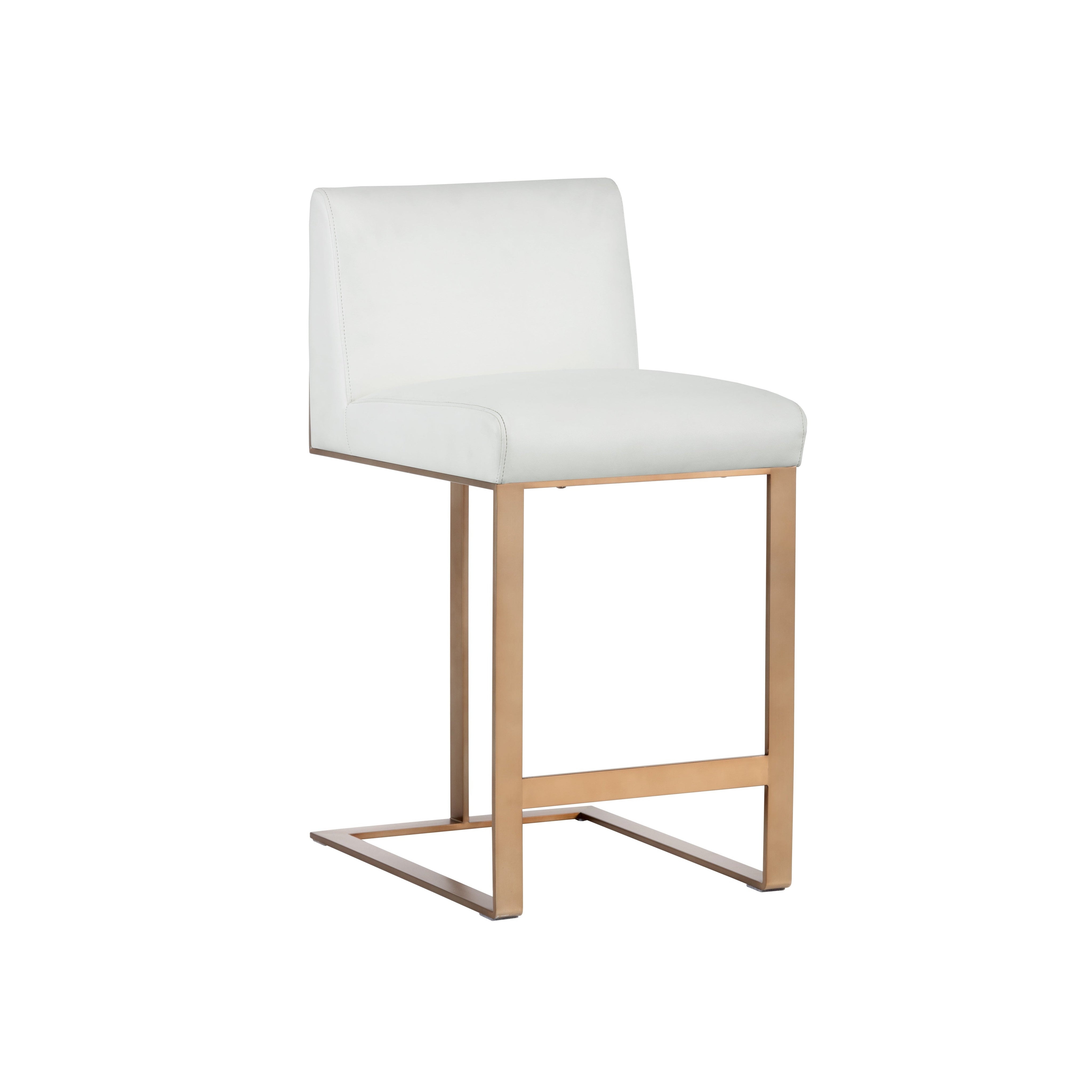 Stunning from all angles, this counter stool features an exposed brushed antique brass steel frame with a footrest. A streamlined seat in cantina white, black and magnetite bonded leather completes the look. Perfect for restaurants, bars and residential spaces. Suitable for various dining, kitchen and bar spaces of all sizes.