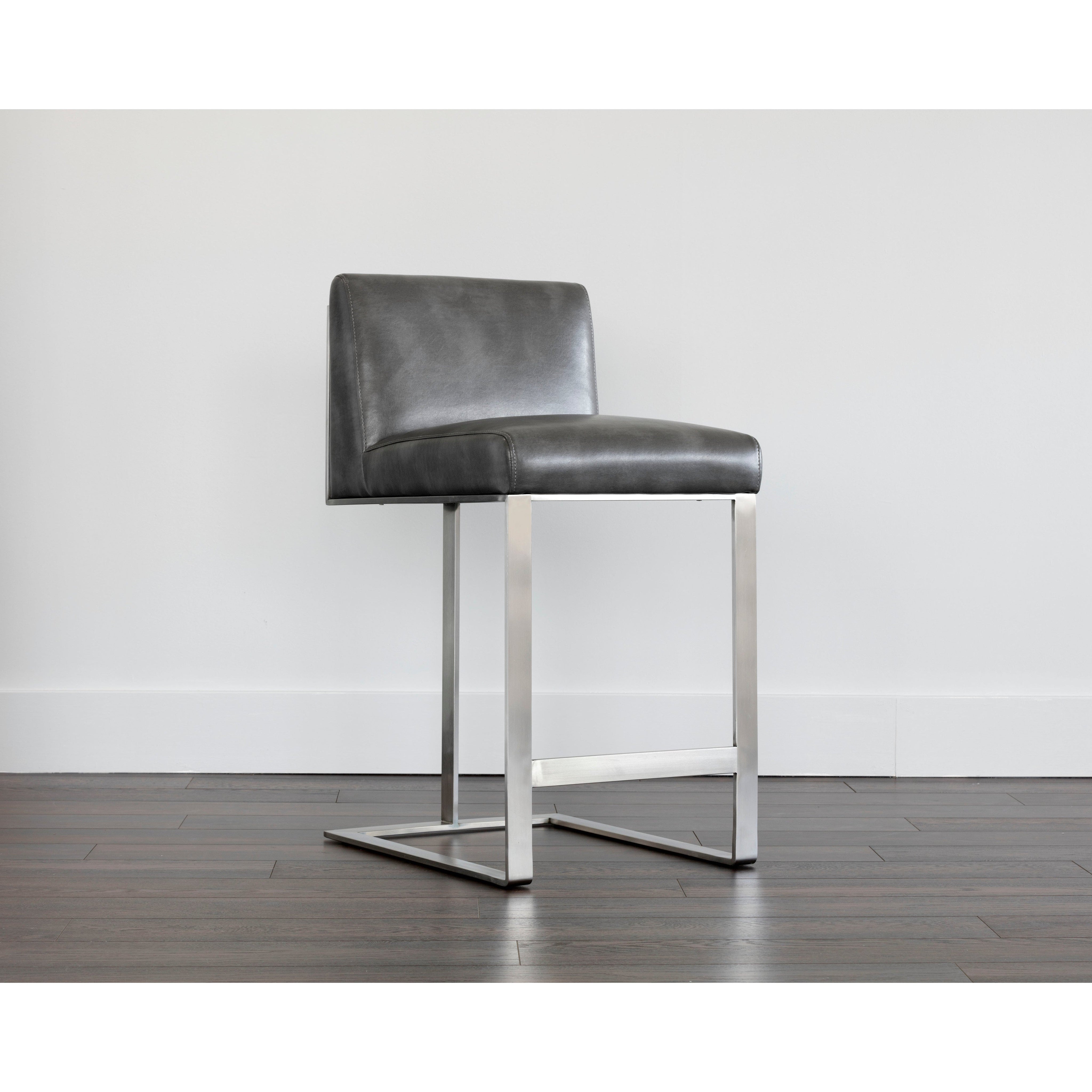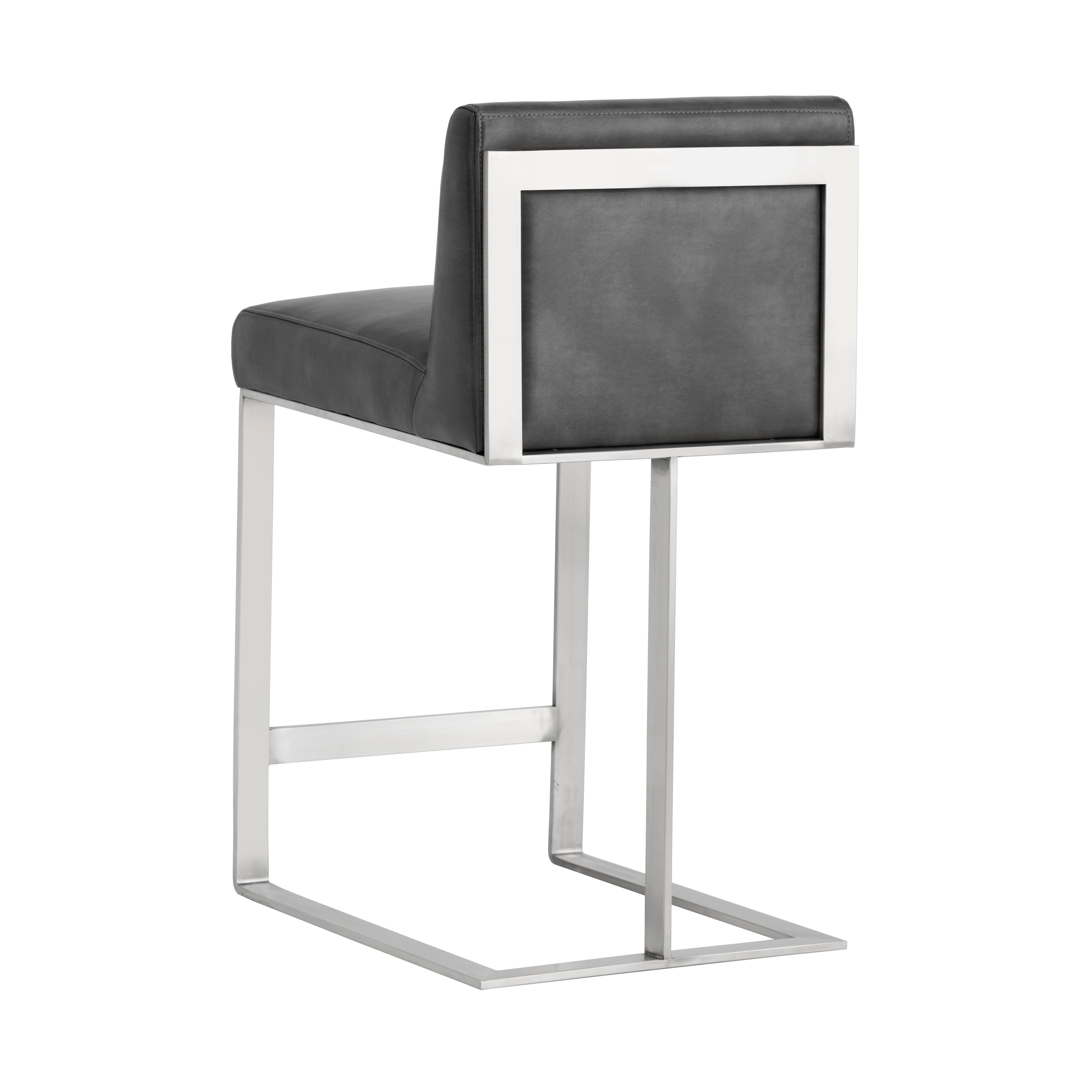 Stunning from all angles, this counter stool features an exposed brushed stainless steel frame with a footrest. A streamlined seat in cantina white, black and magnetite bonded leather completes the look. Perfect for restaurants, bars and residential spaces. Suitable for various dining, kitchen and bar spaces of all sizes. Handle with Care: This design has been crafted with bonded leather. Bonded leather is a blend of reconstituted leather and synthetic materials crafted to reflect the natural characteristics of leather; as such, colour variations, markings, wrinkles, grooves and light scratches are acceptable and appreciated characteristics. No two pieces are alike. Visit our Product Care page for more information on how to ensure the lasting beauty of this piece.