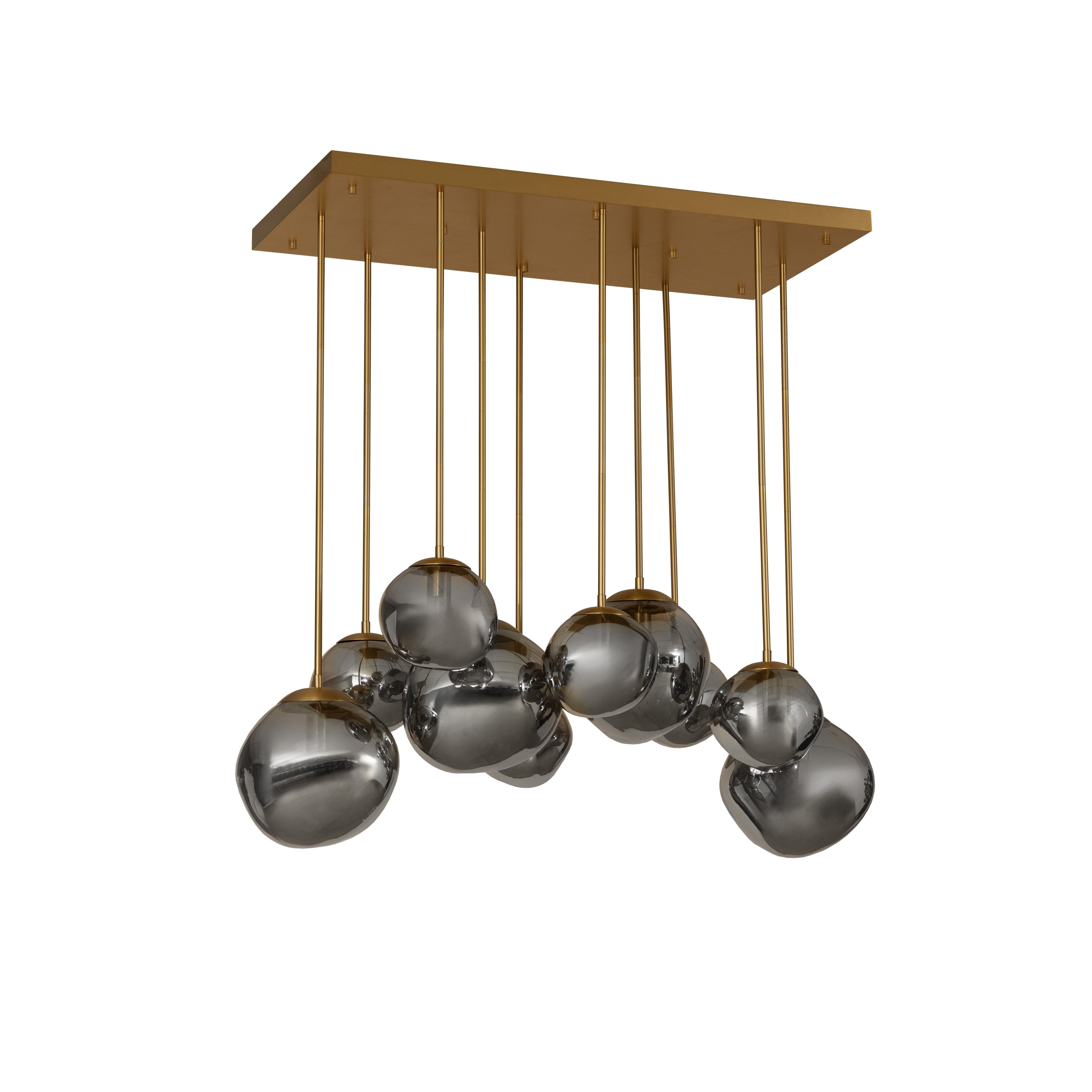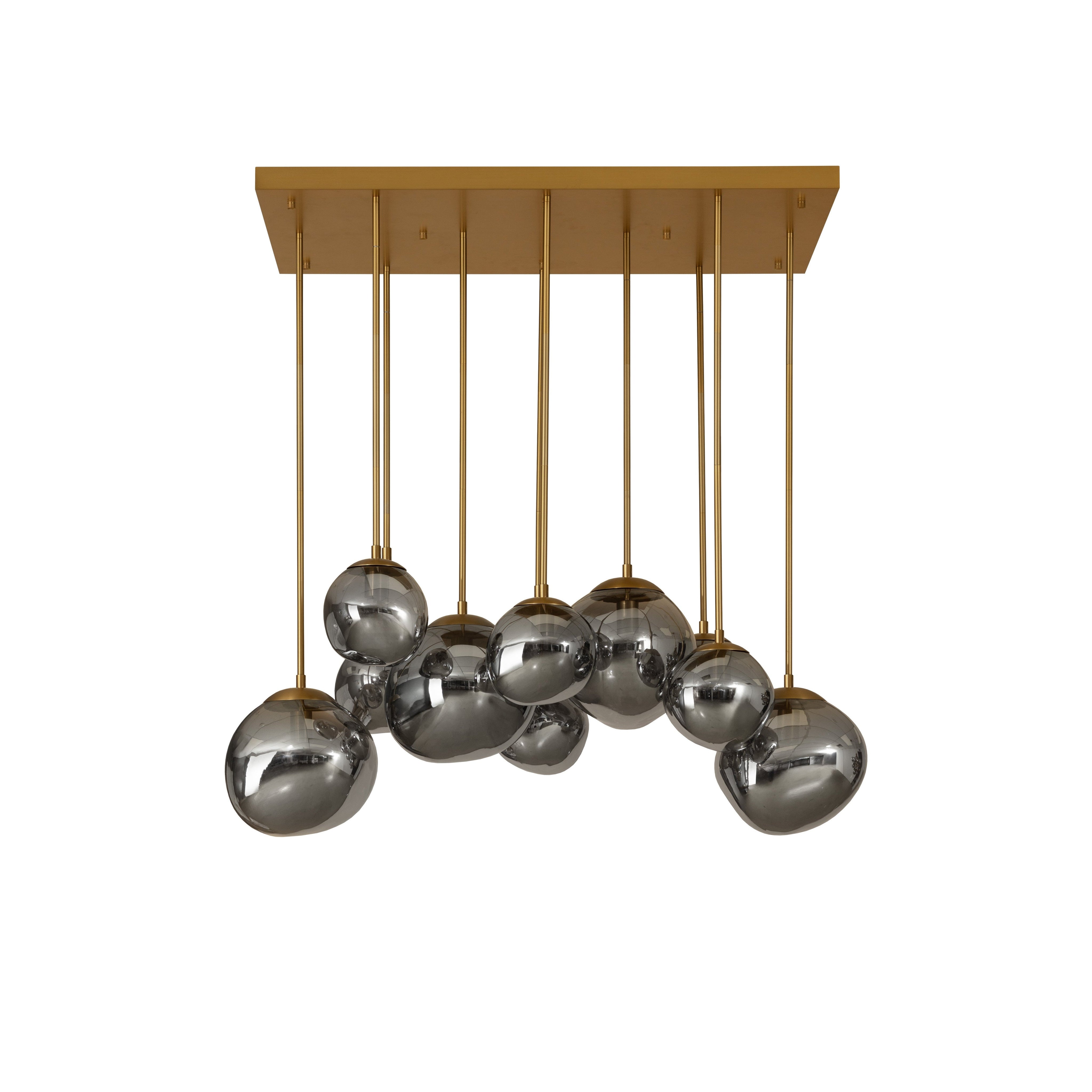 The Dionis Chandelier combines the refined look of hand-blown glass with contemporary appeal. Suspended from a brushed gold iron fixture are glass globes in dual sizes that are artfully arranged to produce a lustrous glow.