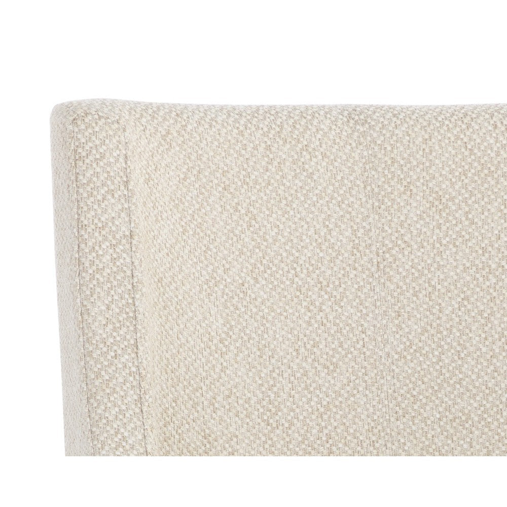 With its clean and modern design, this dining chair is a stunning addition to any dining room space. Stocked in our textured monumental oatmeal fabric and completed with powder-coated stainless steel legs in an antique brass finish.