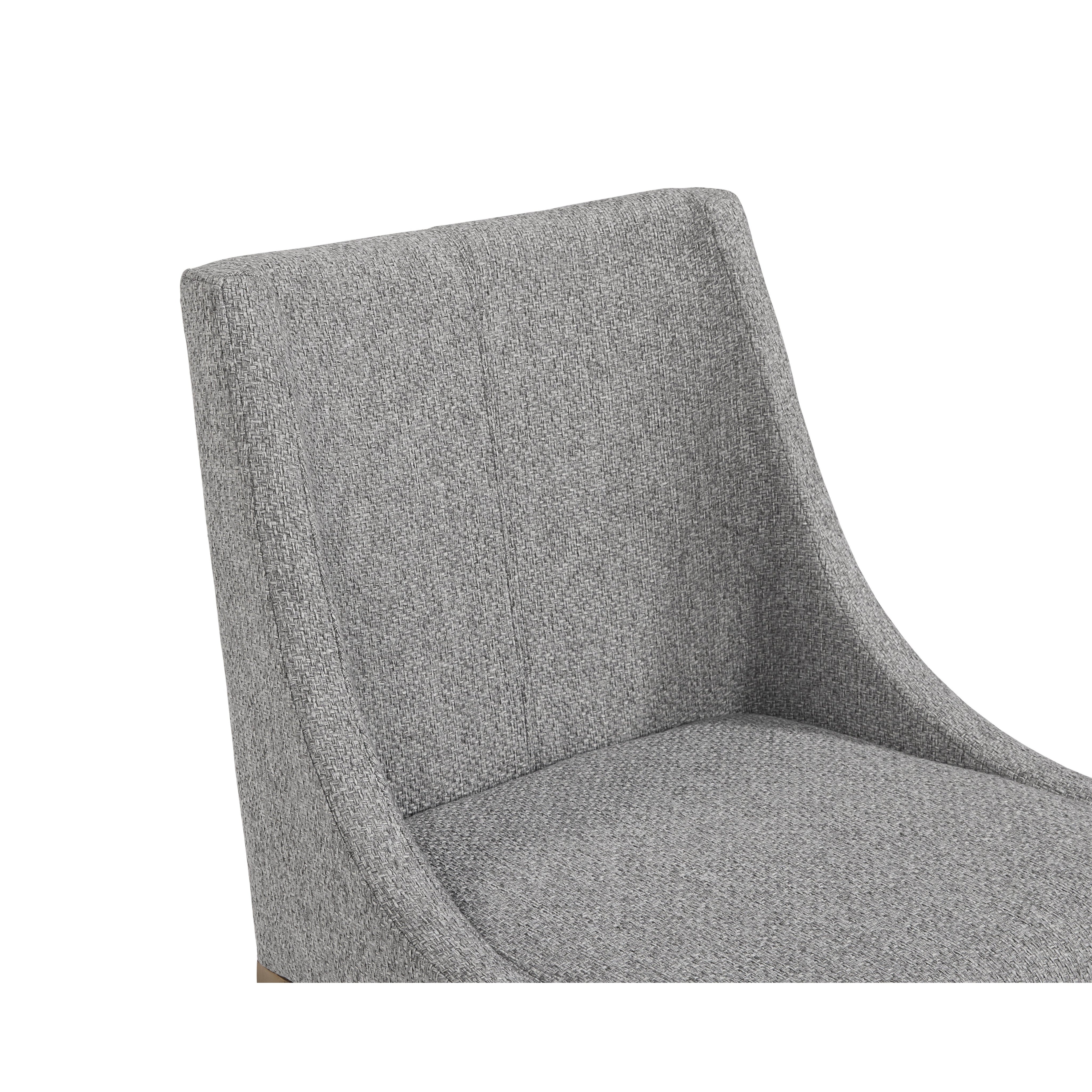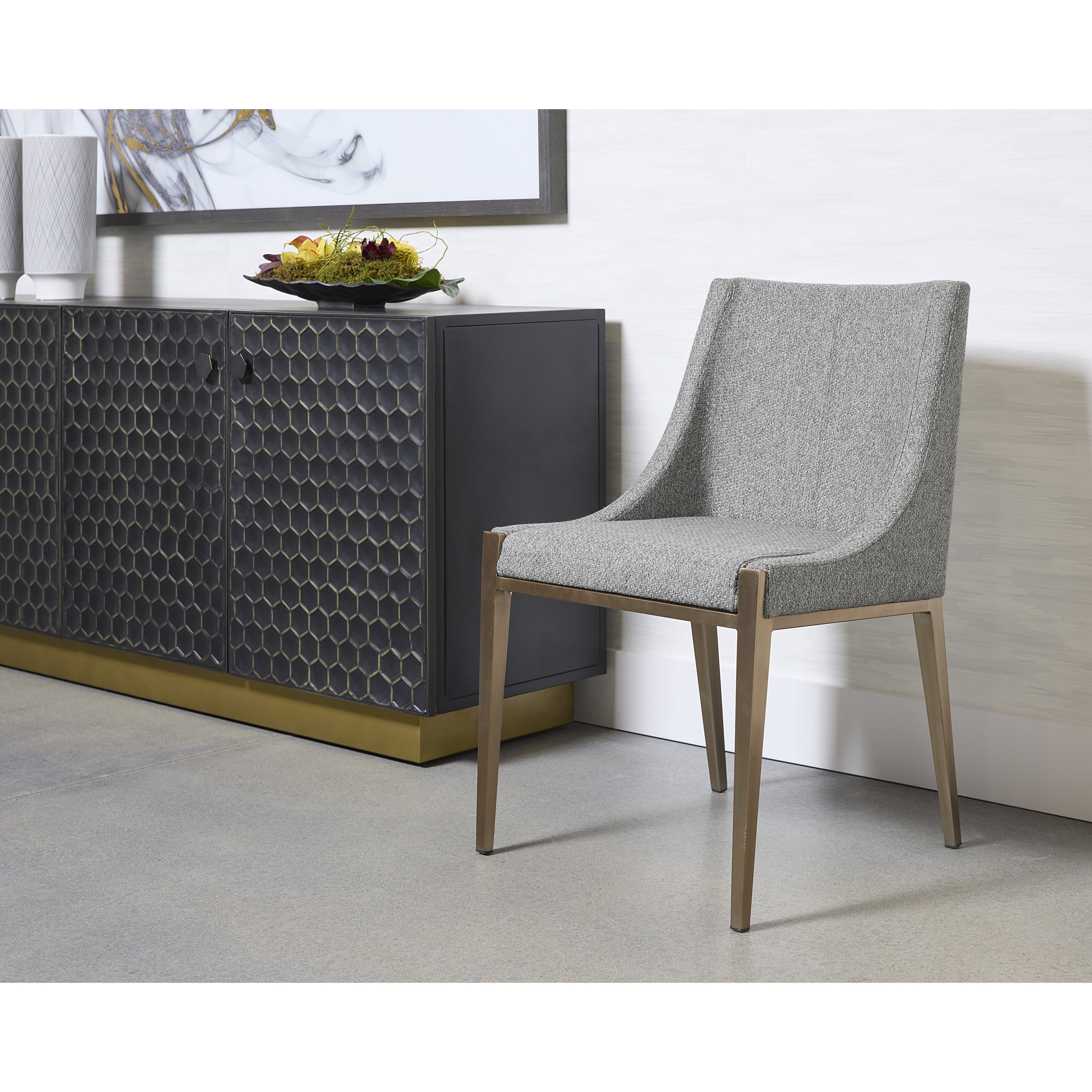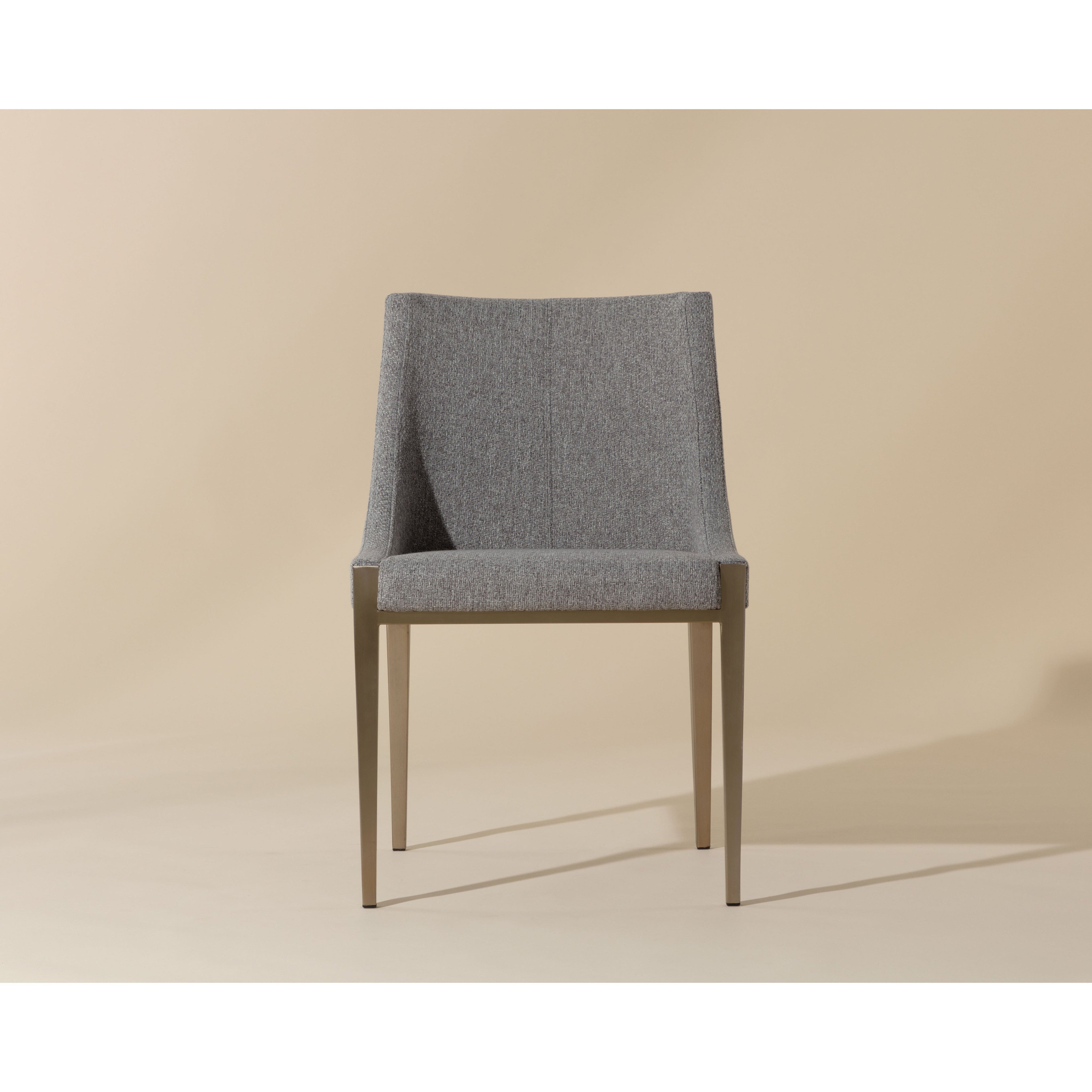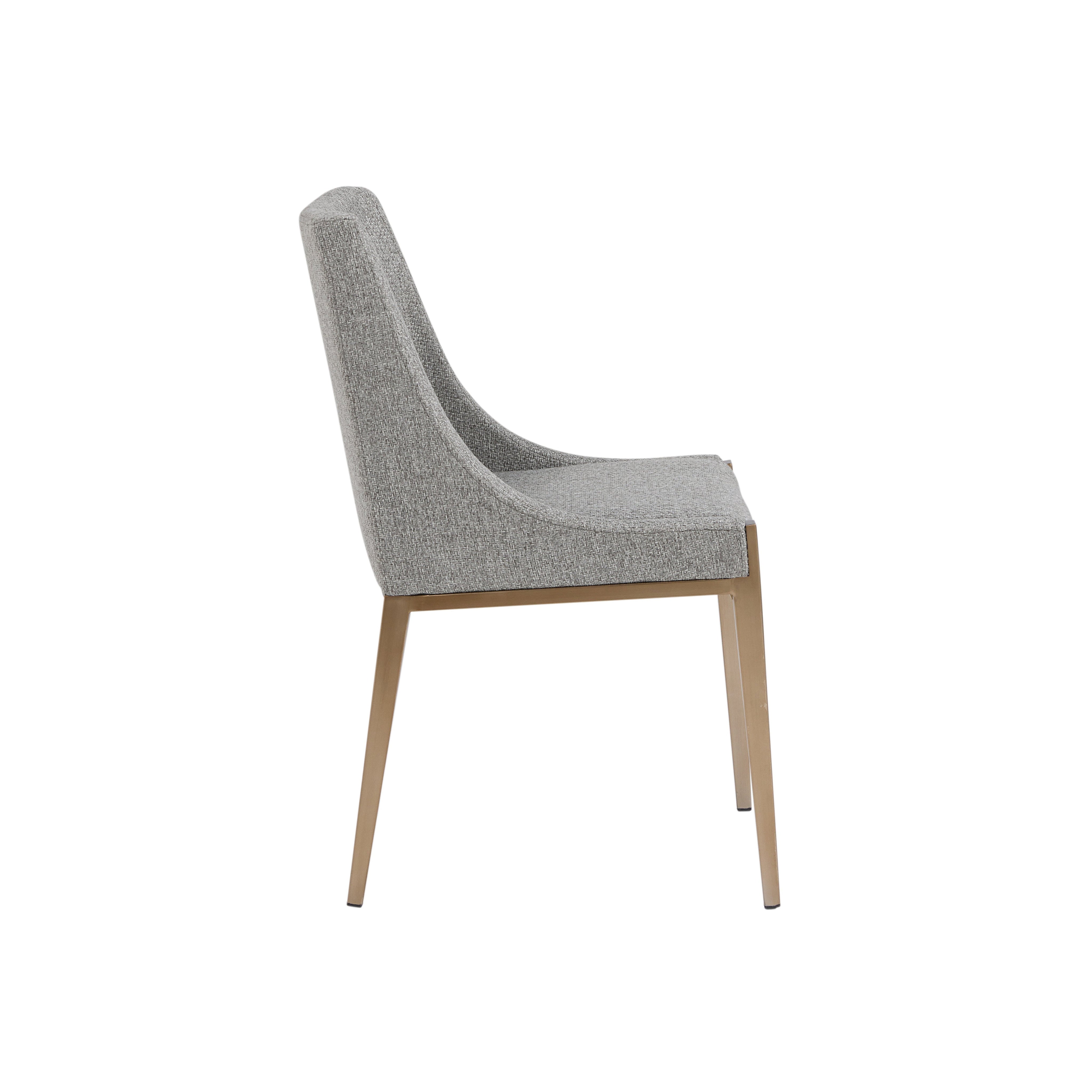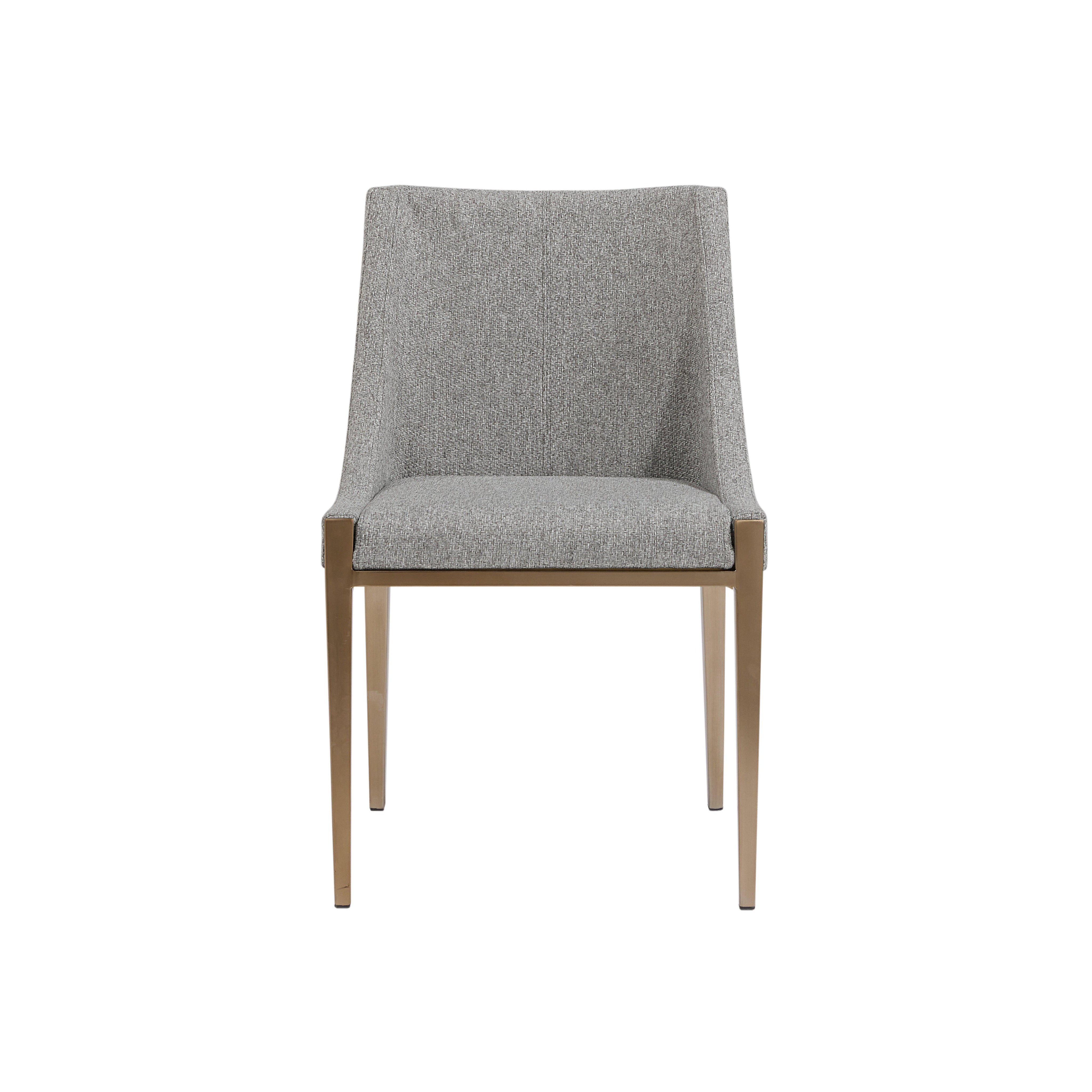 With its clean and modern design, this dining chair is a stunning addition to any dining room space. Stocked in our textured monumental pebble fabric and completed with powder-coated stainless steel legs in an antique brass finish.