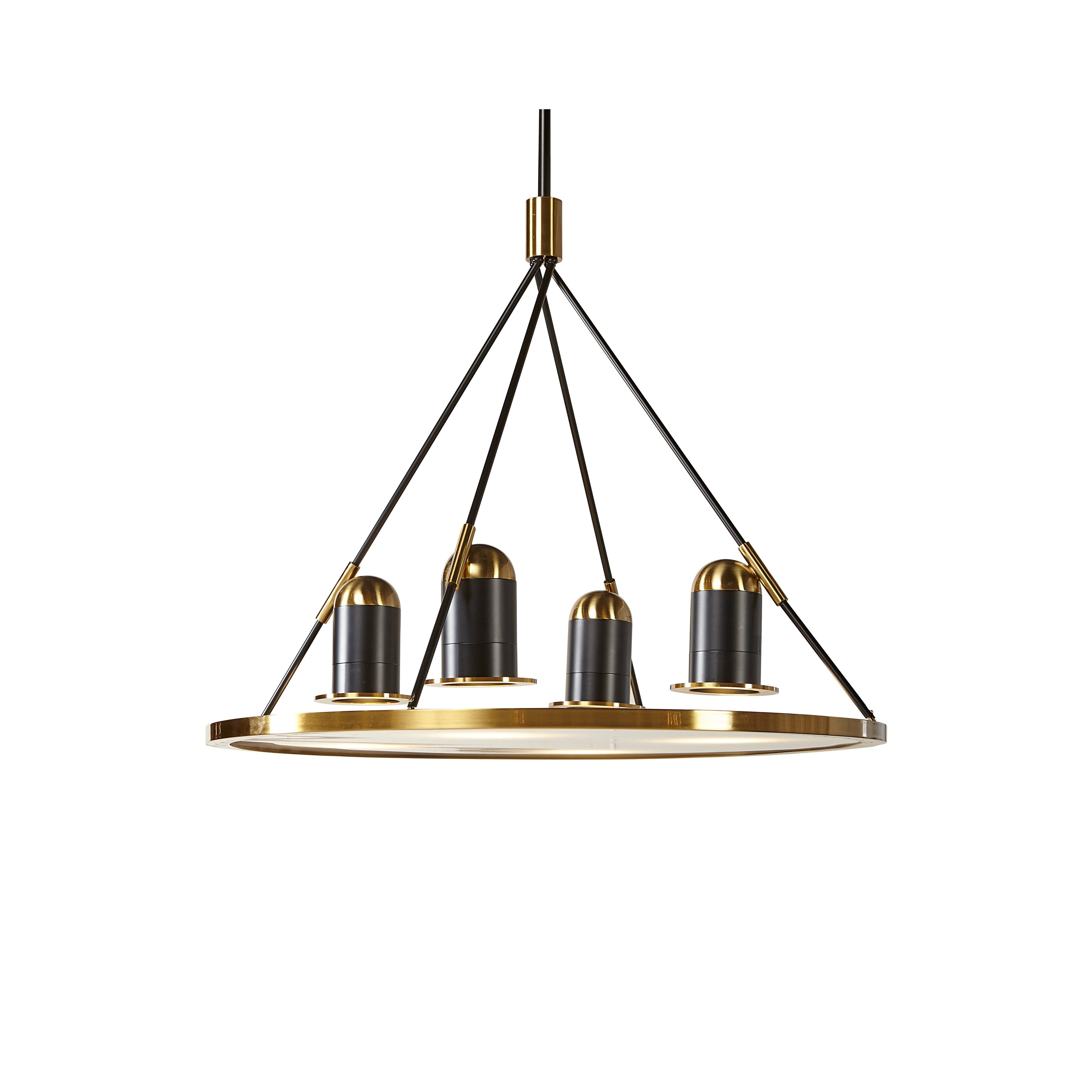 Add drama to any space with this spectacular chandelier. Features four light shades in matte black with antique brass plating, and completed with a large, clear round glass lens.