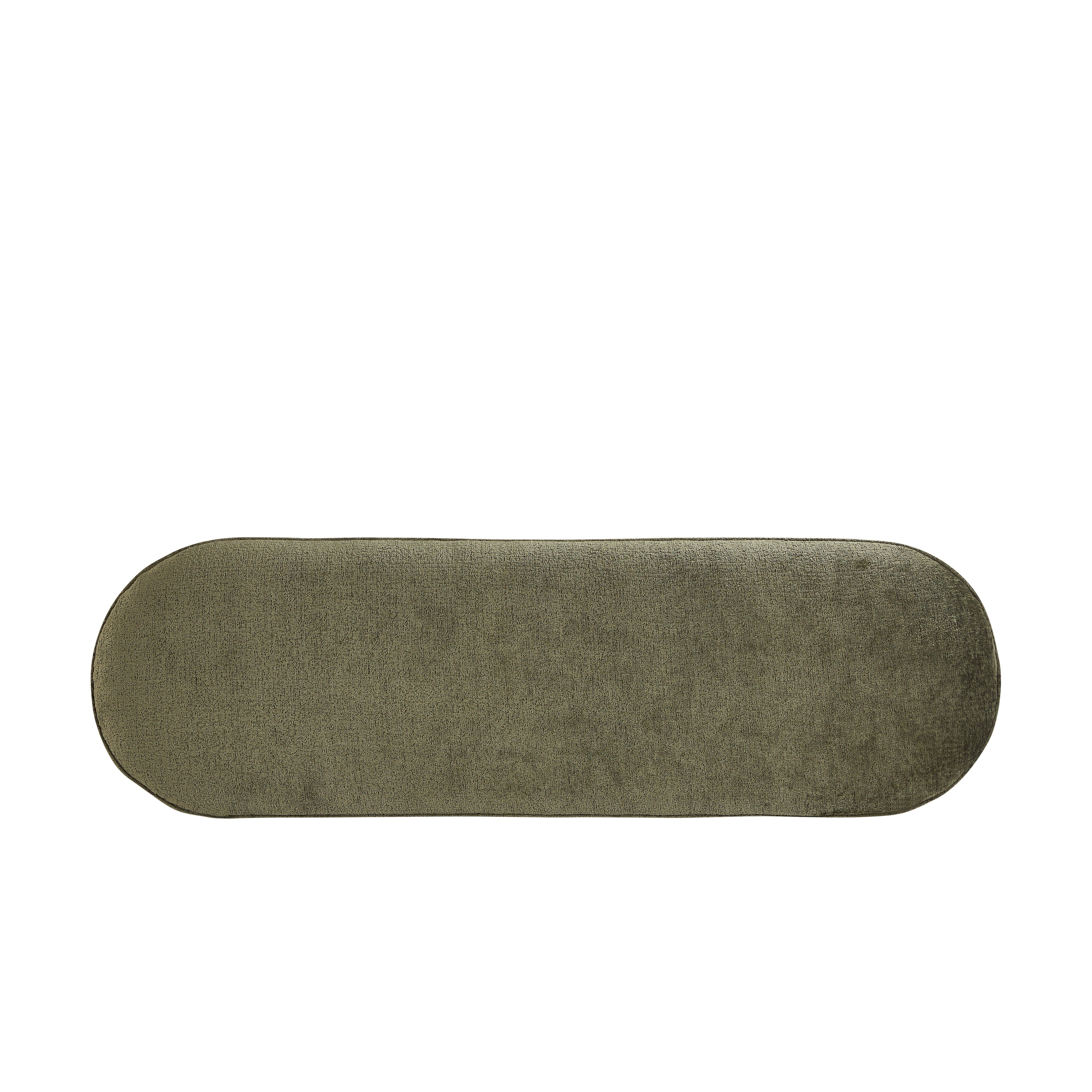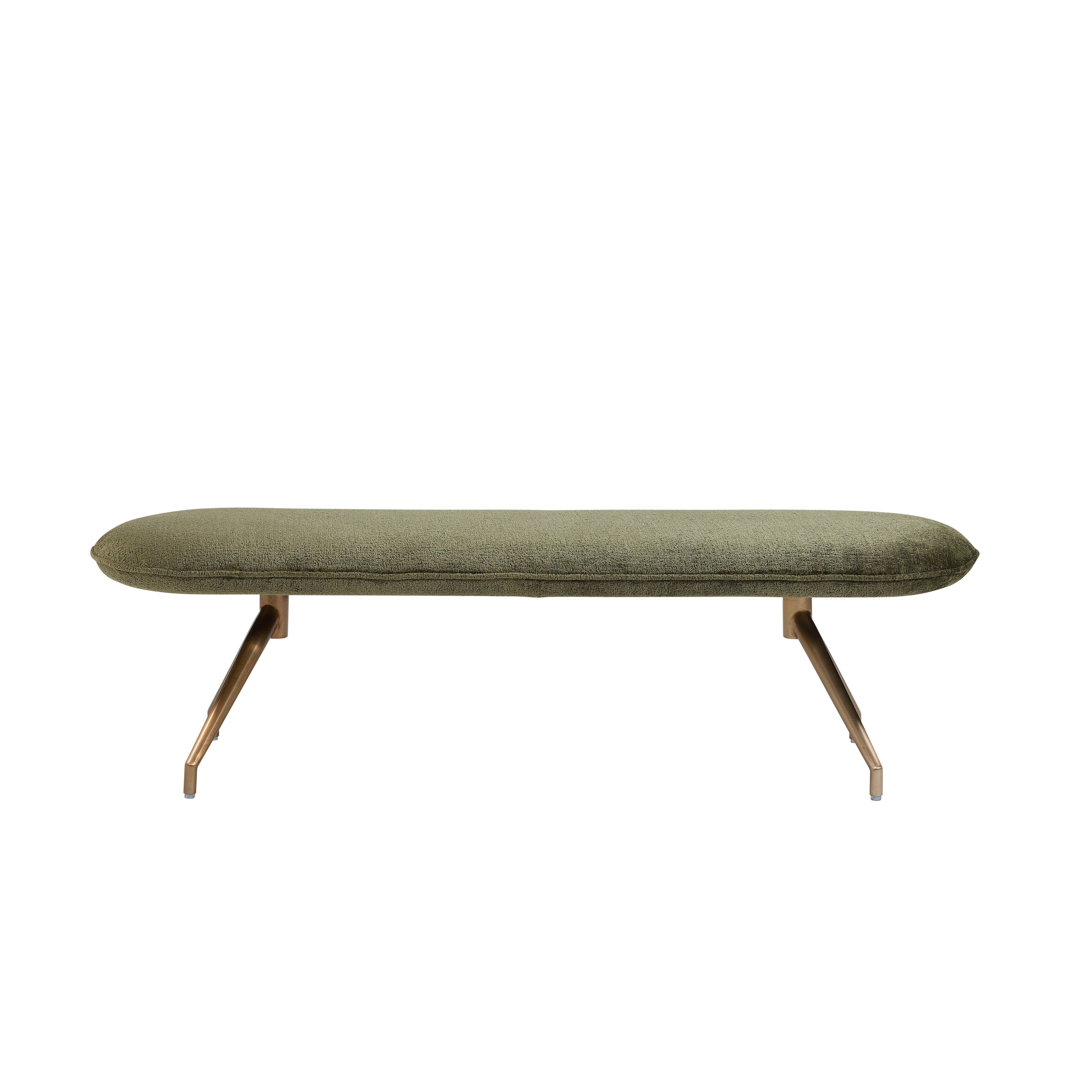 With a stunning oval design, this modern bench will add style and function to any space. Stocked in bergen olive fabric and completed with an antique brass powder coated stainless steel base.