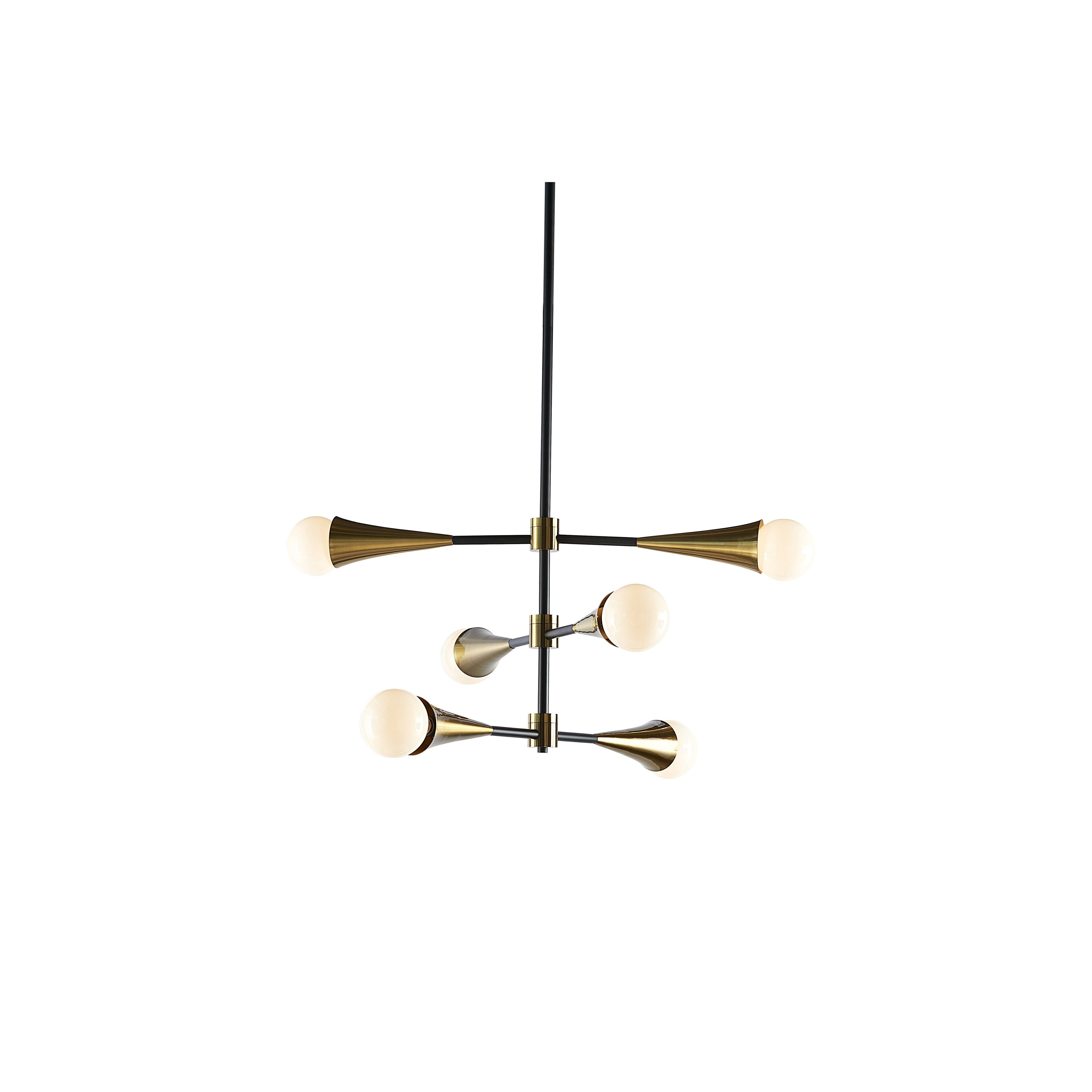 Create intrigue and illumination in living and dining spaces with this modern sputnik-style ceiling light. Features three adjustable arms with 360 degrees horizontal swivel. Crafted from iron with black and brass finishes. Install multiples for a dramatic look. Requires 6 light bulbs and maximum 60 watts each.