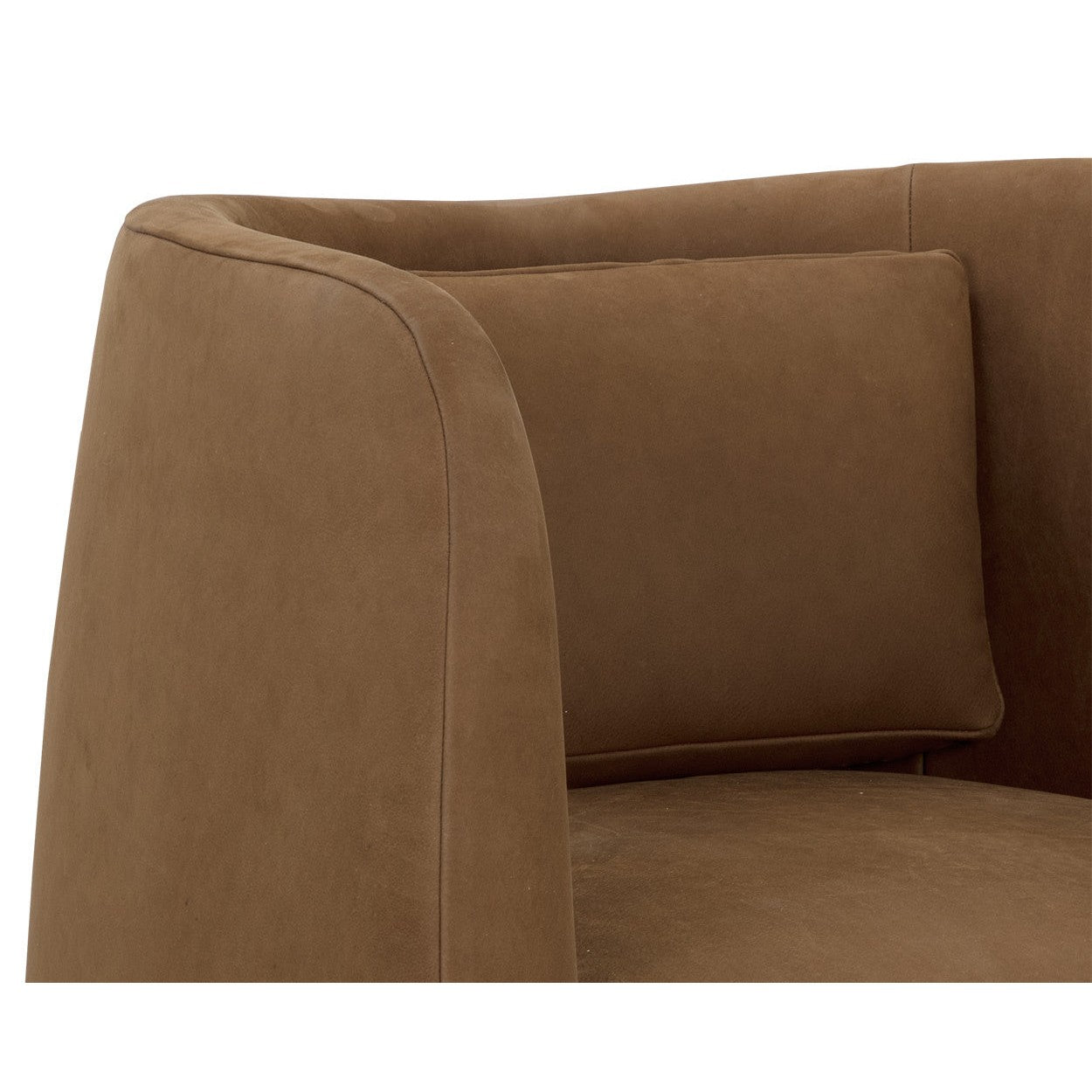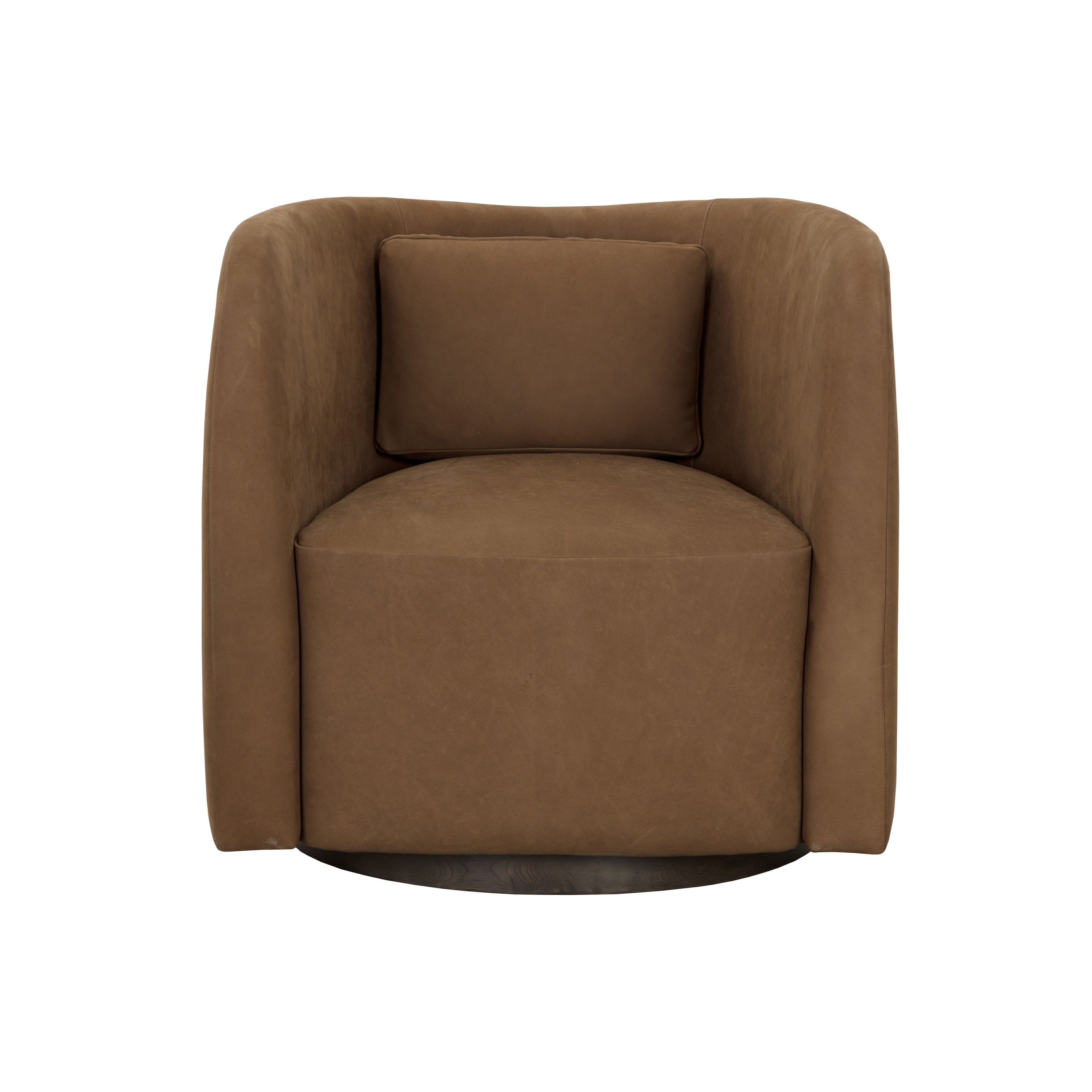 Experience ultimate comfort with the luxurious Emilie Swivel Lounge Chair. Features a well-defined rounded profile fully upholstered in nubuck caramel leather. A brown oak wood swivel base completes the look.