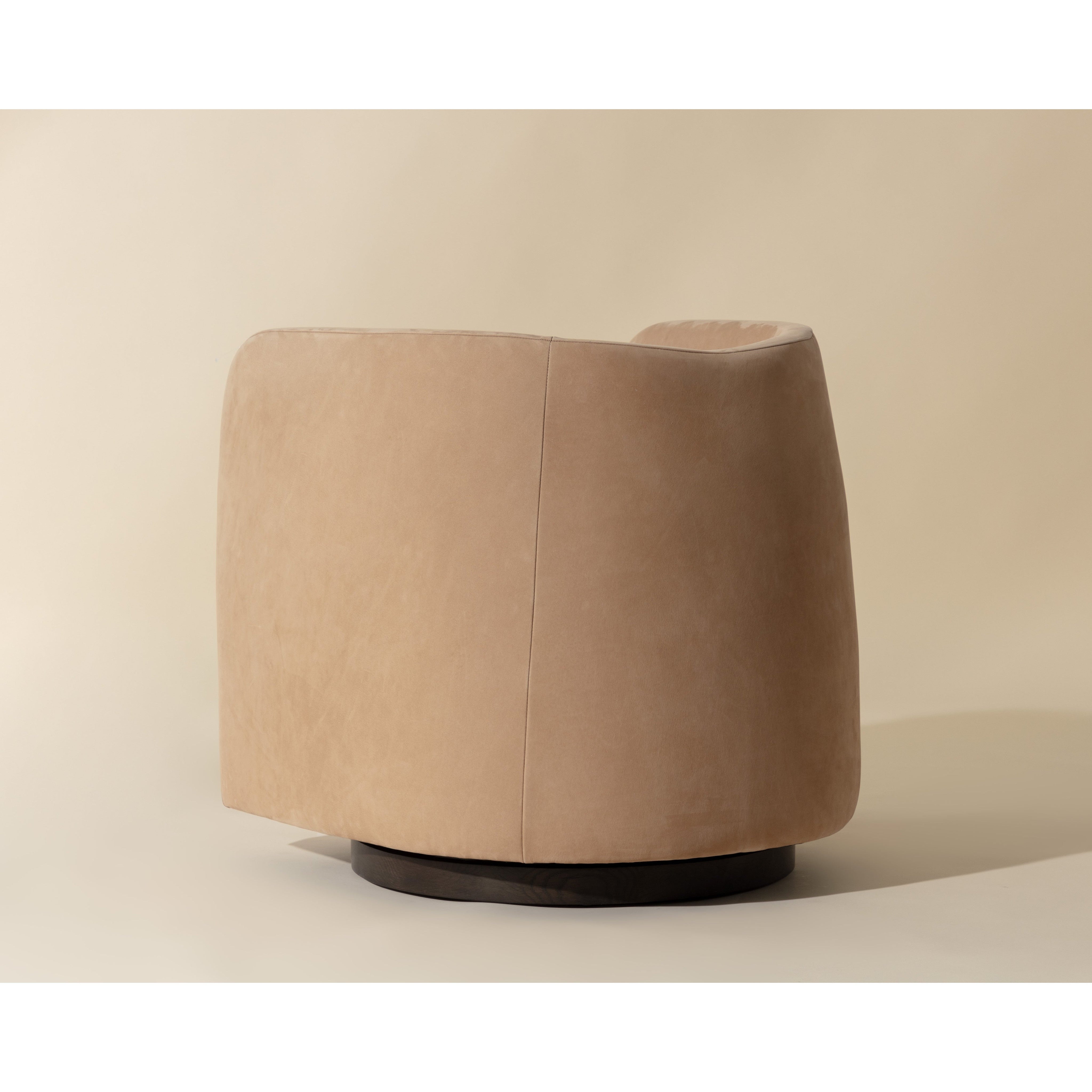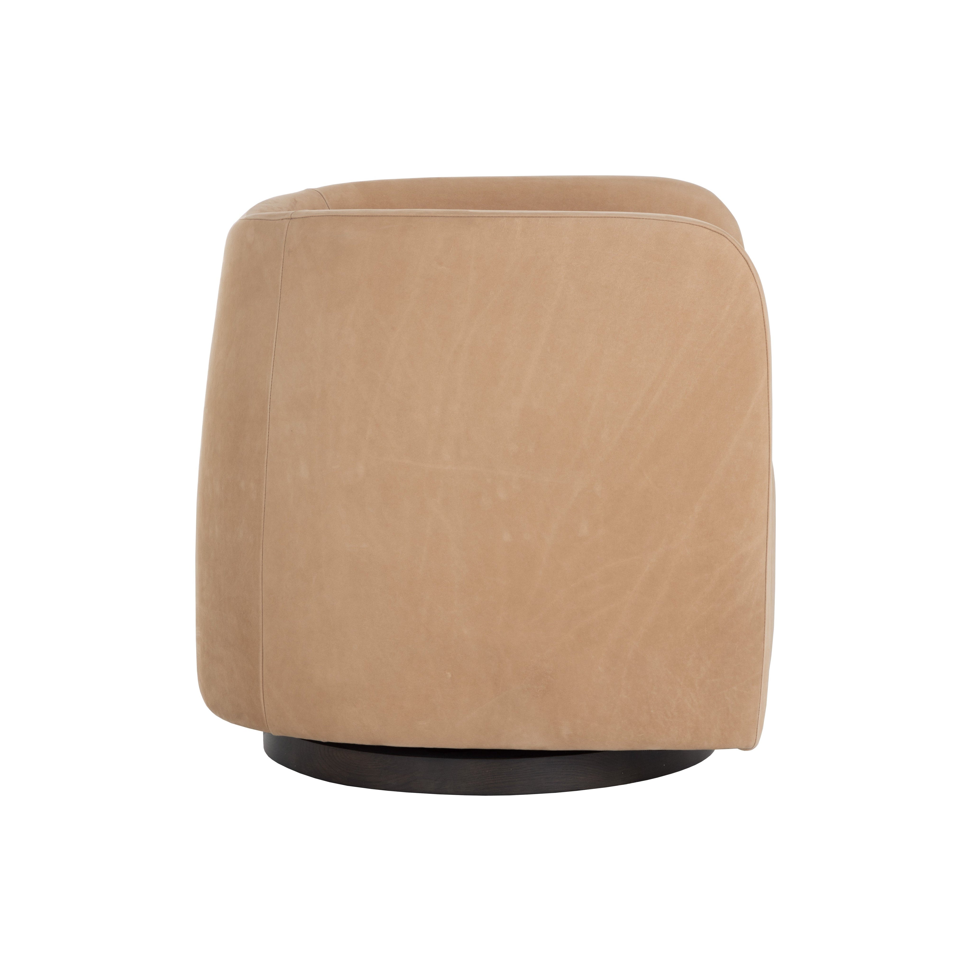 Experience ultimate comfort with the luxurious Emilie Swivel Lounge Chair. Features a well-defined rounded profile fully upholstered in nubuck tan leather. A brown oak wood swivel base completes the look.