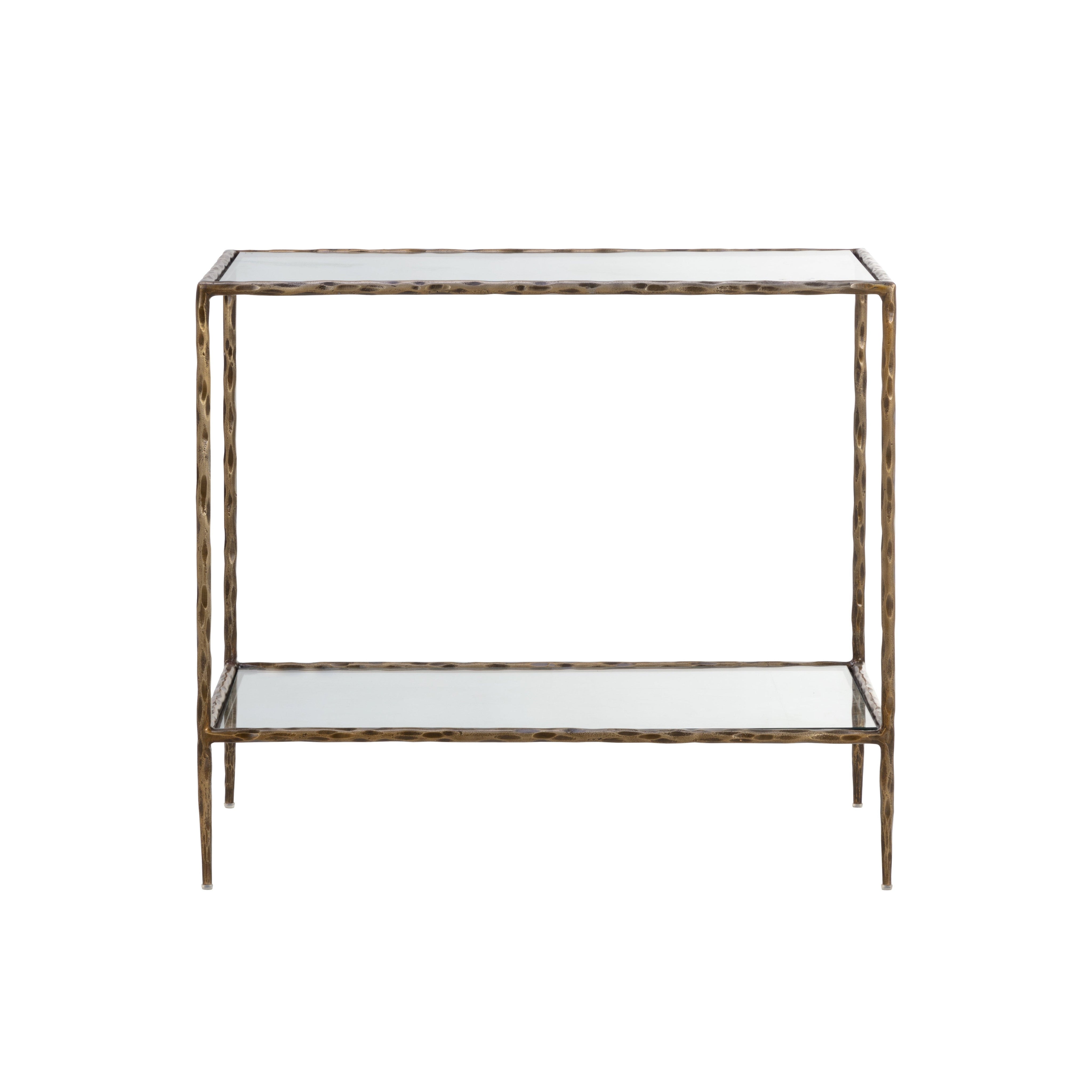 The Emine Nightstand shines a spotlight on the rustic beauty of hand-hammered metal. Crafted by artisans in India, this nightstand features an antique brass iron frame with a tempered glass top and shelf. Made in India. With refined craftsmanship, this design was brought to life by skilled local artisans. Due to the nature of handcraftsmanship, unique imperfections such as fissures, markings and variations in colour and shape are welcomed and appreciated characteristics for a truly one-of-a-kind piece.