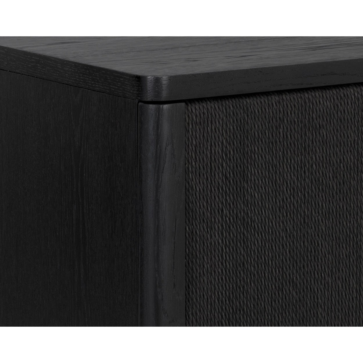 The Etienne Nightstand boasts a linear profile with a moody design. Constructed from a black oak veneer with solid black oak wood legs and a matching rope covering on the doors. Antique brass aluminium handles complement the piece. As wood is an organic, porous material, these pieces will contain natural variation of texture and may also exhibit fine indentations and cracks. Wood pieces will also display a disparity of colour and grain, and visible knots and burls that add to the character of each piece.