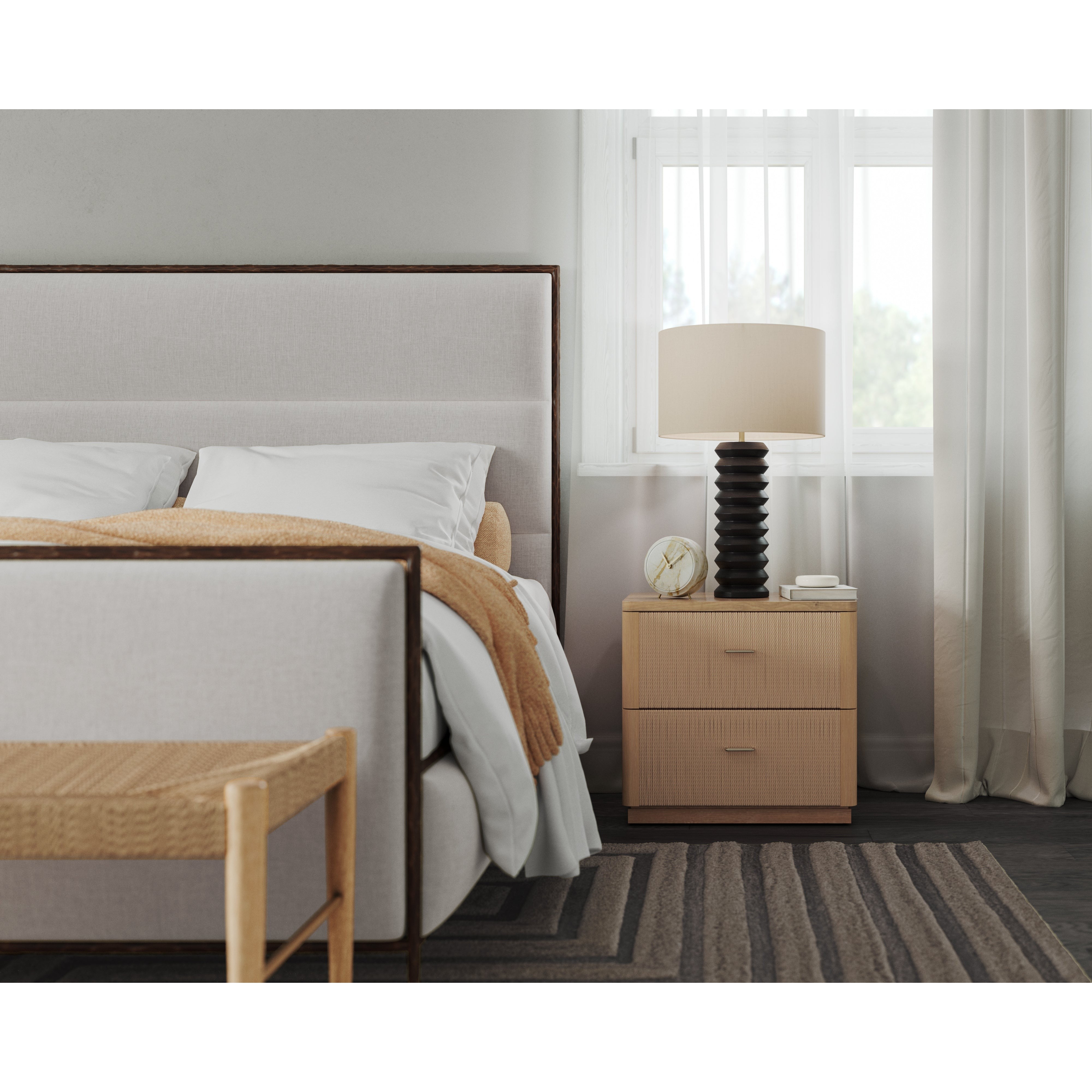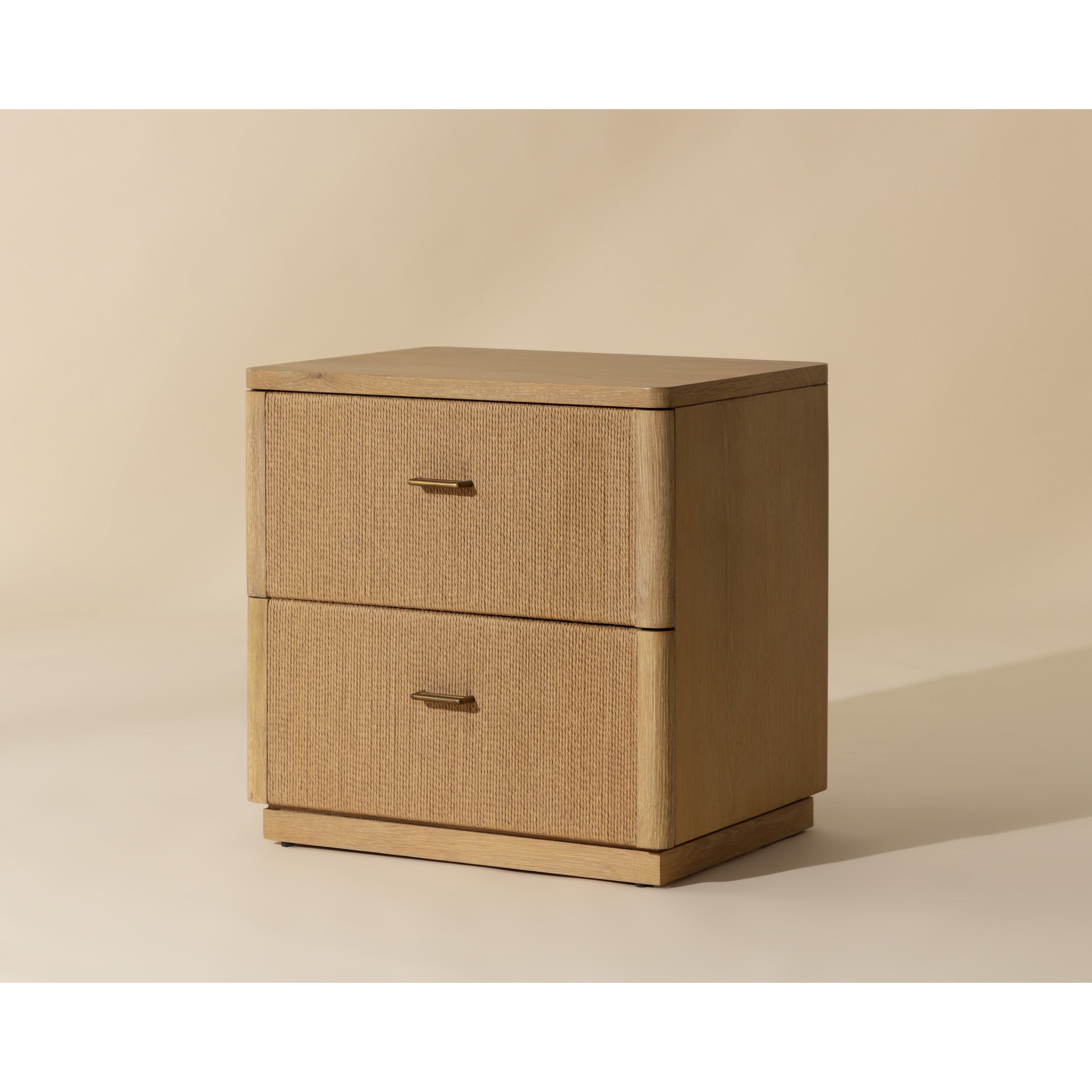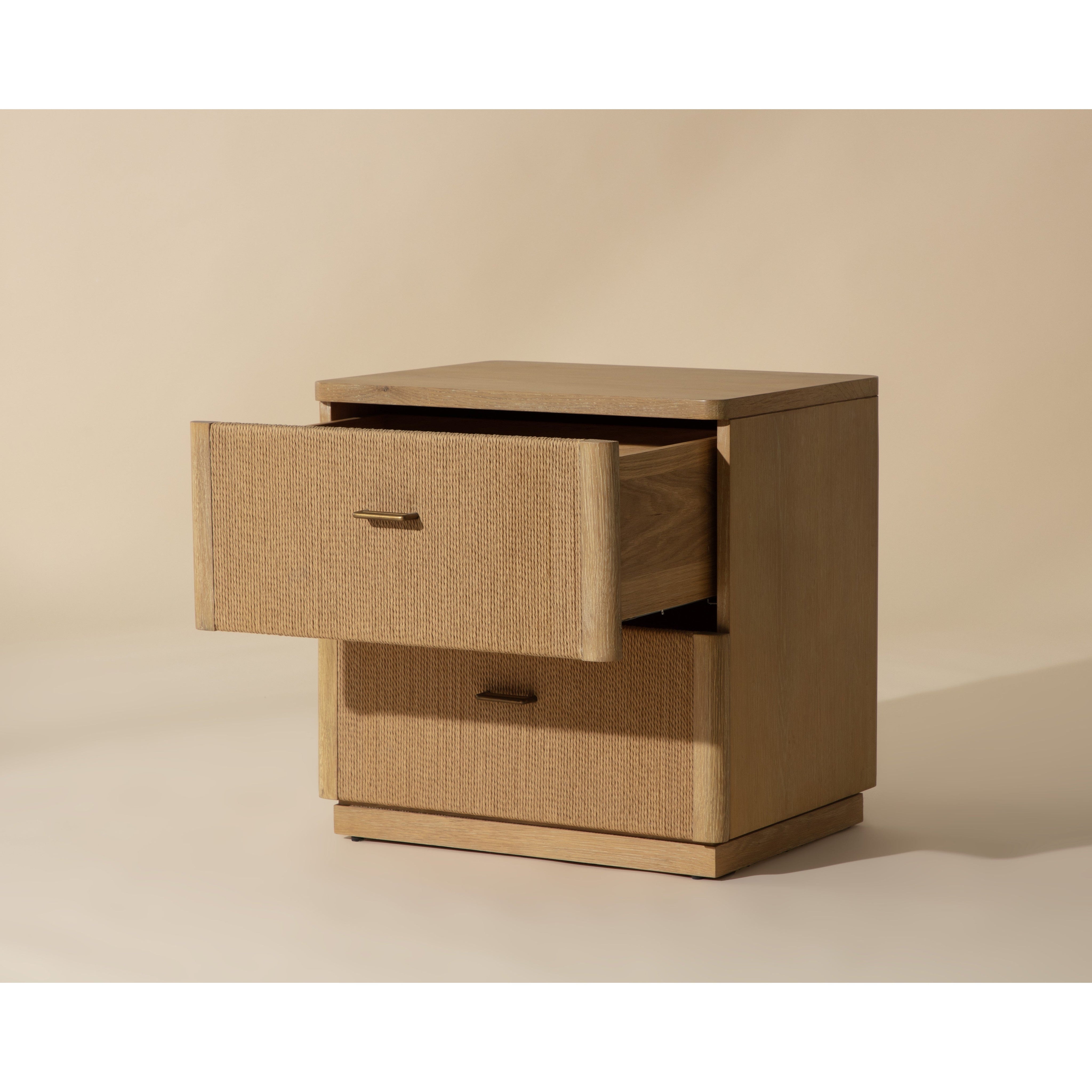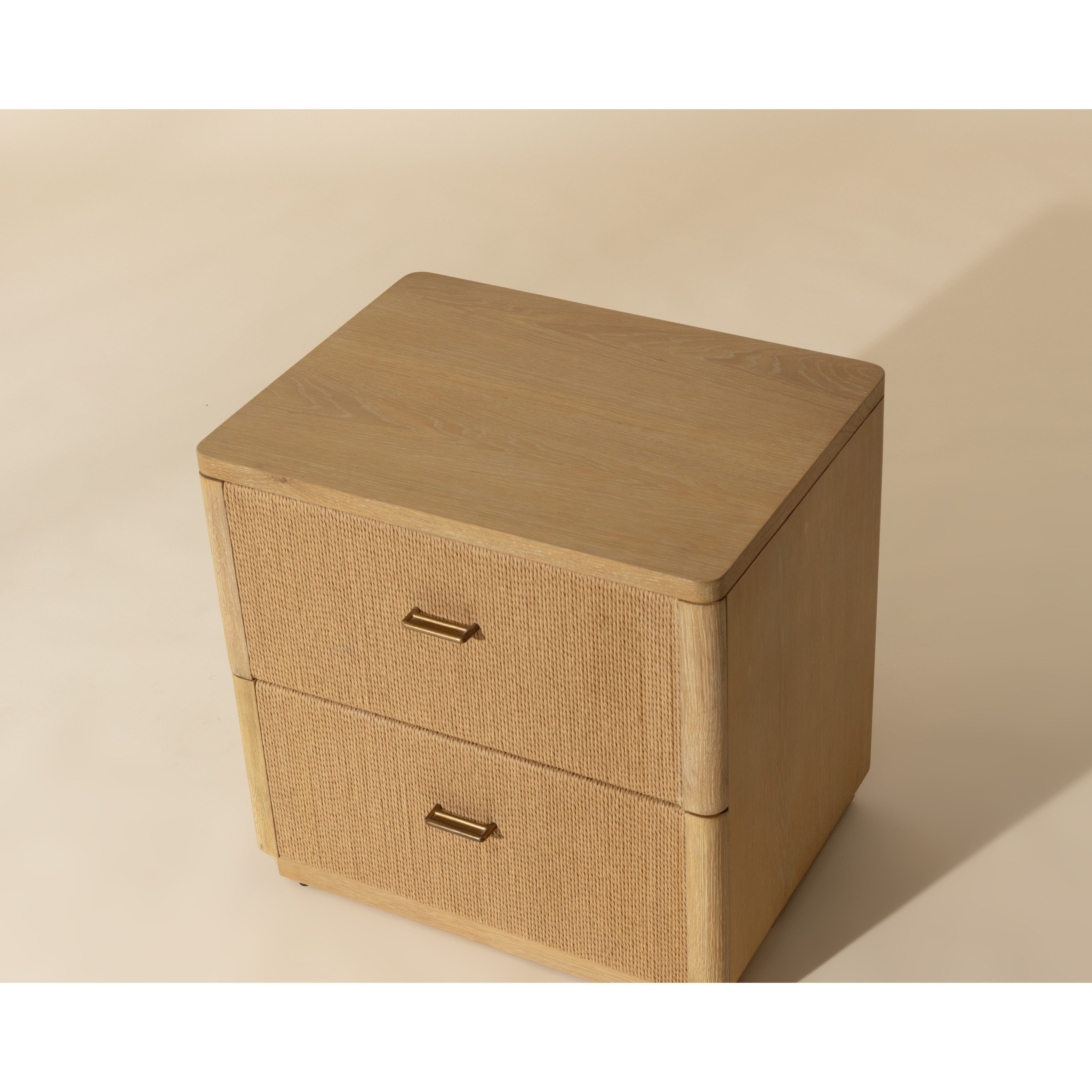 The Etienne Nightstand boasts a linear profile with a warm design. Constructed from a rustic oak veneer with solid oak wood legs and a matching rope covering on the doors. Antique brass handles complement the piece. As wood is an organic, porous material, these pieces will contain natural variation of texture and may also exhibit fine indentations and cracks. Wood pieces will also display a disparity of colour and grain, and visible knots and burls that add to the character of each piece.