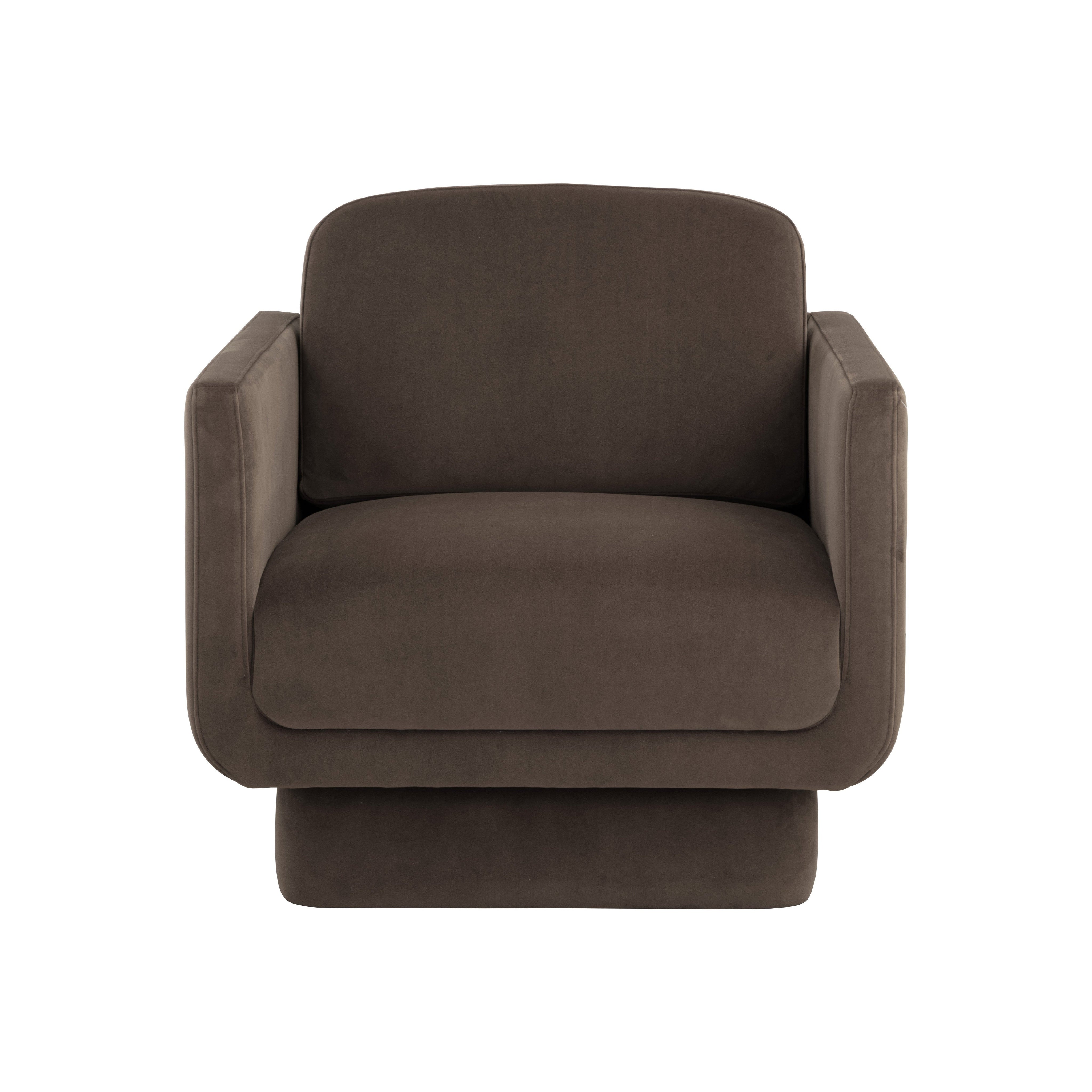 The Everton Lounge Chair exudes classic comfort. Features U-shaped arms with rounded edges that sit atop a square base to give the chair a floating appearance. Fully upholstered in a smooth meg dark brown fabric. Also available in meg taupe and rust fabrics.