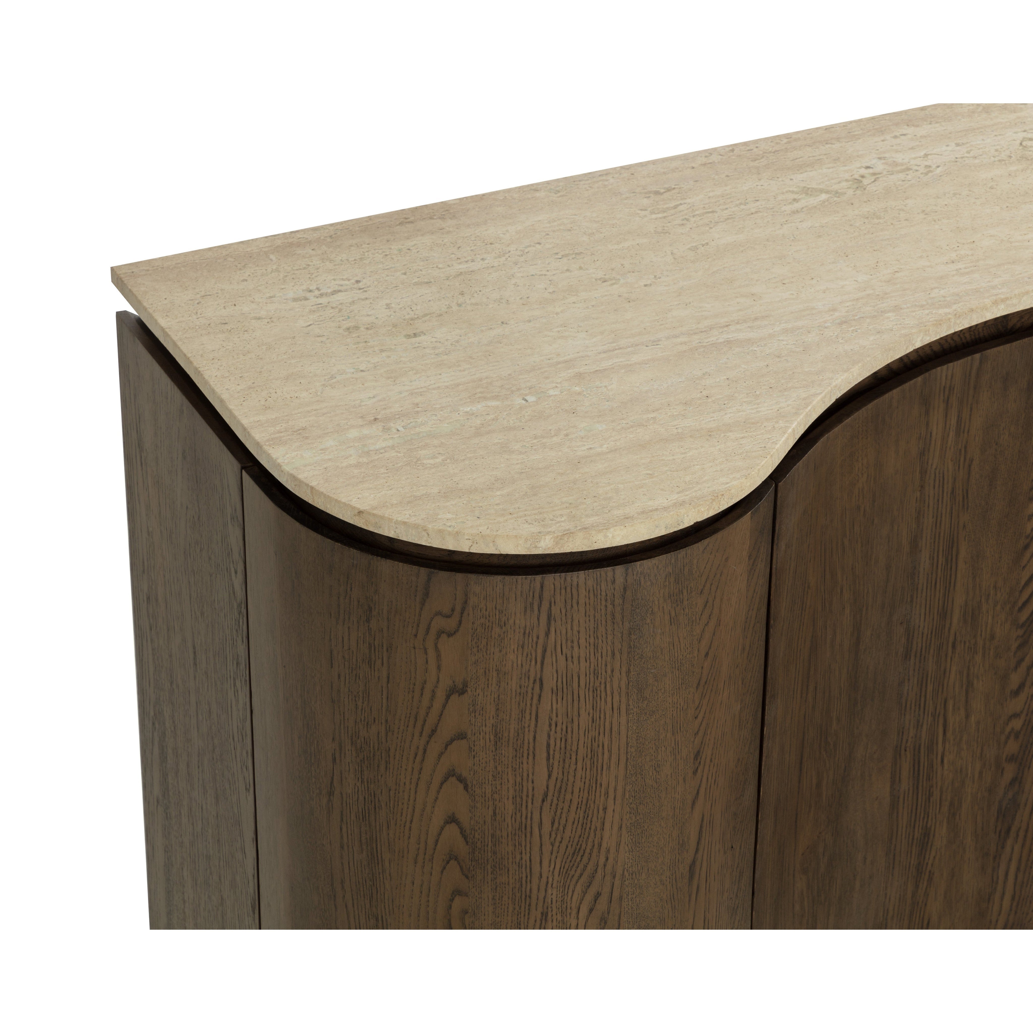 Meticulously crafted with a sinuous silhouette and seamless functionality, the Fable Sideboard will surely make a statement. Its gently curved form is crafted from richly grained solid oak wood and crowned with a travertine top that brings an organic contrast in tone and texture.