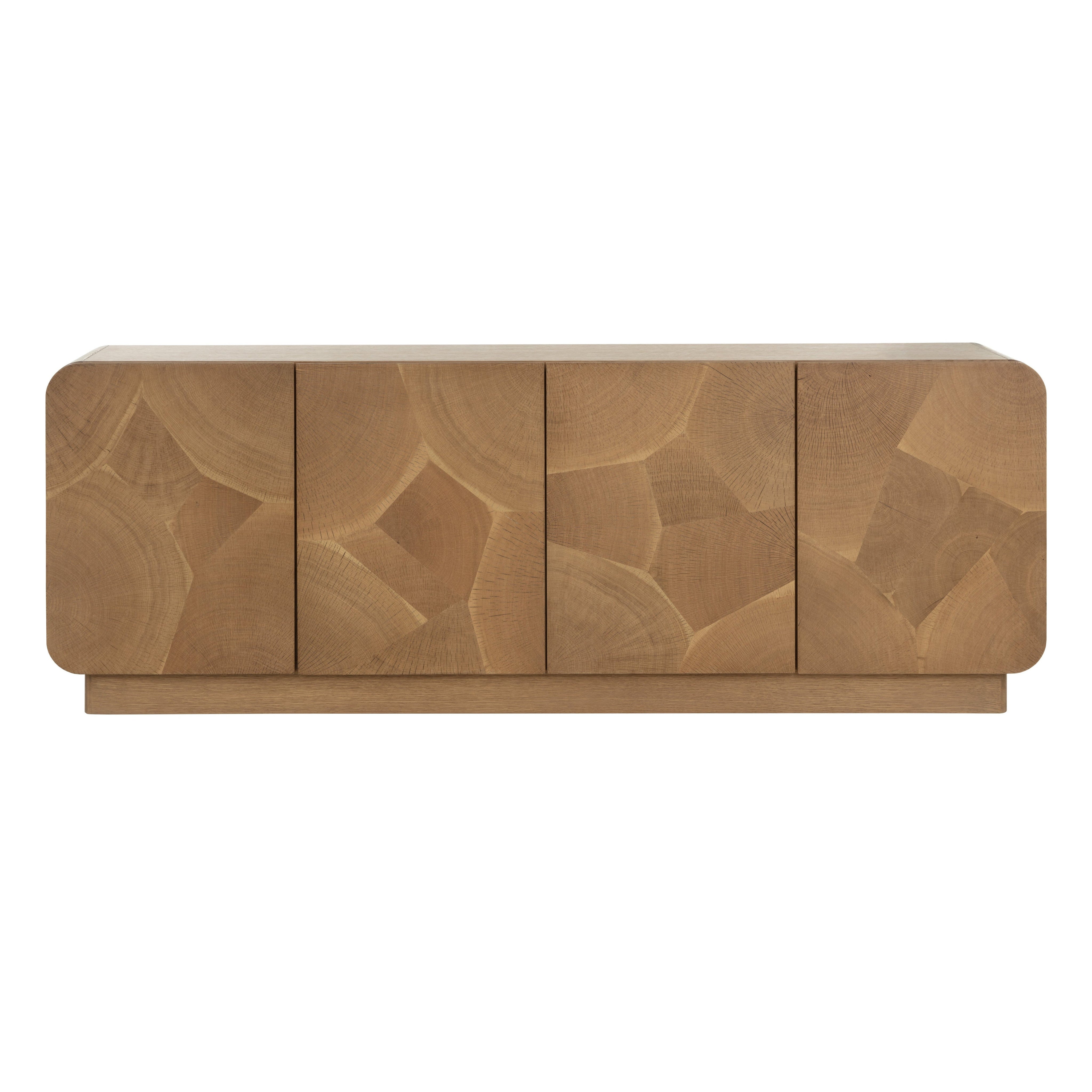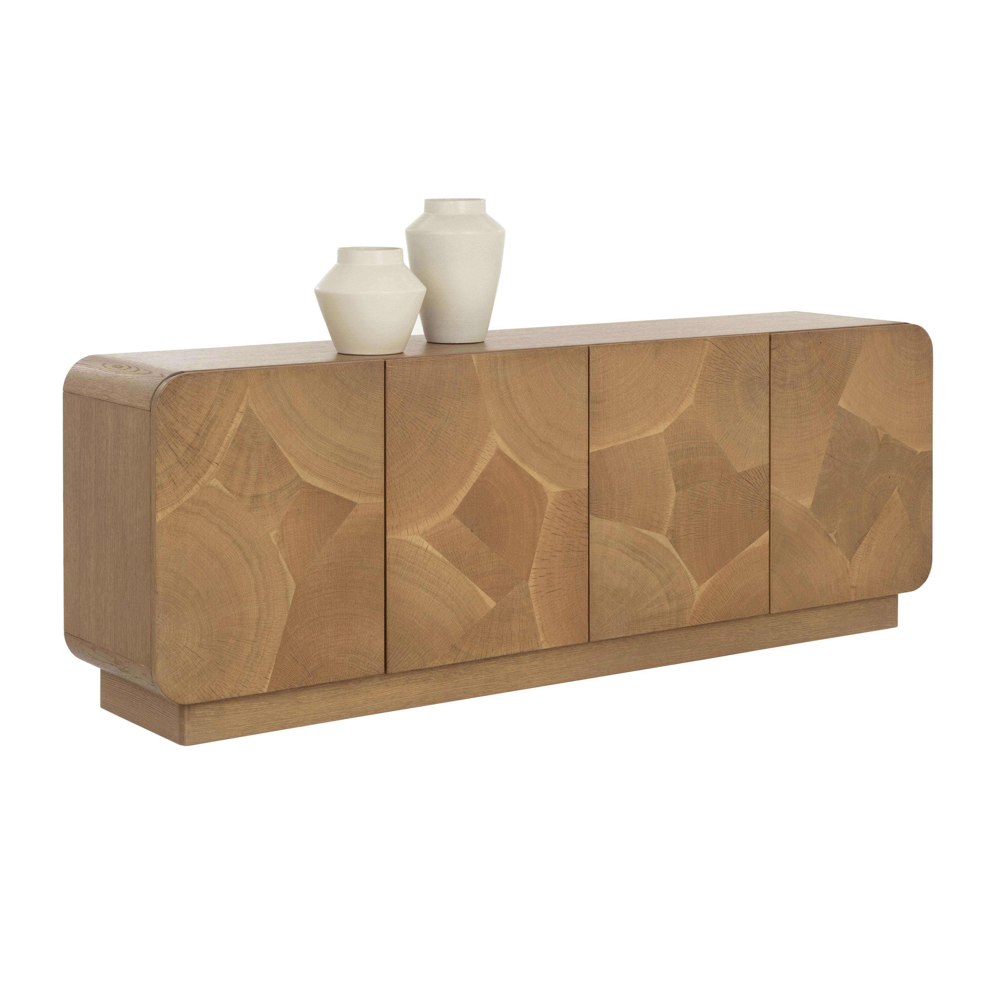 Magnificently crafted from solid oak wood, the Fauna Sideboard is an earthy delight. A stunning mosaic of oyster-cut oak veneer is beautifully pieced together on the cabinet fronts to create a distinct, eye-catching pattern.