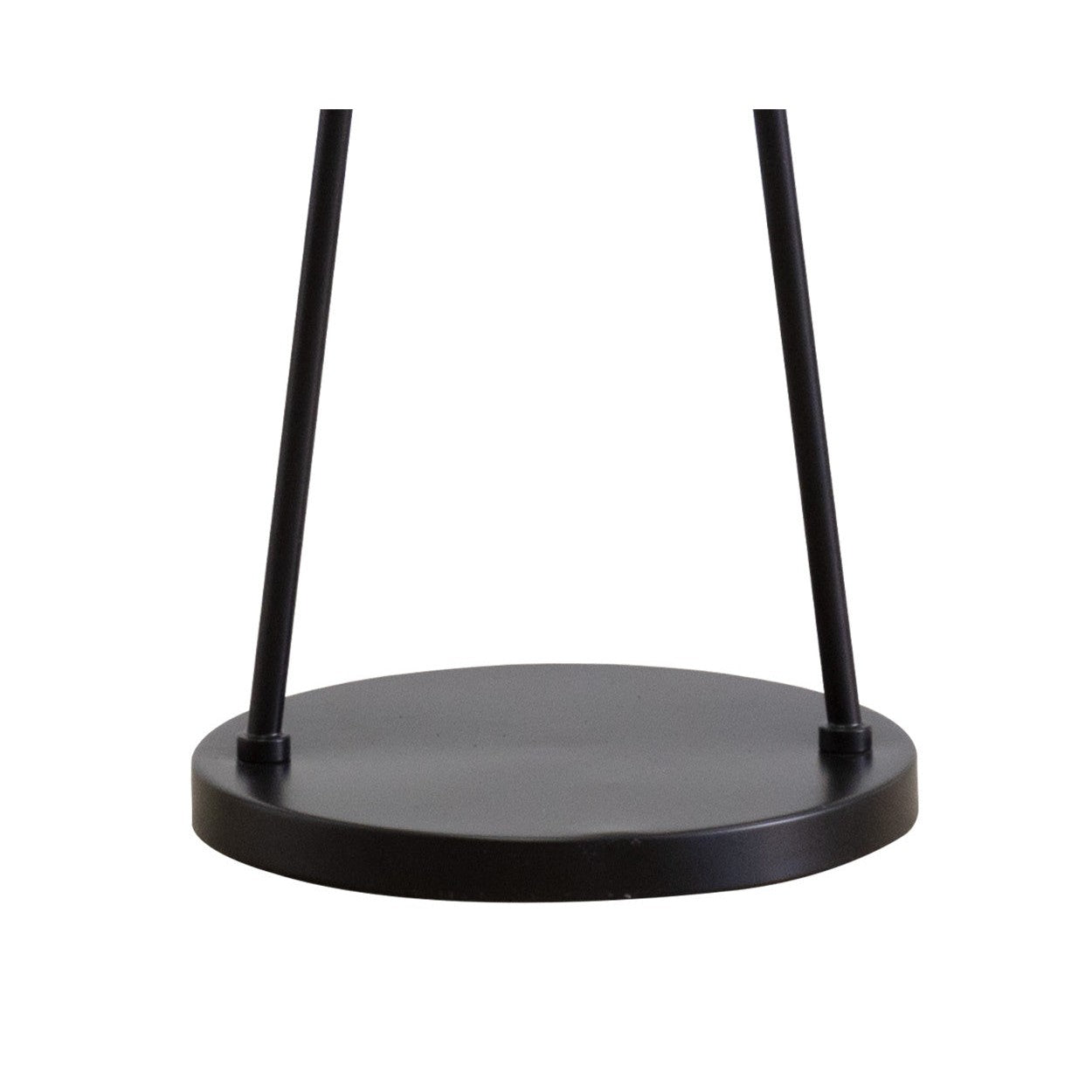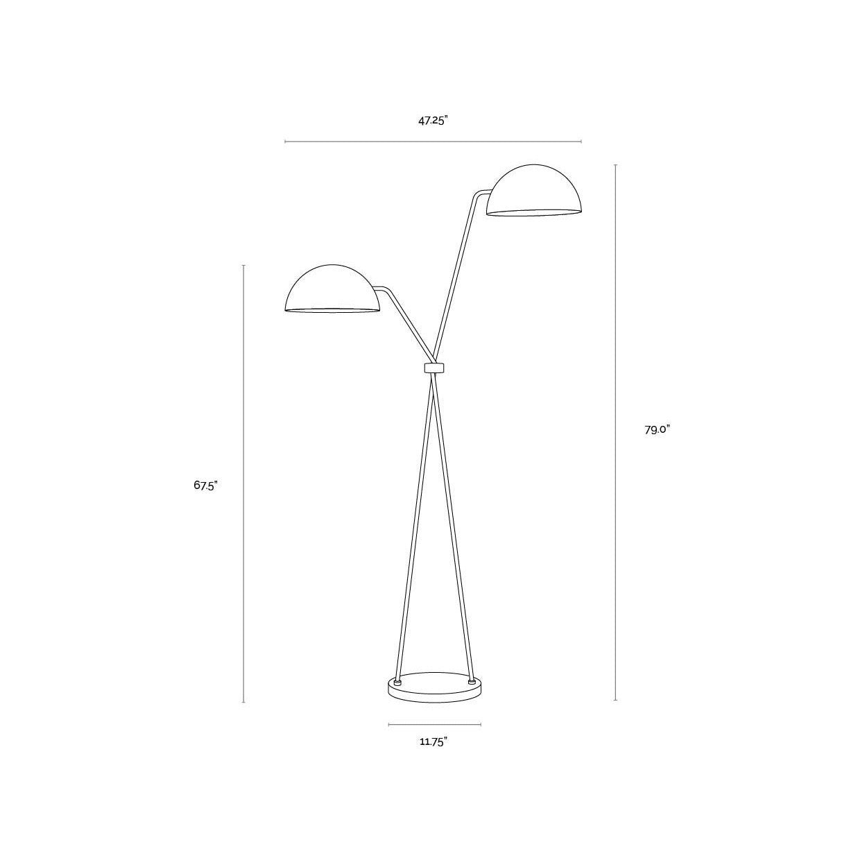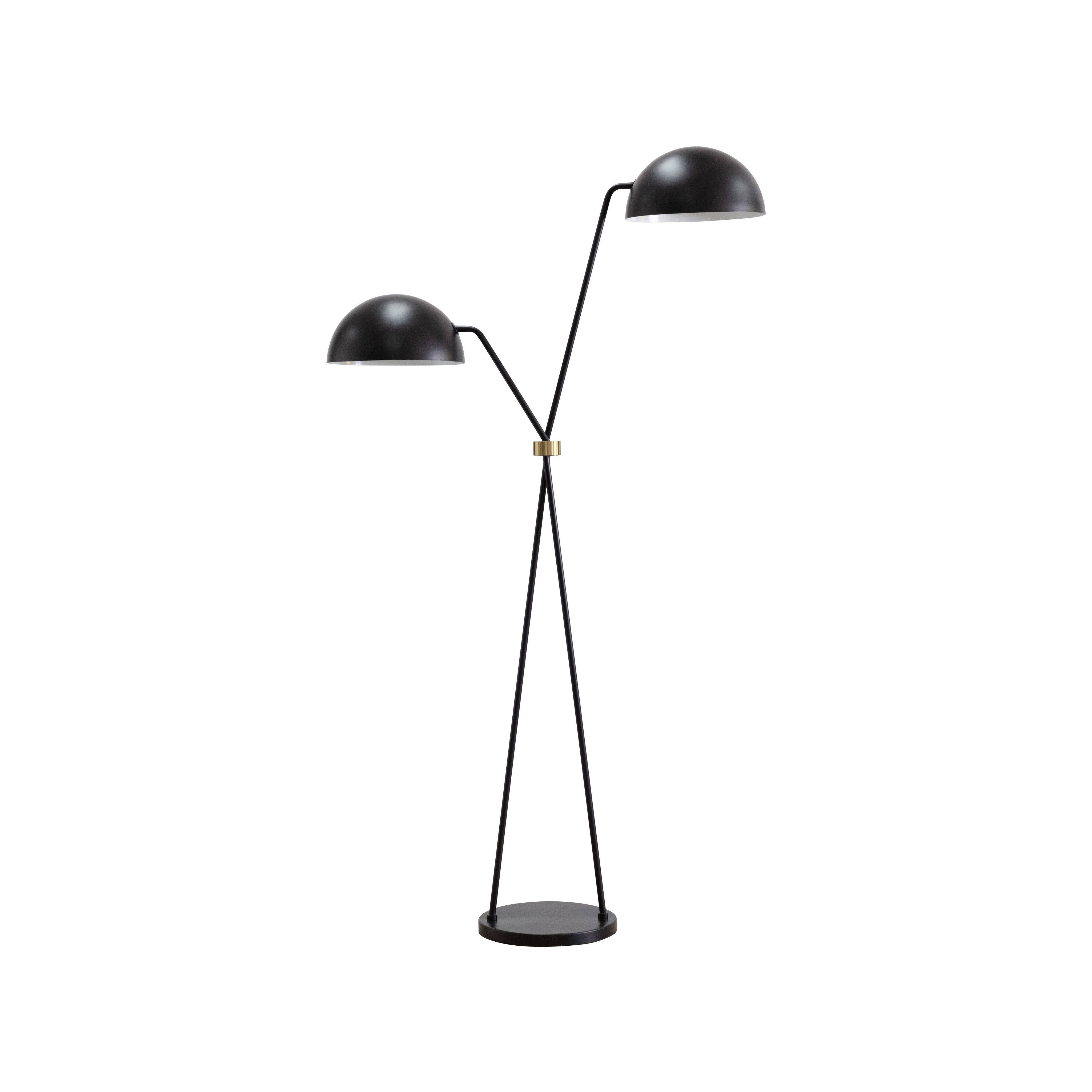 Modern illumination is defined in this dual-domed floor lamp. Features a sturdy powder-coated black iron base with two sleek poles of varying heights crossed together with a brass iron ring. Black lamp shades complete the look.