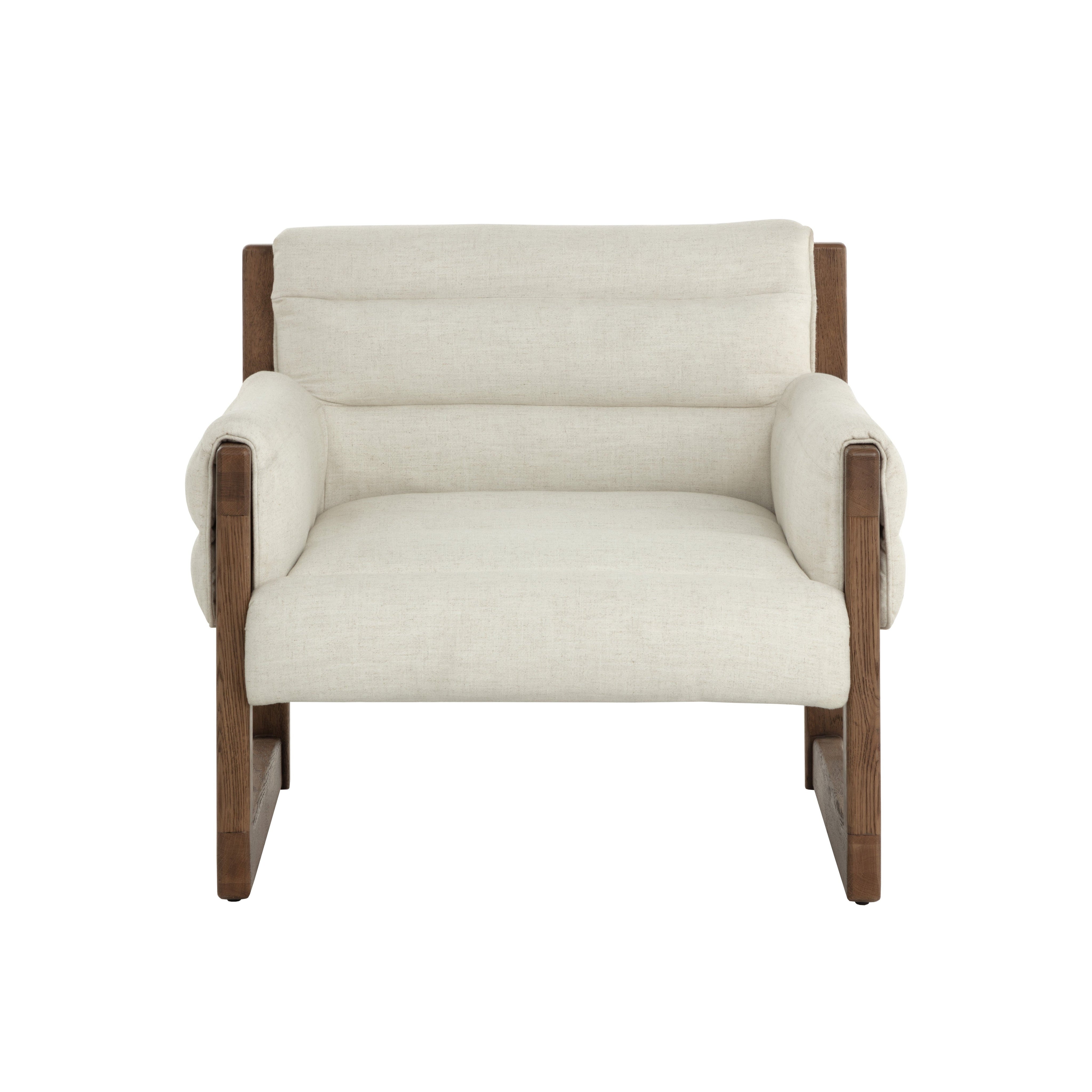 Beautiful and stylish, the Ferguson Lounge Chair is sure to impress. Nestled within a warm brown oak wood frame are channel tufted cushions upholstered in geralt linen performance fabric, making the most of its lavish yet cozy appearance. Matching channel tufted padding wraps over the armrests to embrace guests in a beacon of luxurious comfort.
